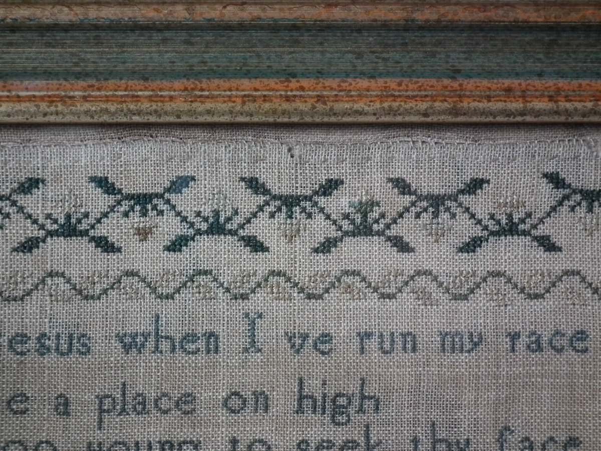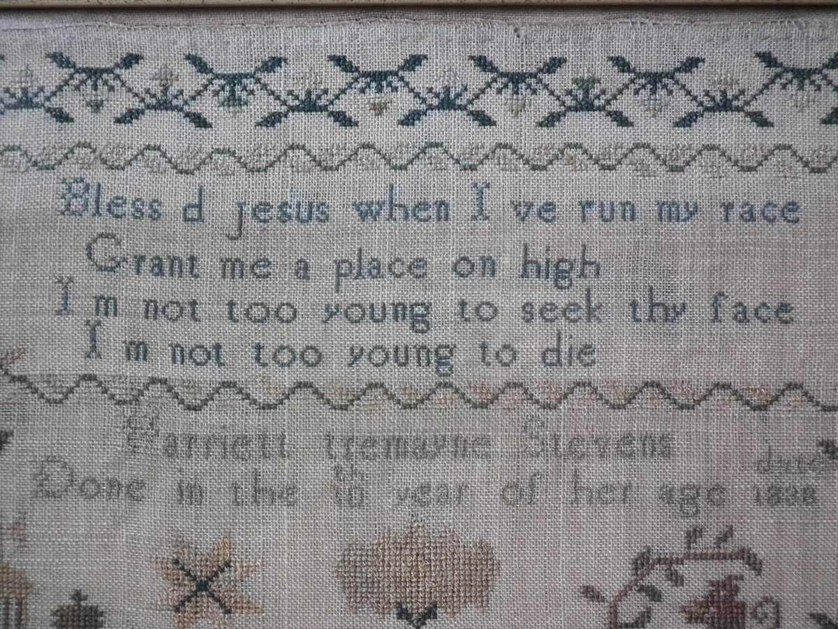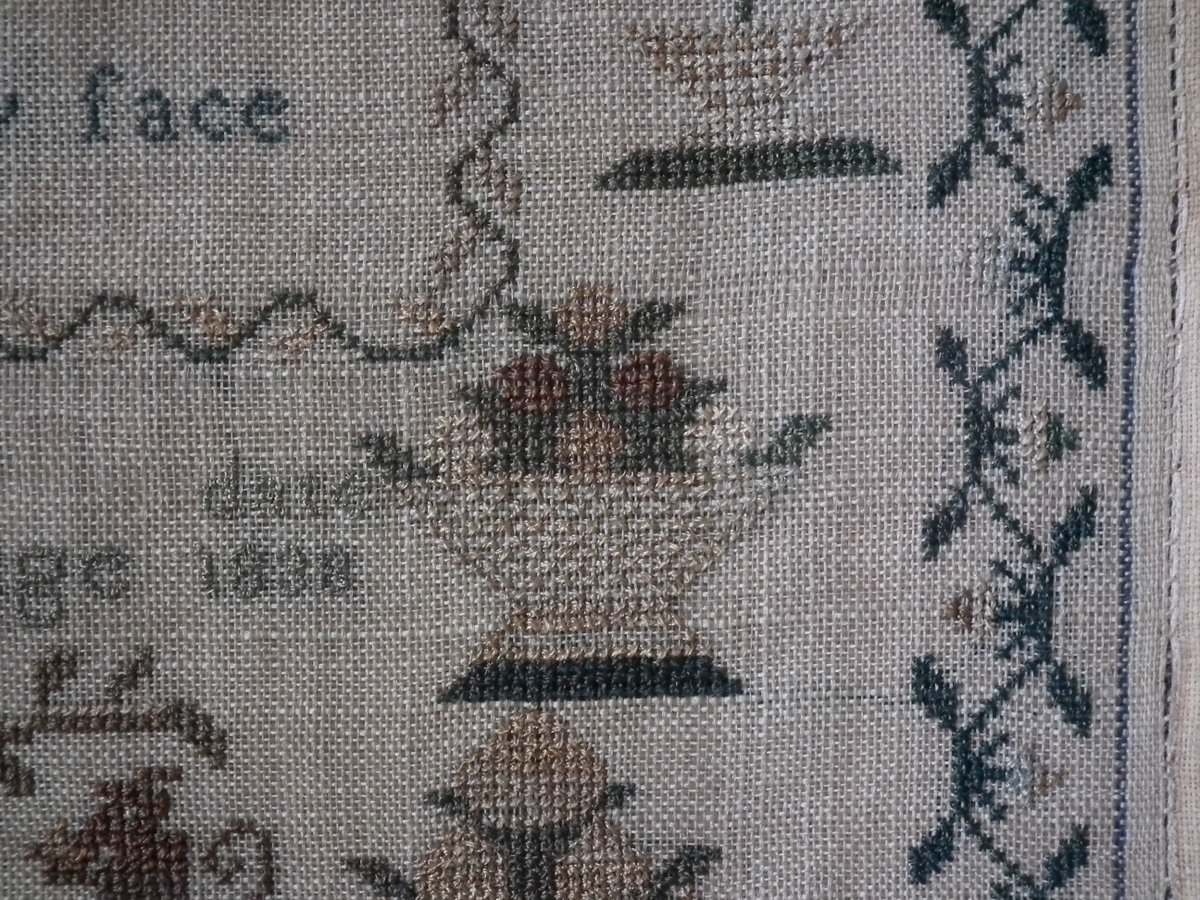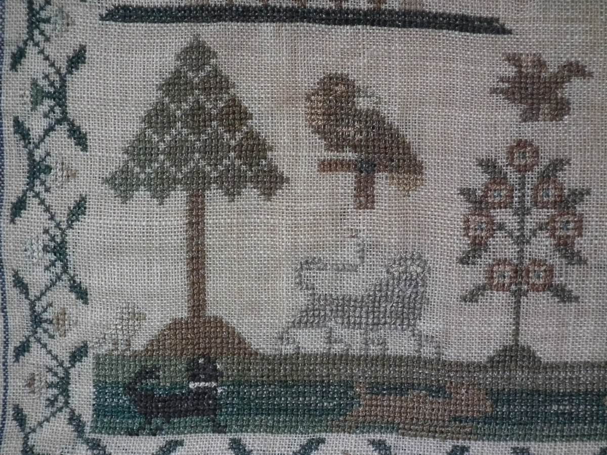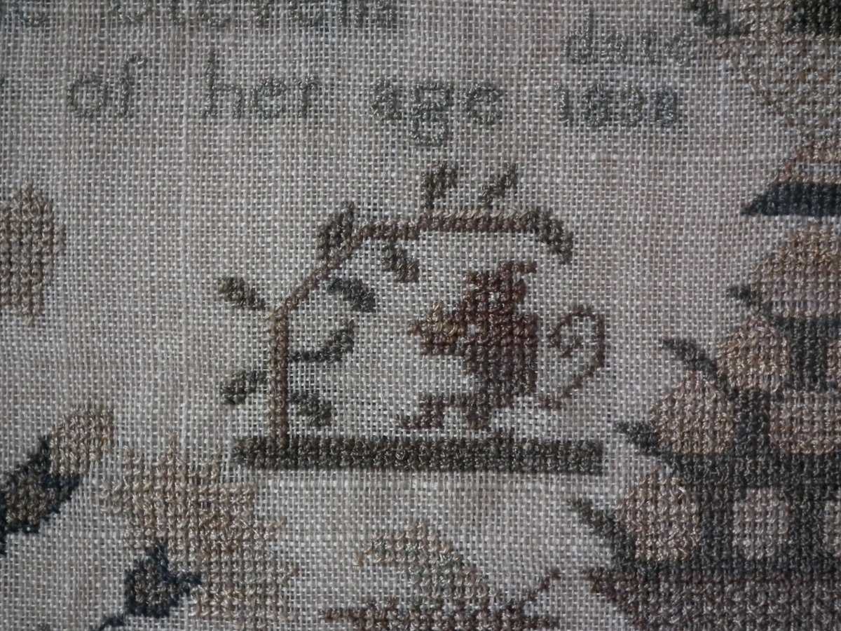 The sampler is worked in silk on linen ground.