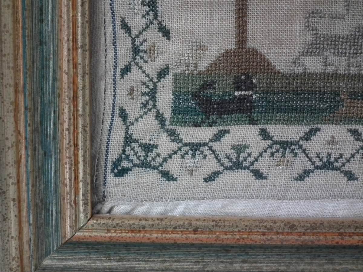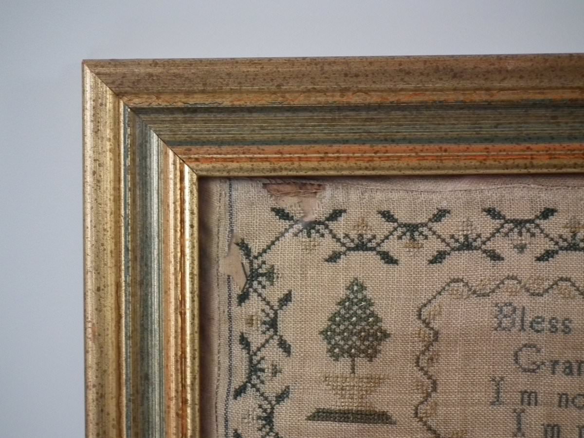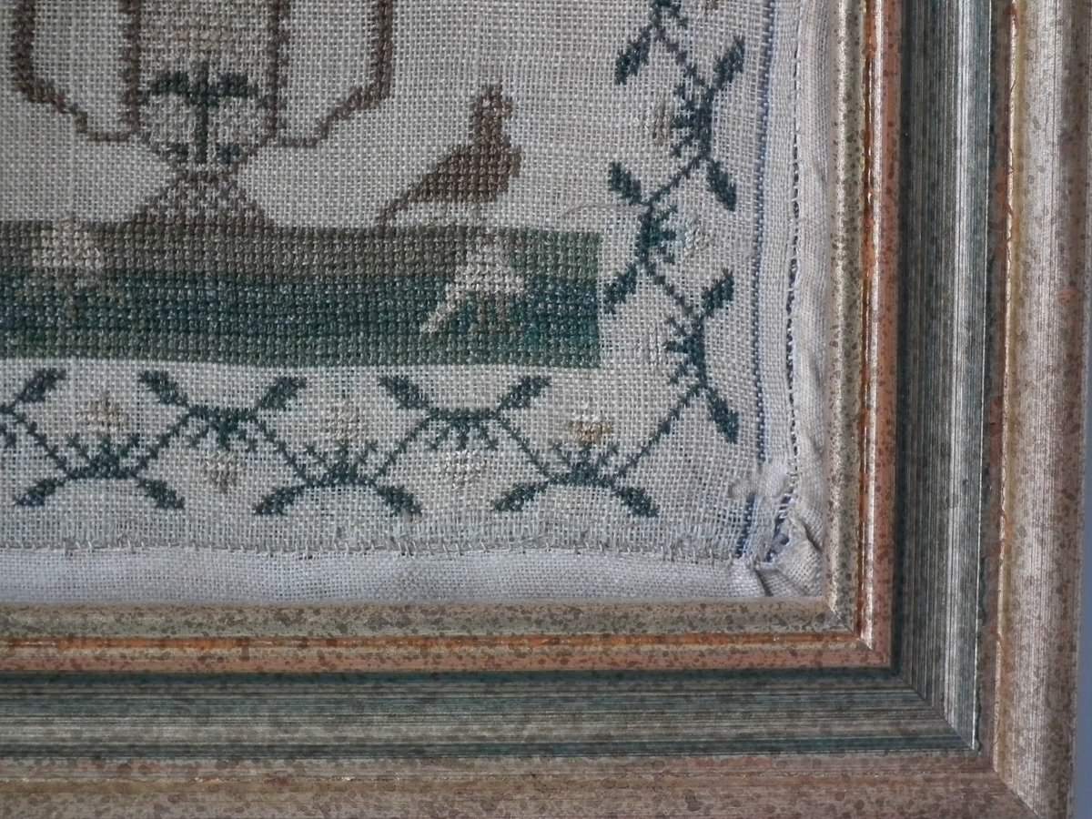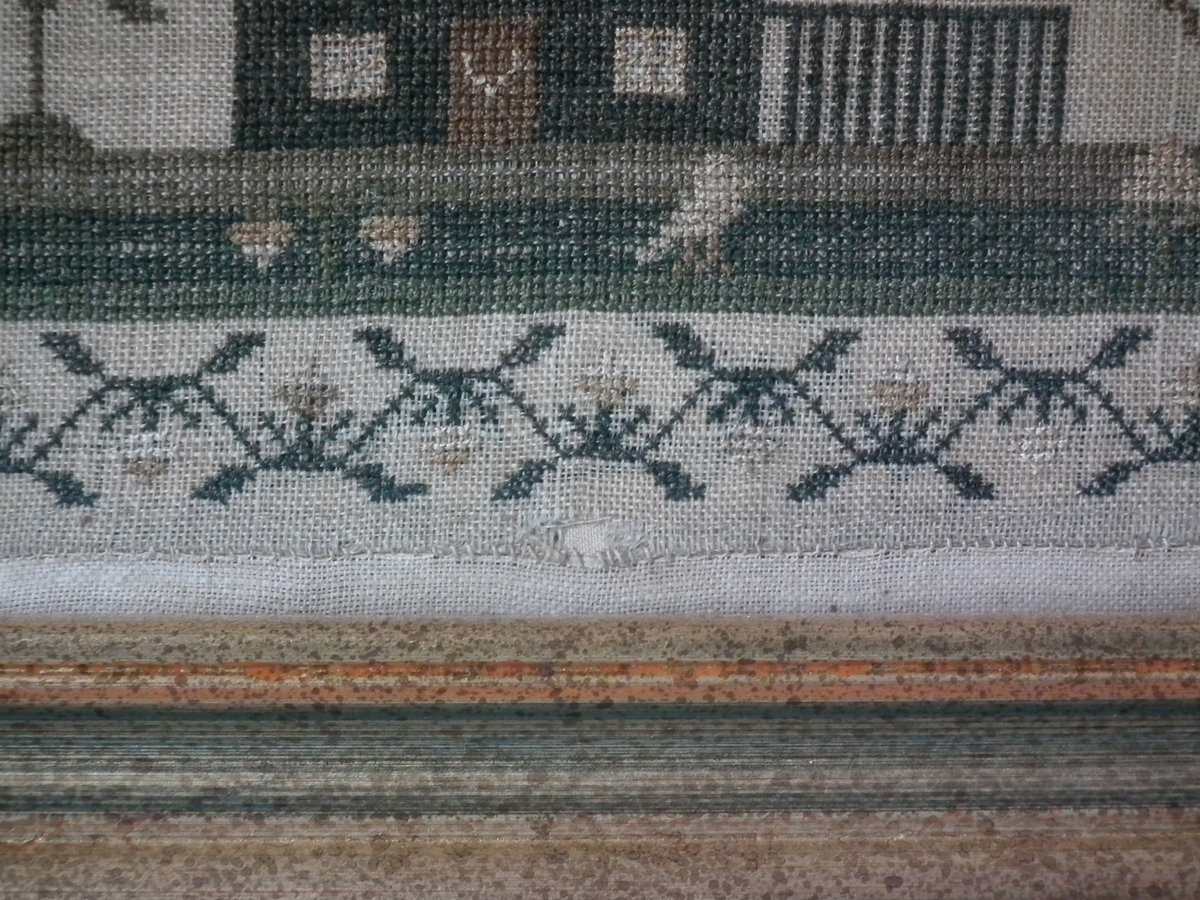 Mounting: The sampler is stitched to linen. Frame backed with card.