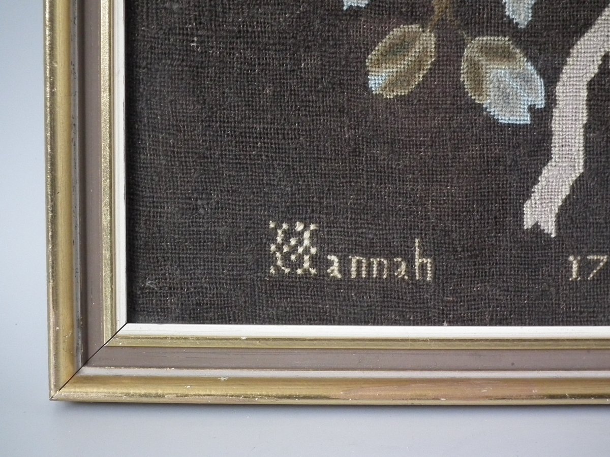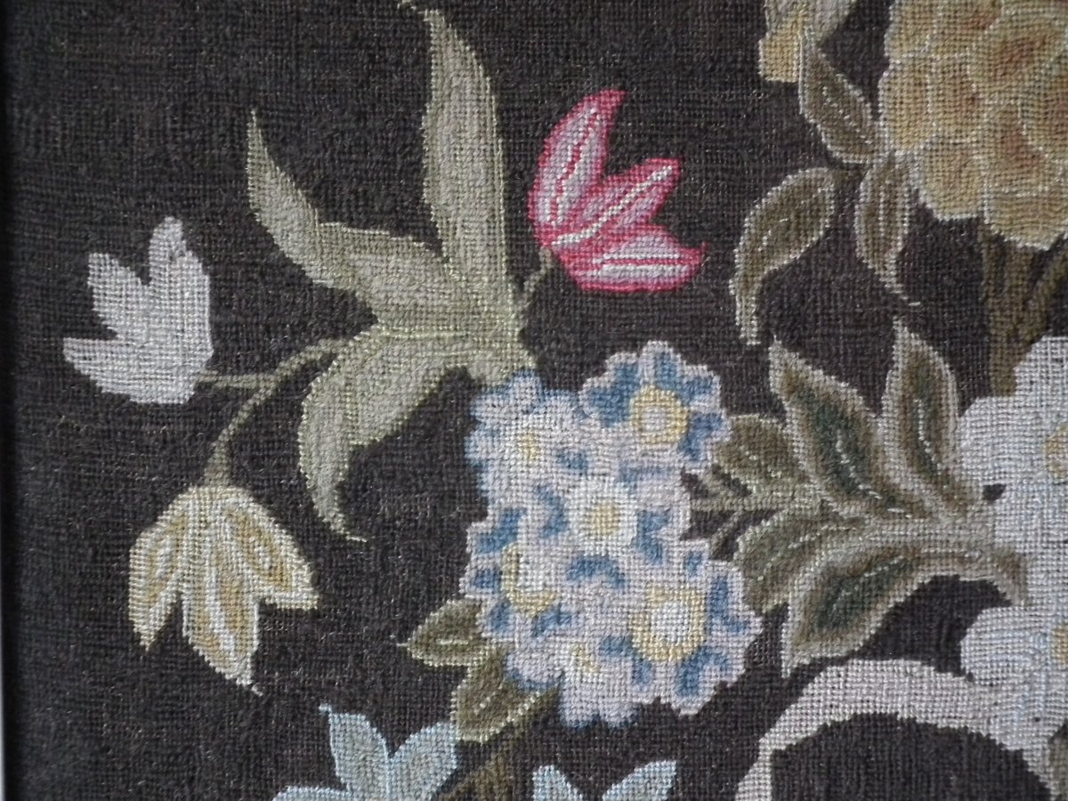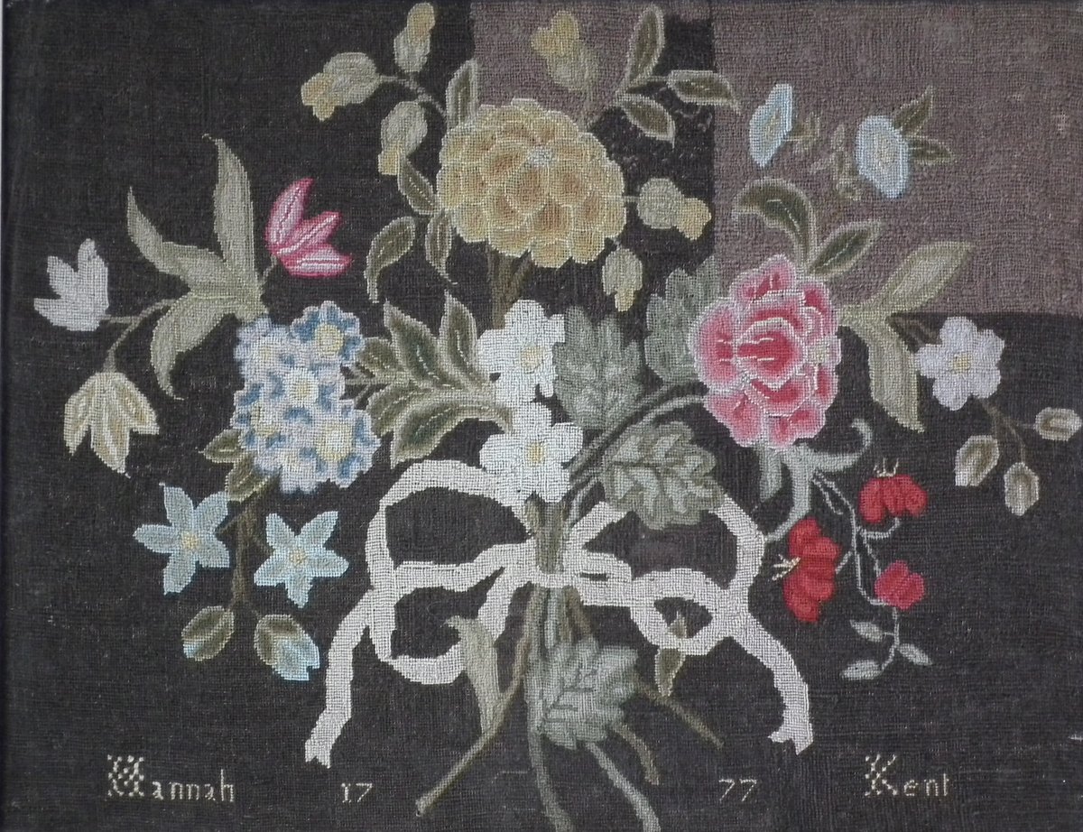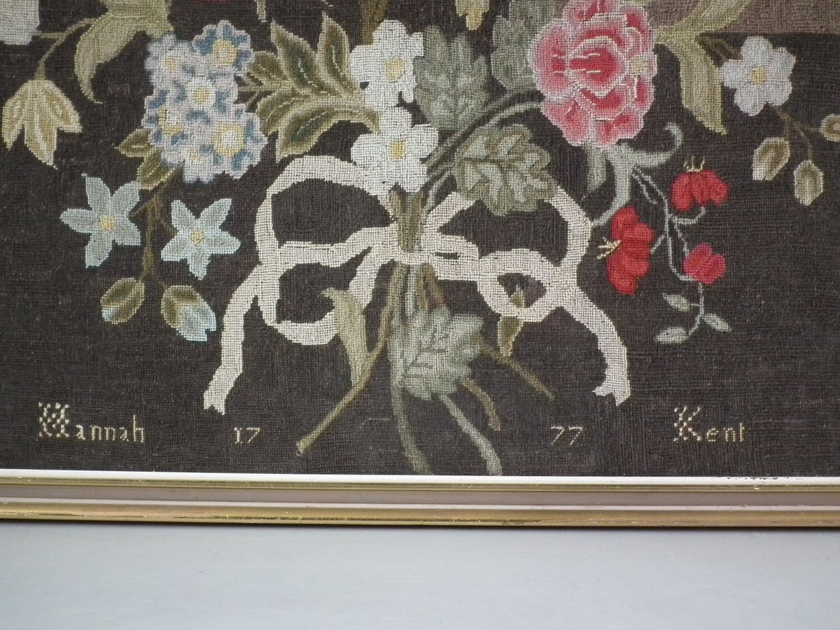 George III, dated 1777. 12.2ins high, 15.4ins wide, 0.8ins deep. 1777 Floral Bouquet Embroidery by Hannah Kent.