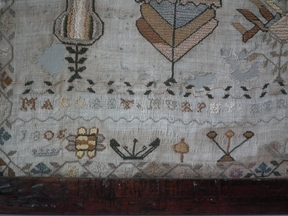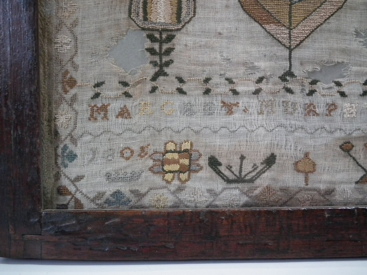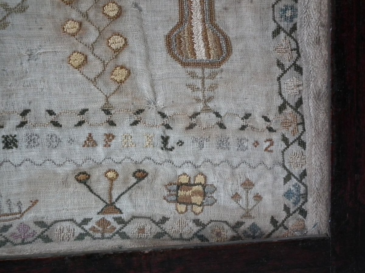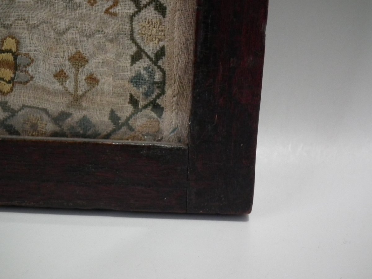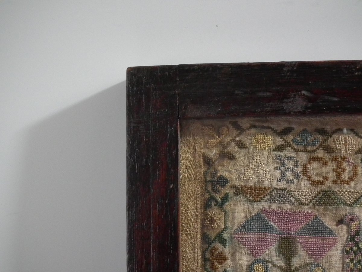 Framed in an old wood frame with glass. Mounting: The sampler is fixed to board. Frame backed with card.