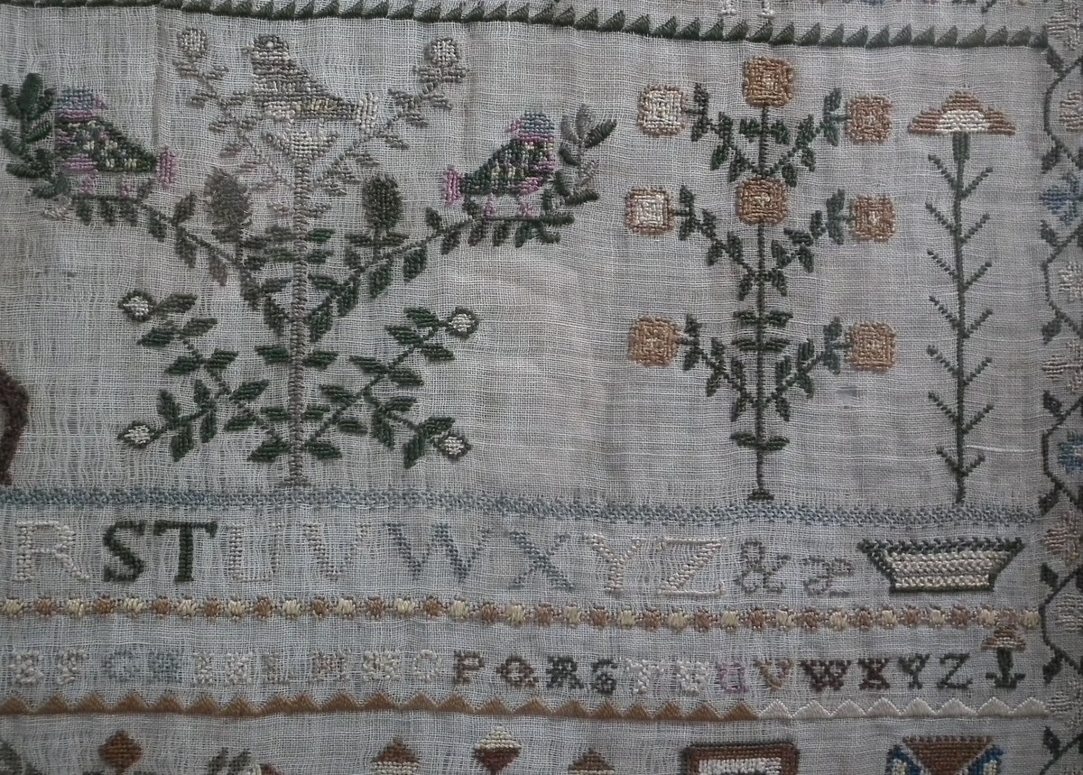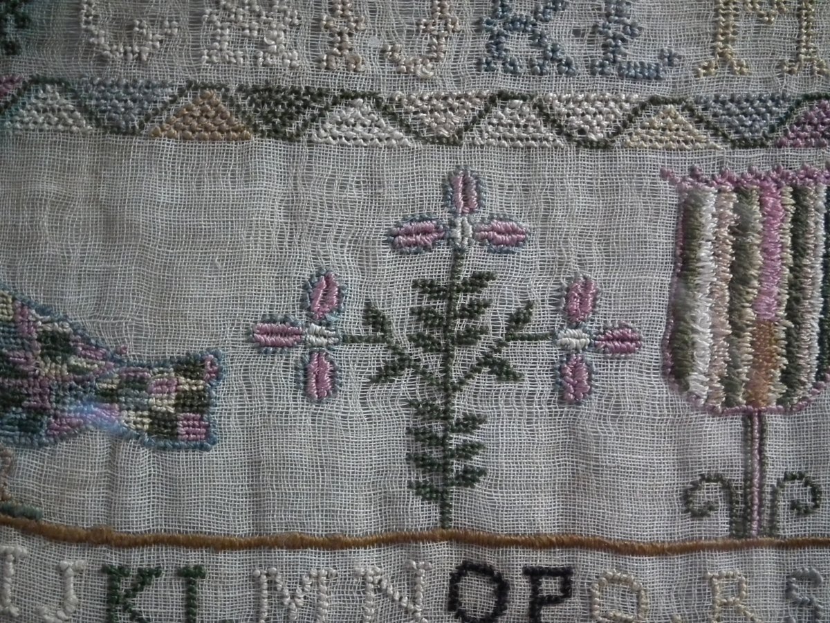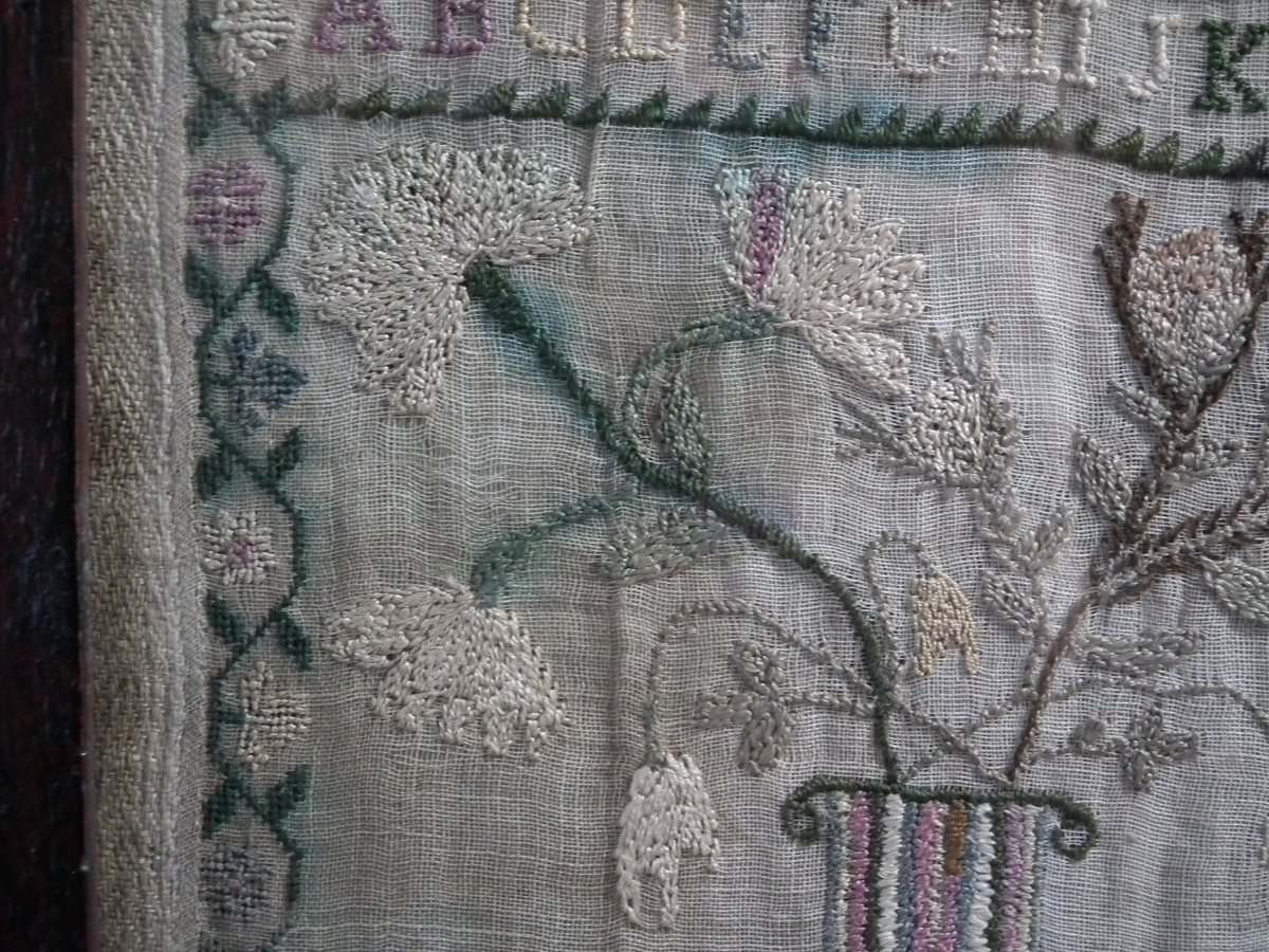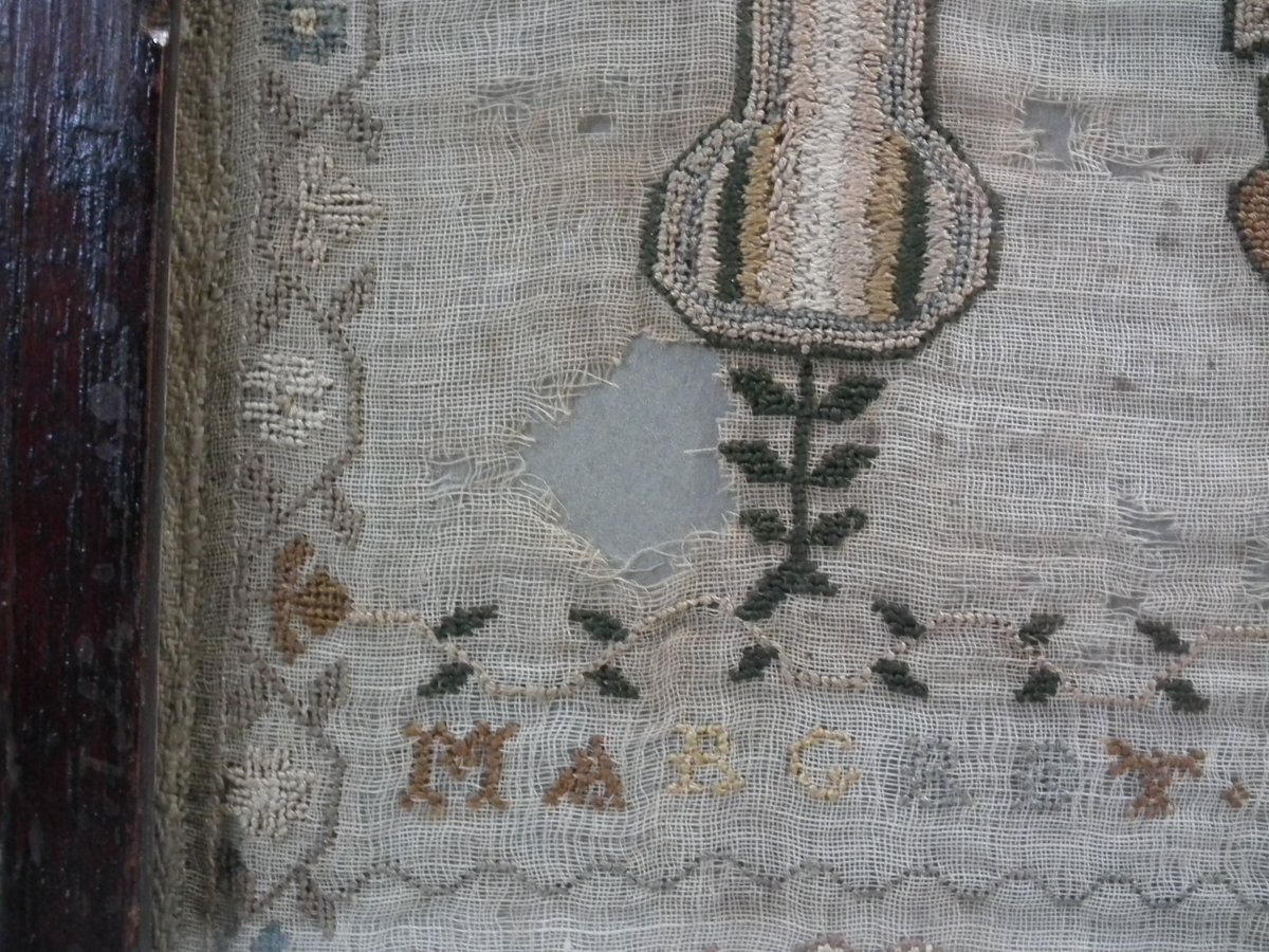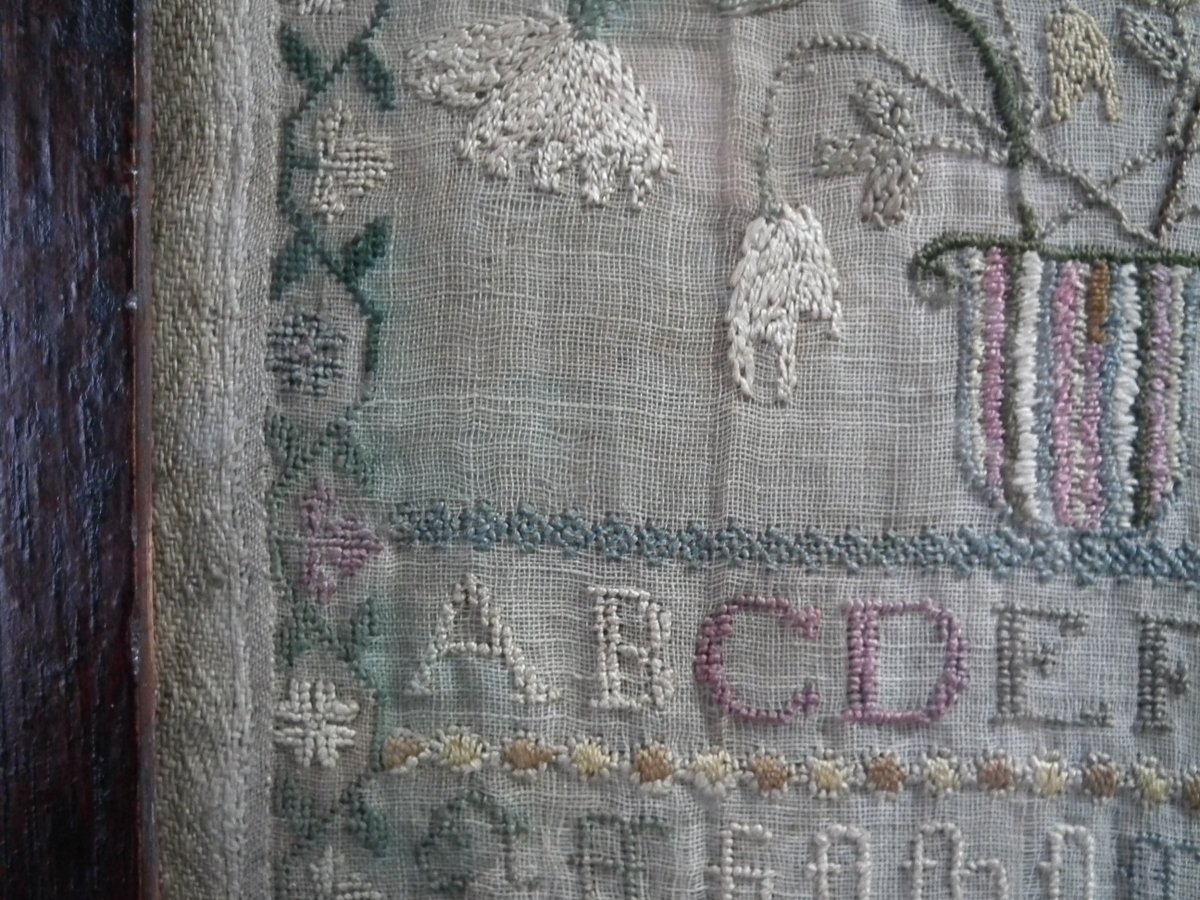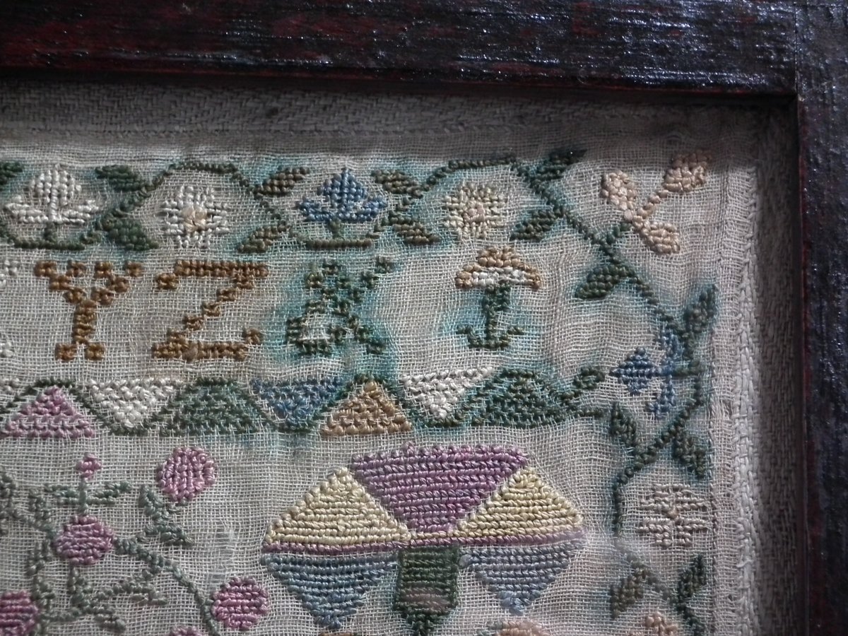 Framed in an old wood frame with glass. Mounting: The sampler is fixed to board. Frame backed with card.