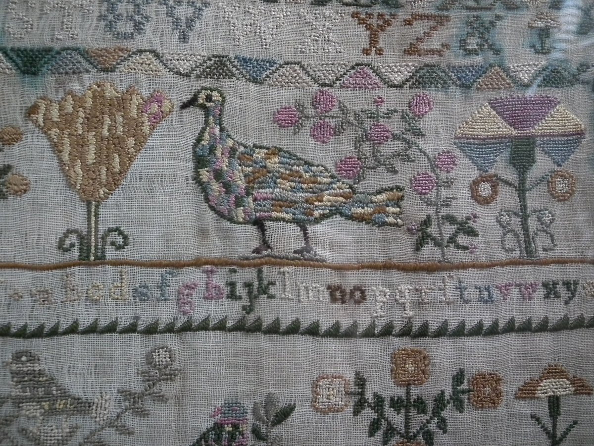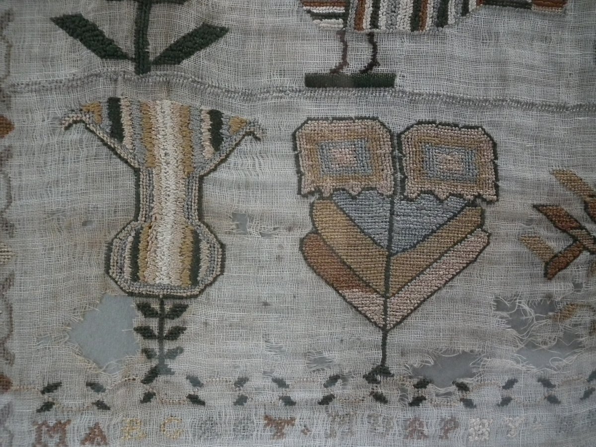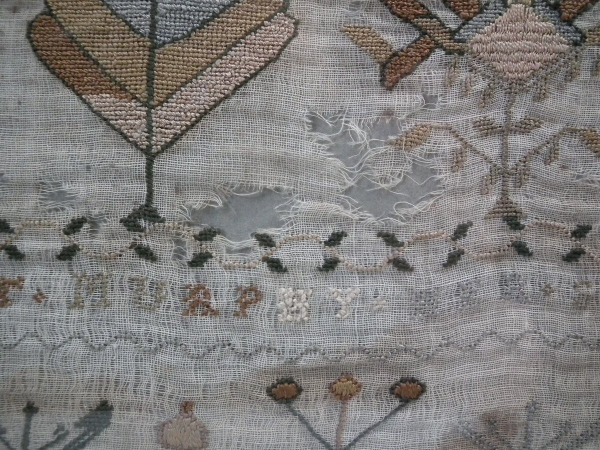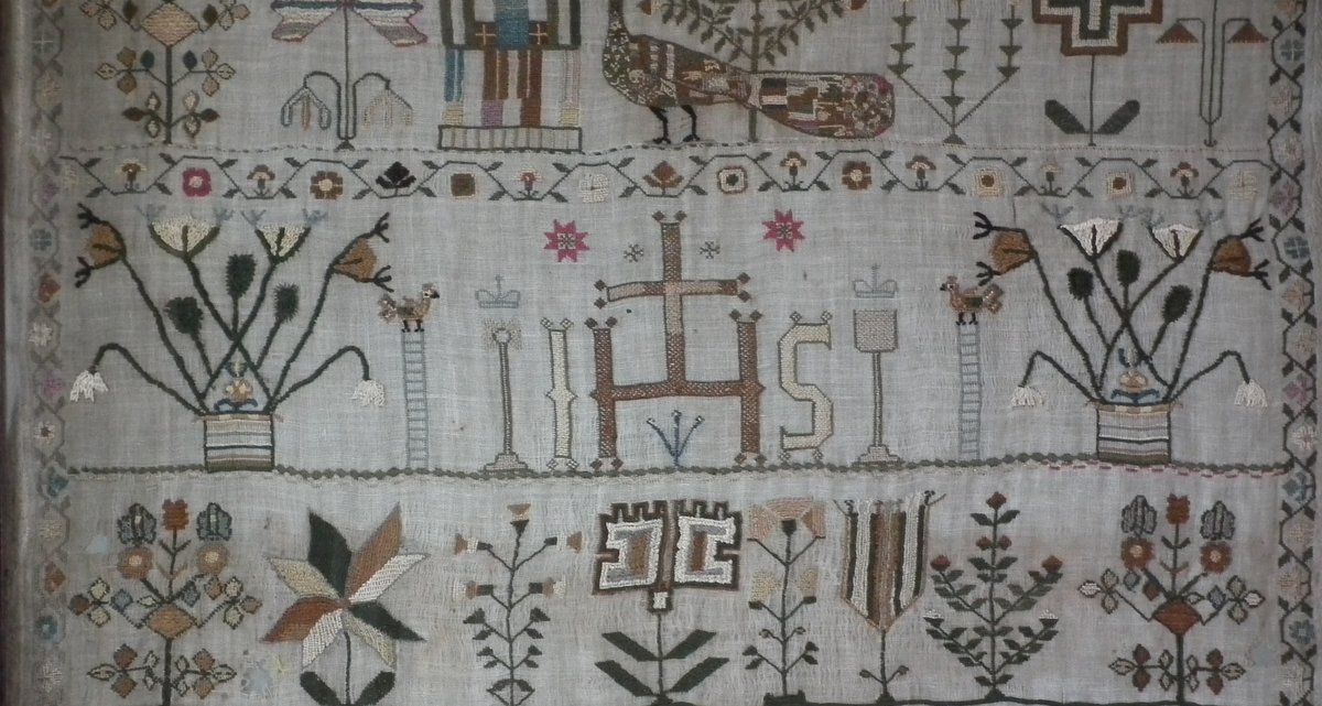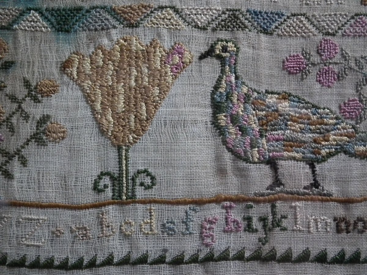 Framed in an old wood frame with glass. Mounting: The sampler is fixed to board. Frame backed with card.