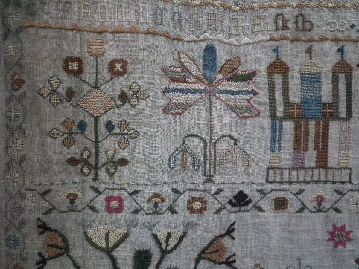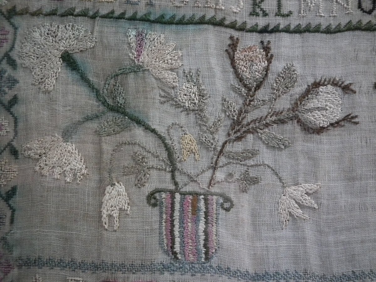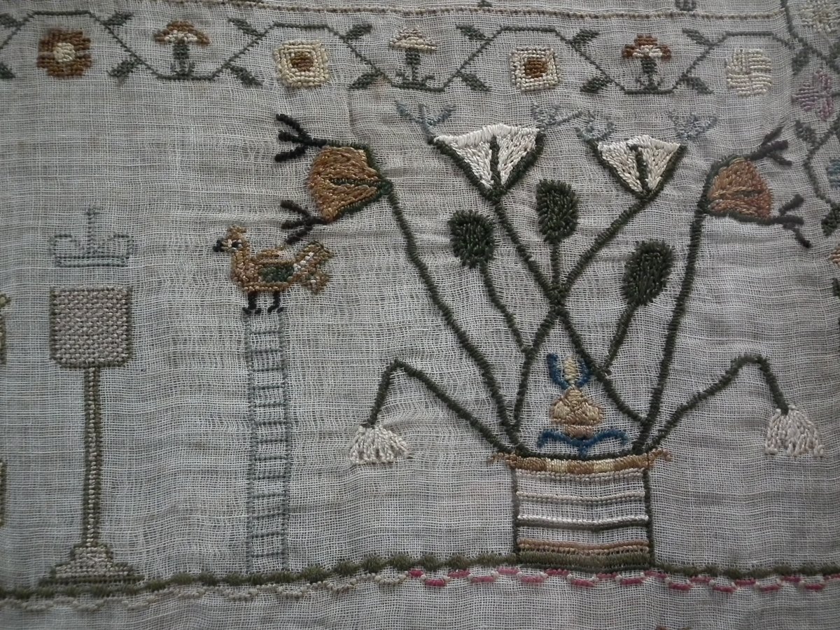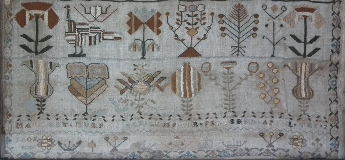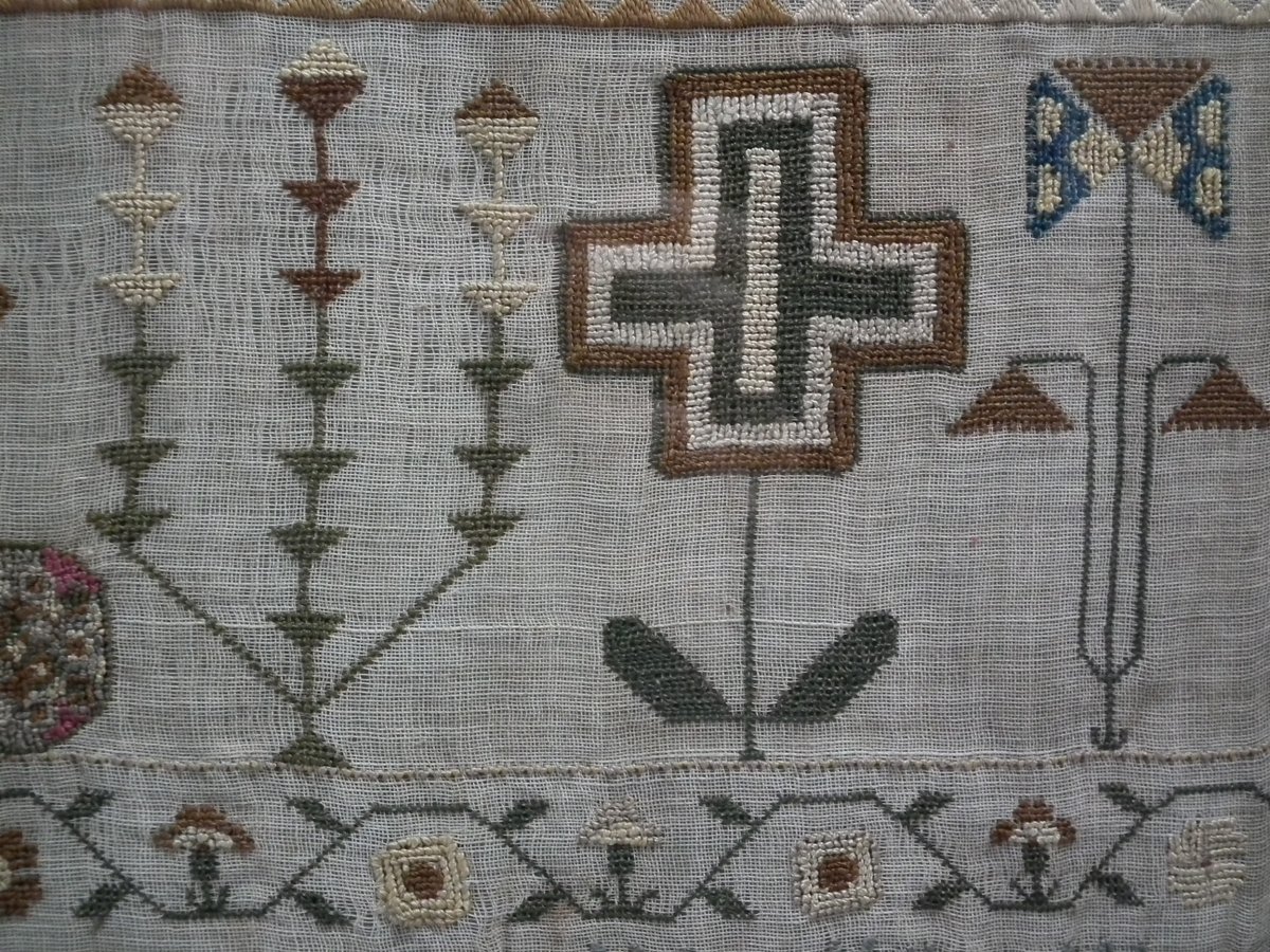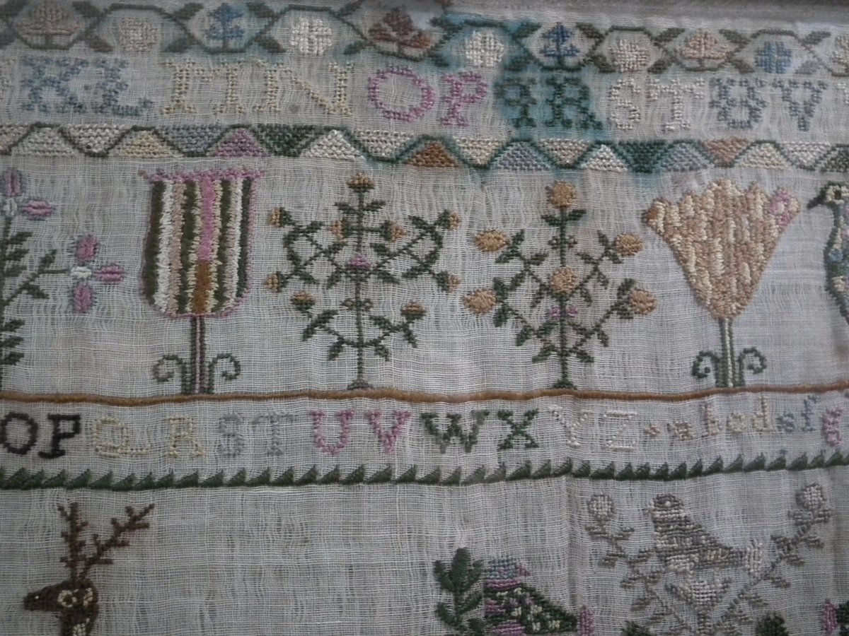 Framed in an old wood frame with glass. Mounting: The sampler is fixed to board. Frame backed with card.
