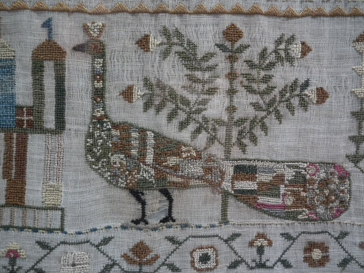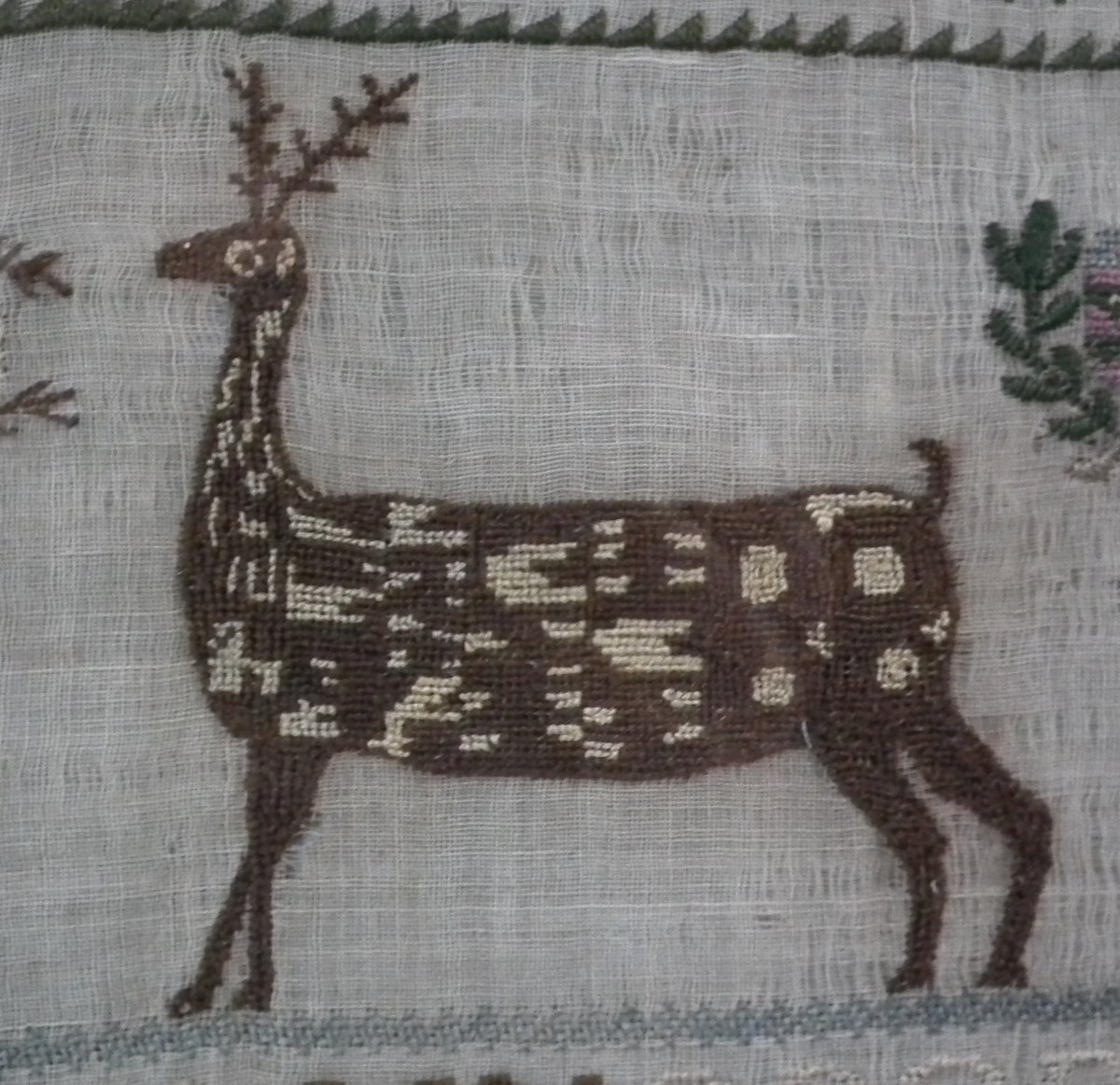 An amazing set of motifs, some finely embroidered, including a Stag, a Peacock, birds, flowers, potted flowering plants, crowns, religious building and fruit trees.