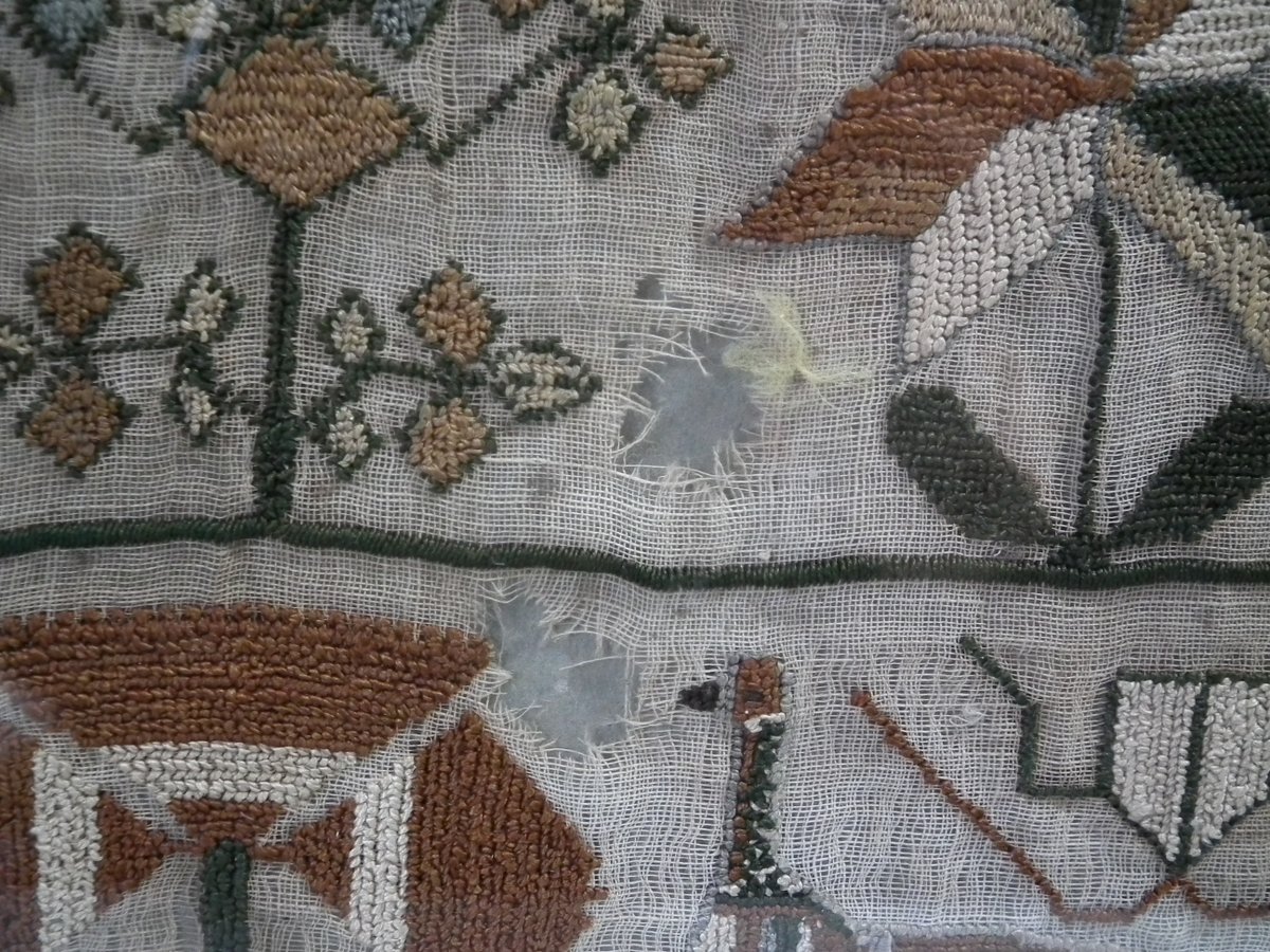 No stitch losses other than to the holed areas. Colours are slightly faded, but still well defined. Colour run around the green threads.