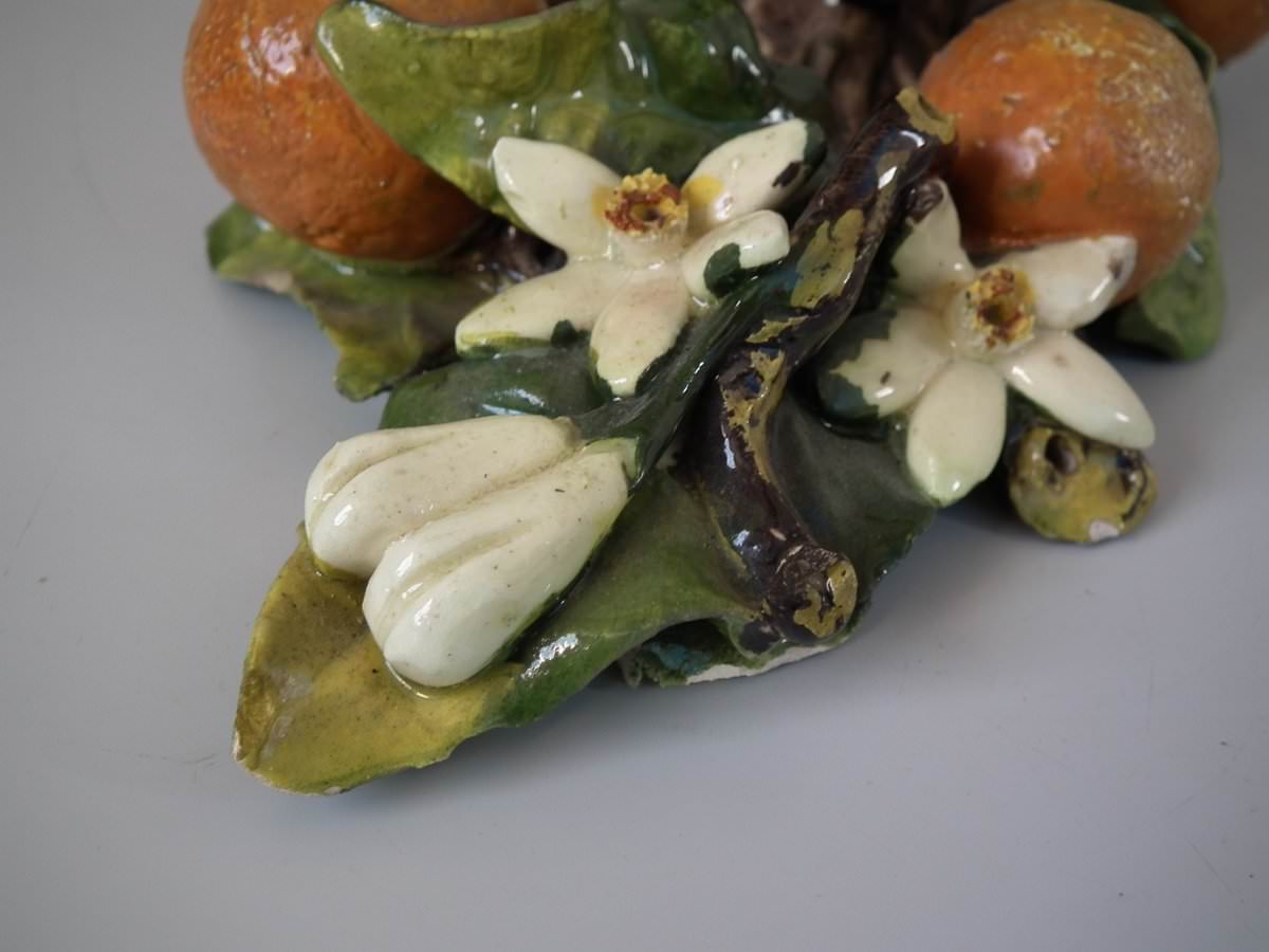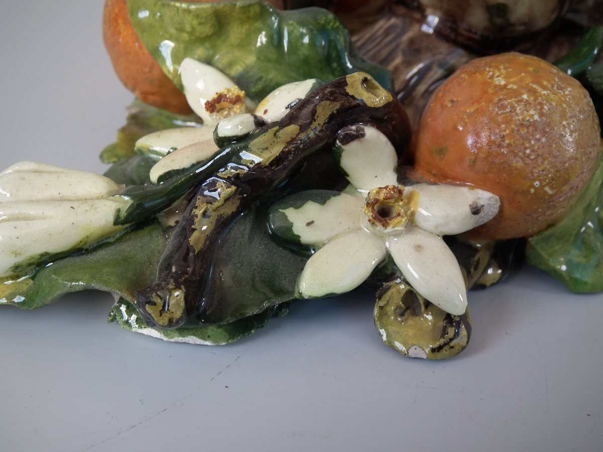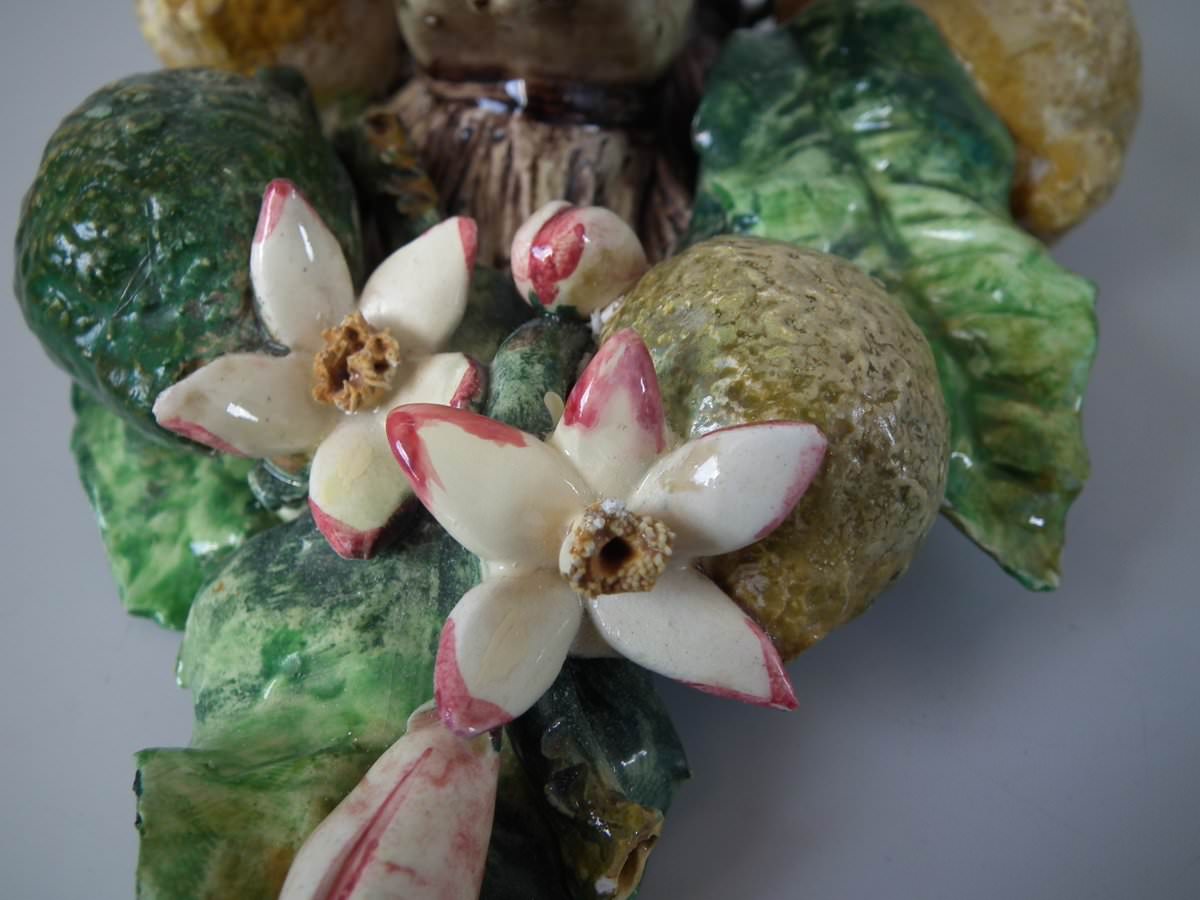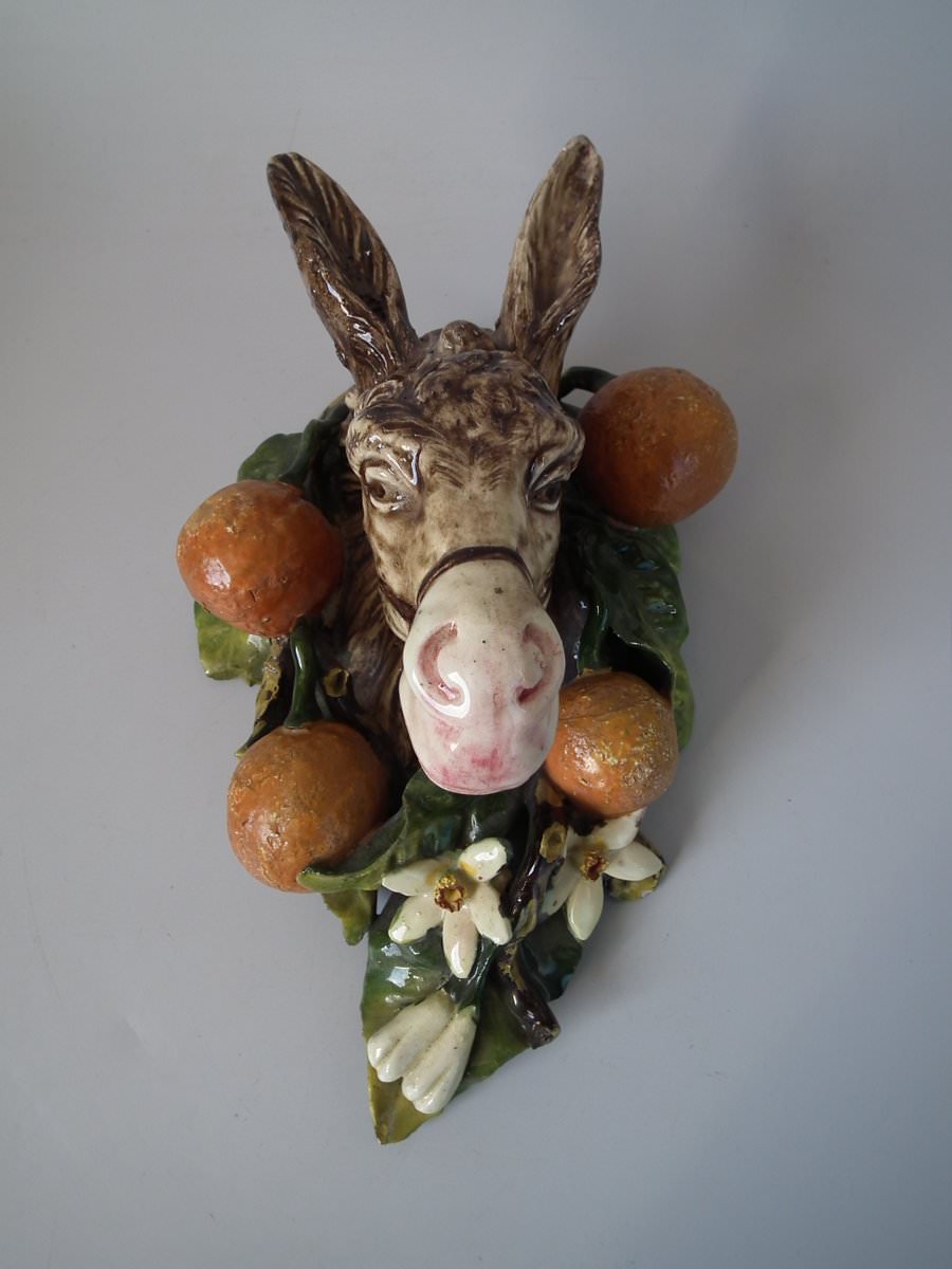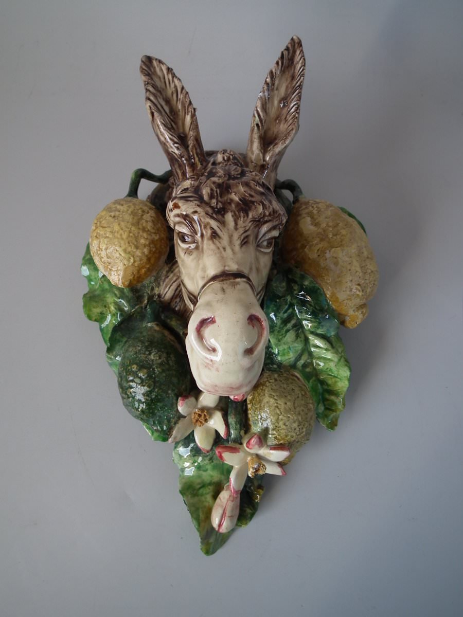 Circa 1880. Tallest is 9.8ins high, 6.5ins wide, 4.1ins depth. Pair of Menton Majolica wall pockets which feature a donkeys head, citrus fruits (oranges and lemons) and tree blossom.