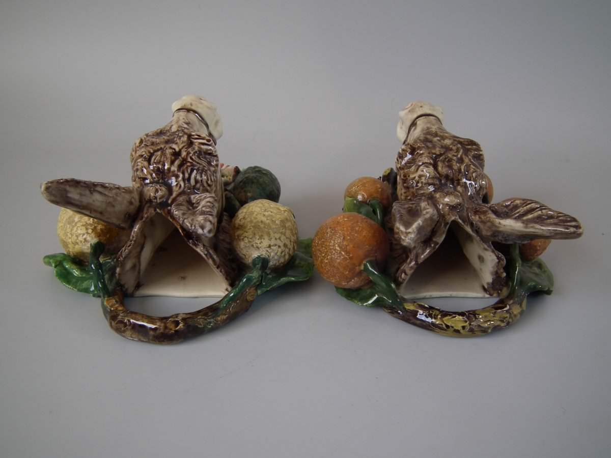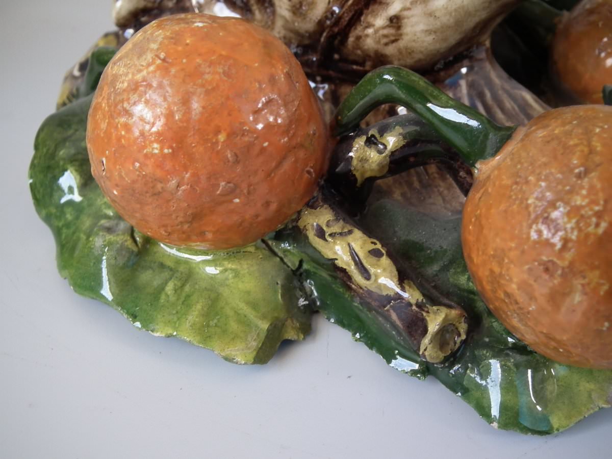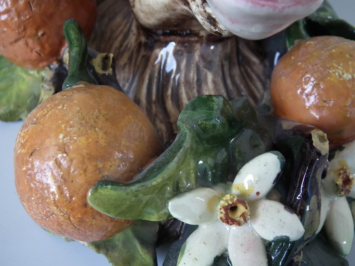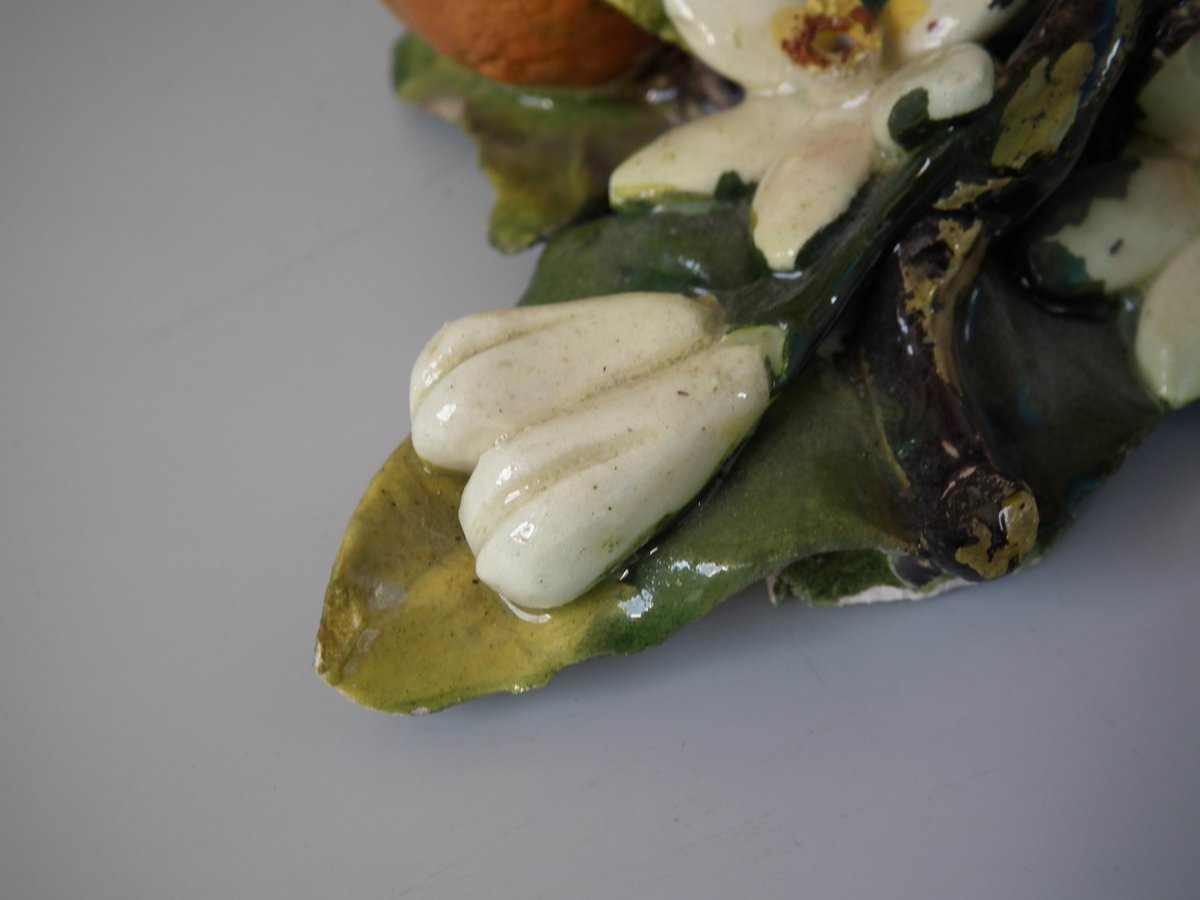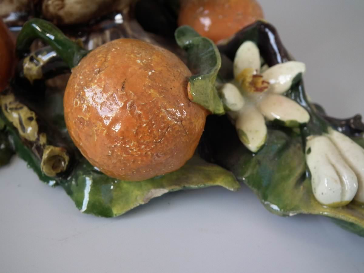 Circa 1880. Tallest is 9.8ins high, 6.5ins wide, 4.1ins depth. Pair of Menton Majolica wall pockets which feature a donkeys head, citrus fruits (oranges and lemons) and tree blossom.