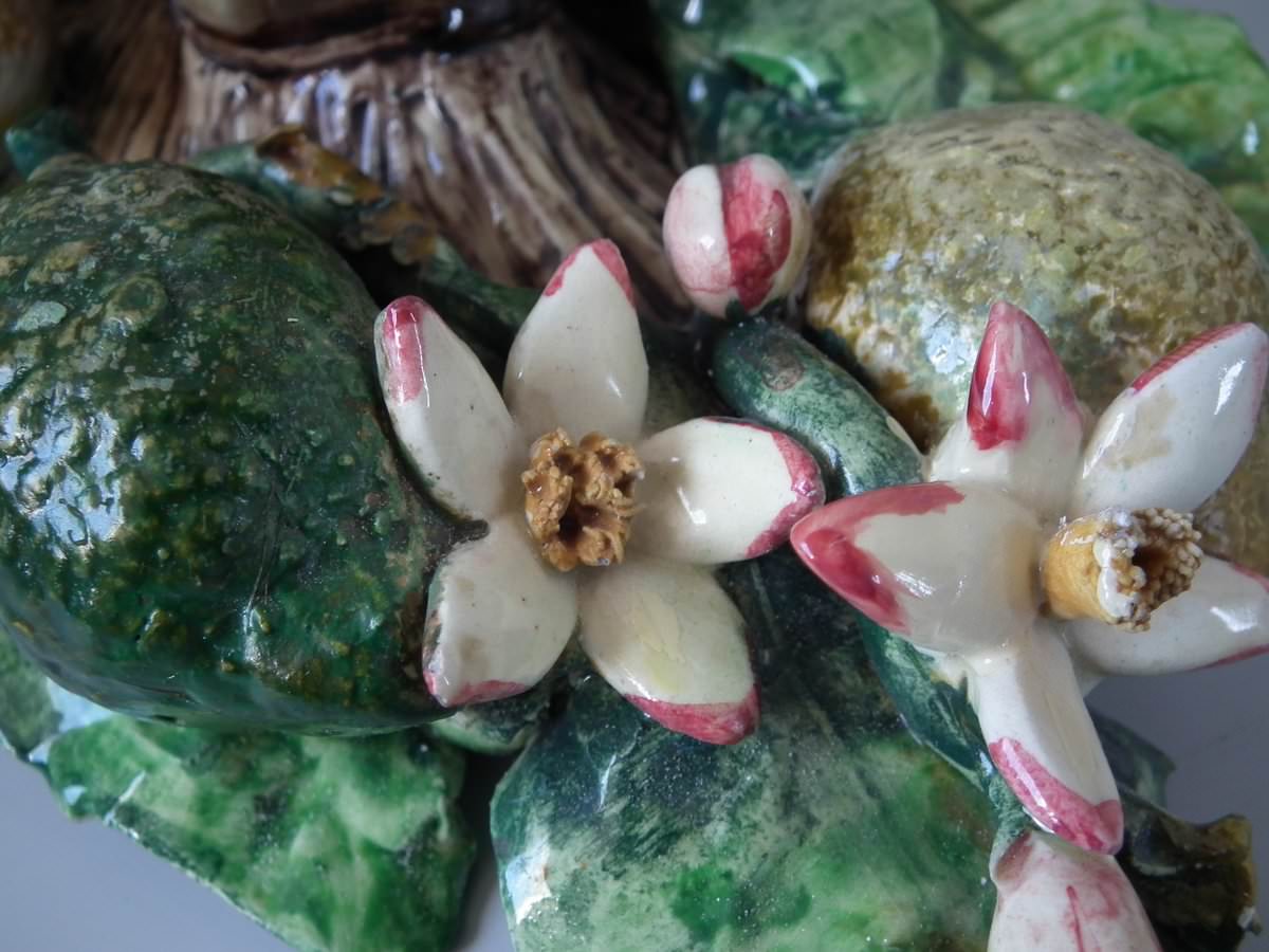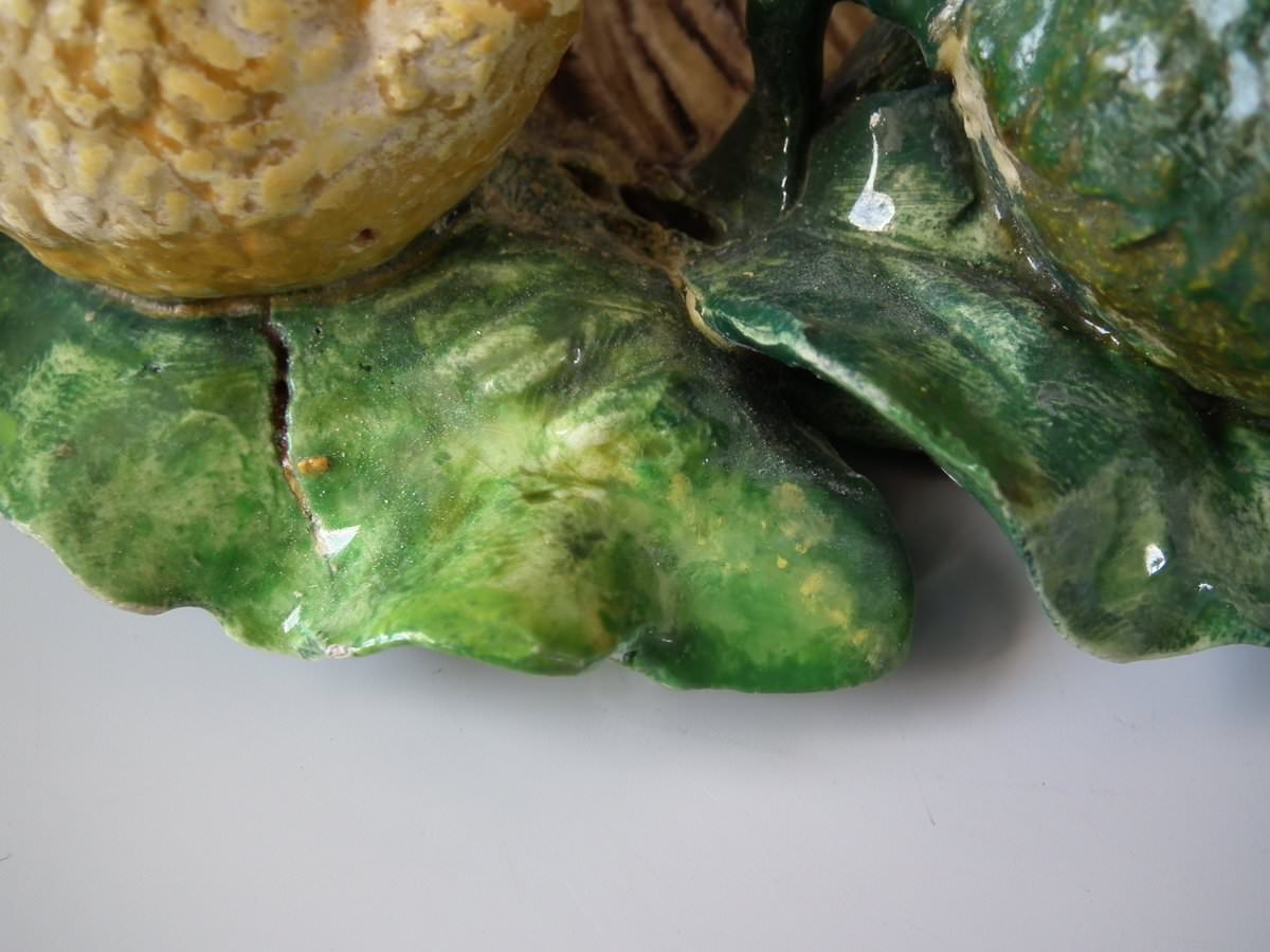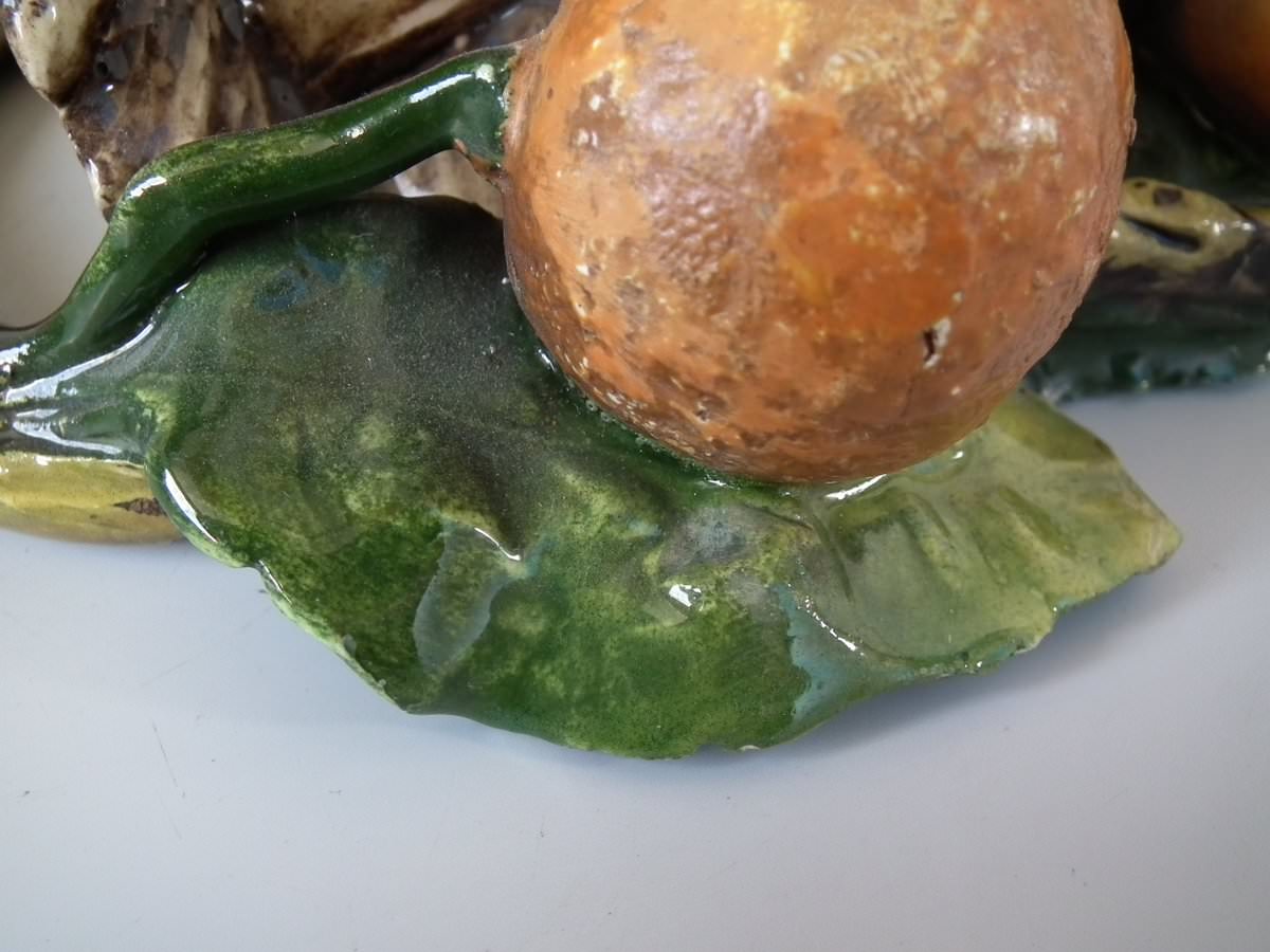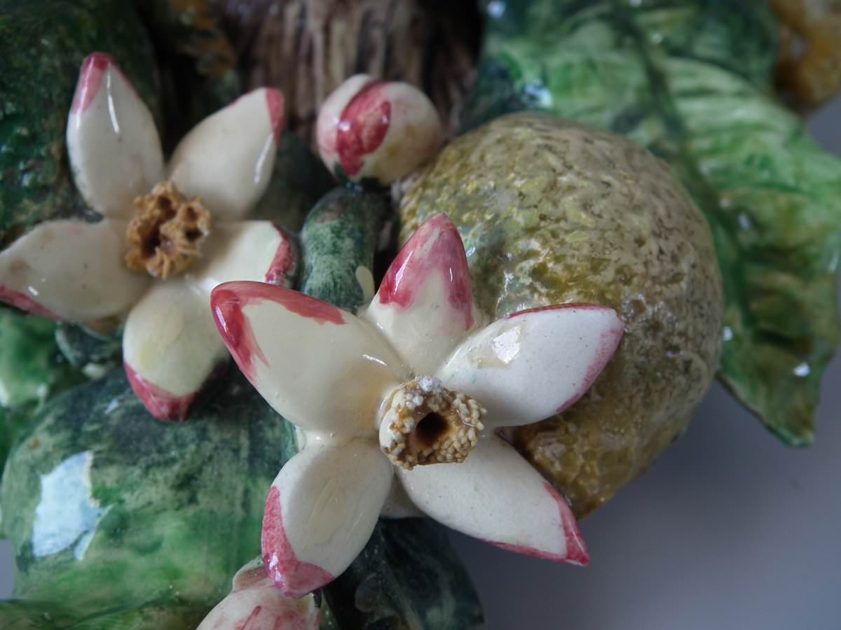 Circa 1880. Tallest is 9.8ins high, 6.5ins wide, 4.1ins depth. Pair of Menton Majolica wall pockets which feature a donkeys head, citrus fruits (oranges and lemons) and tree blossom.