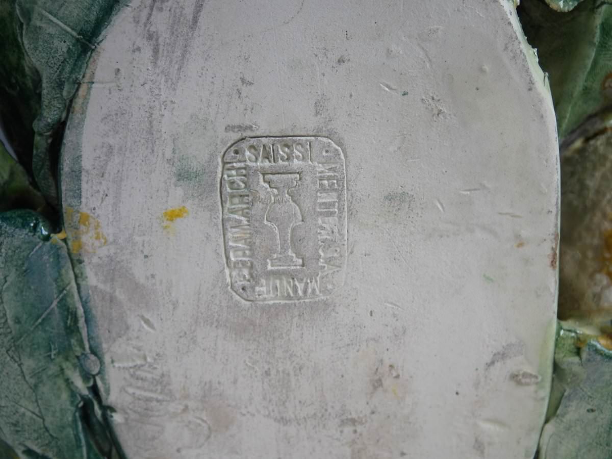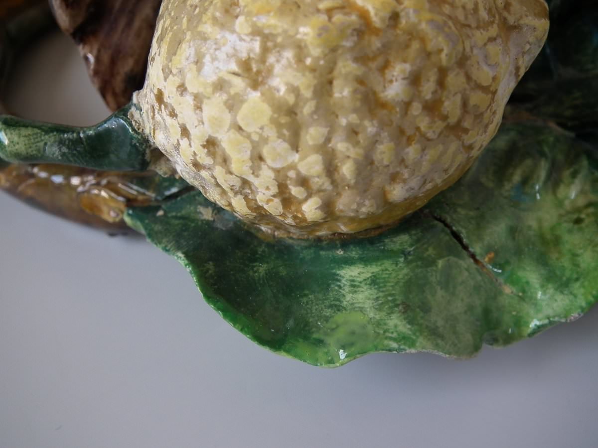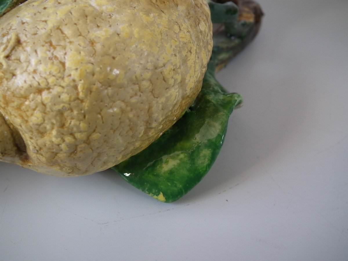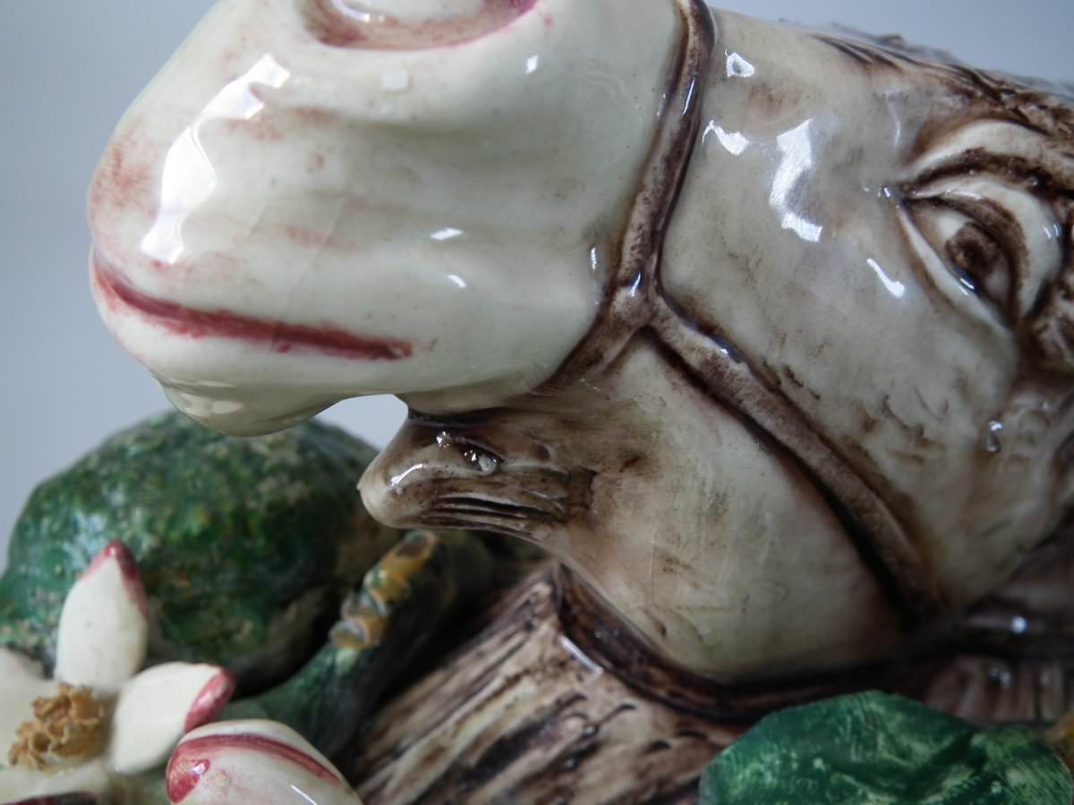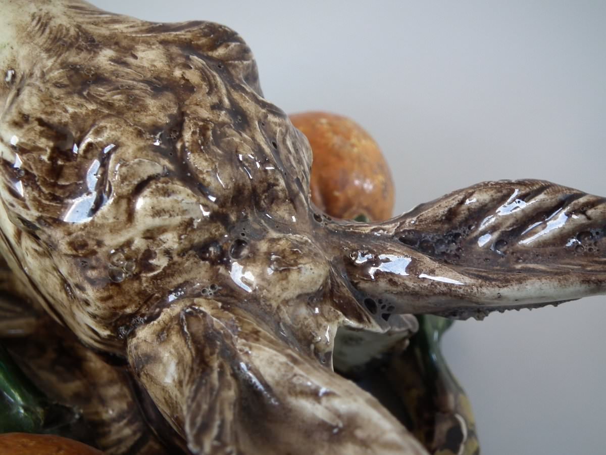 Circa 1880. Tallest is 9.8ins high, 6.5ins wide, 4.1ins depth. Pair of Menton Majolica wall pockets which feature a donkeys head, citrus fruits (oranges and lemons) and tree blossom.