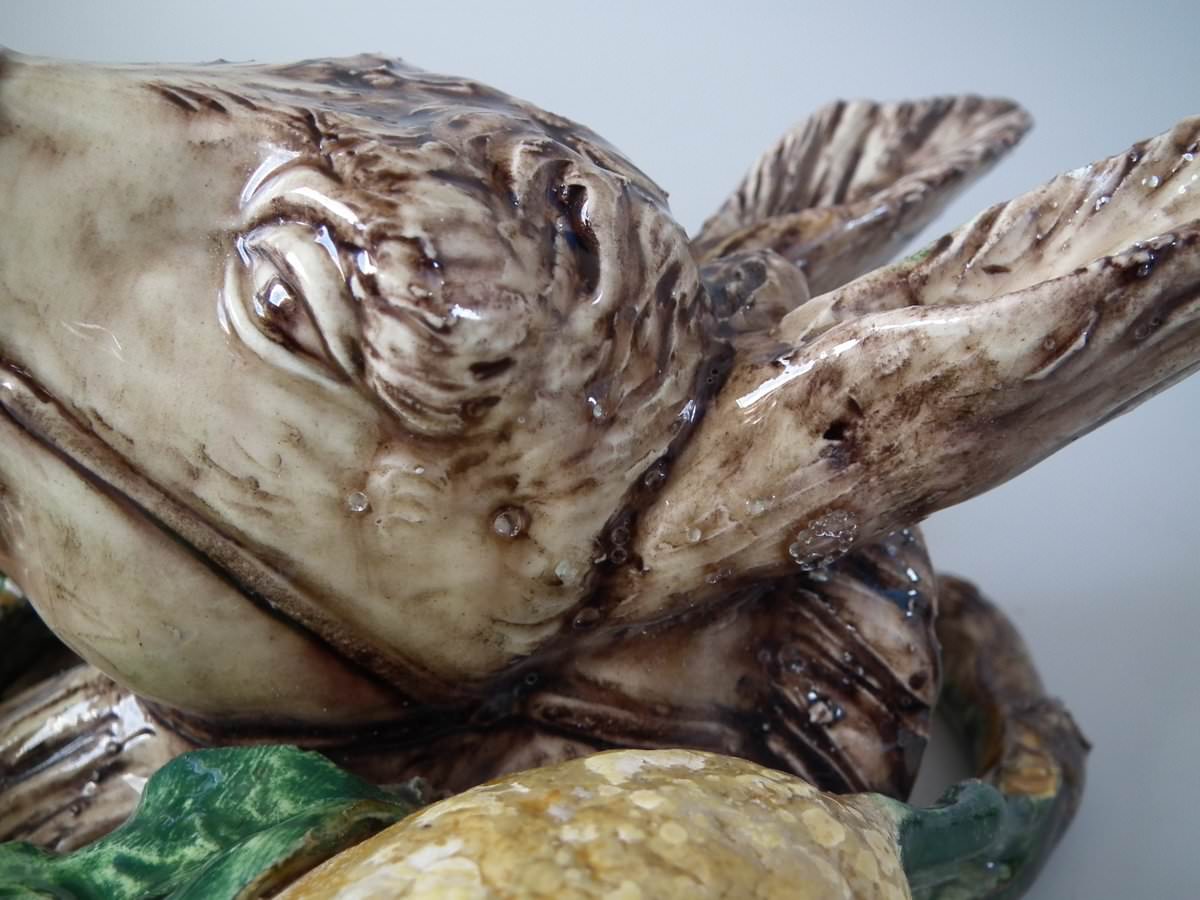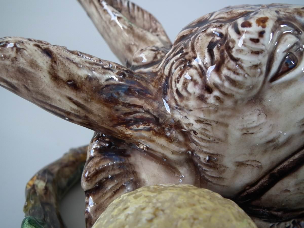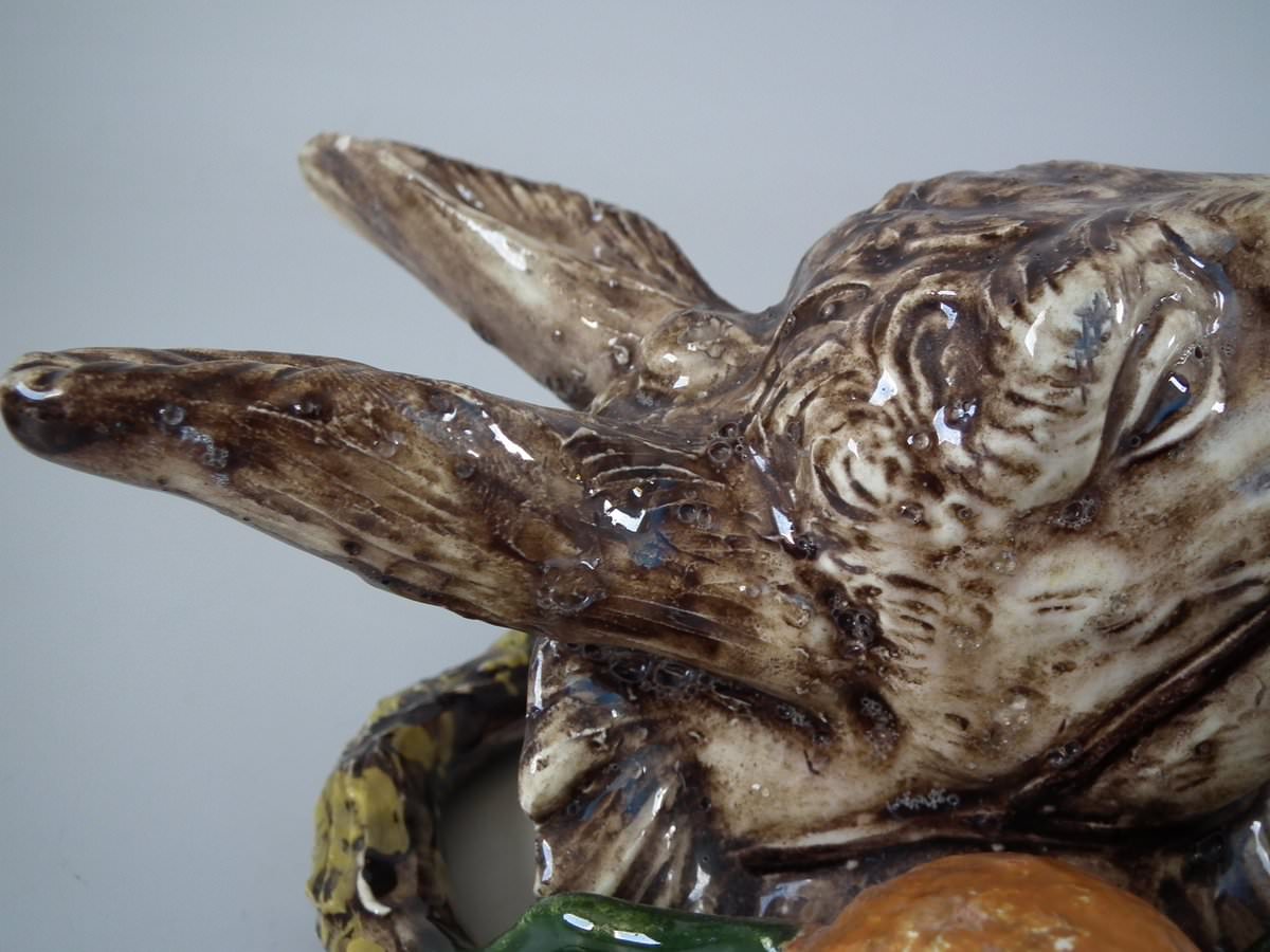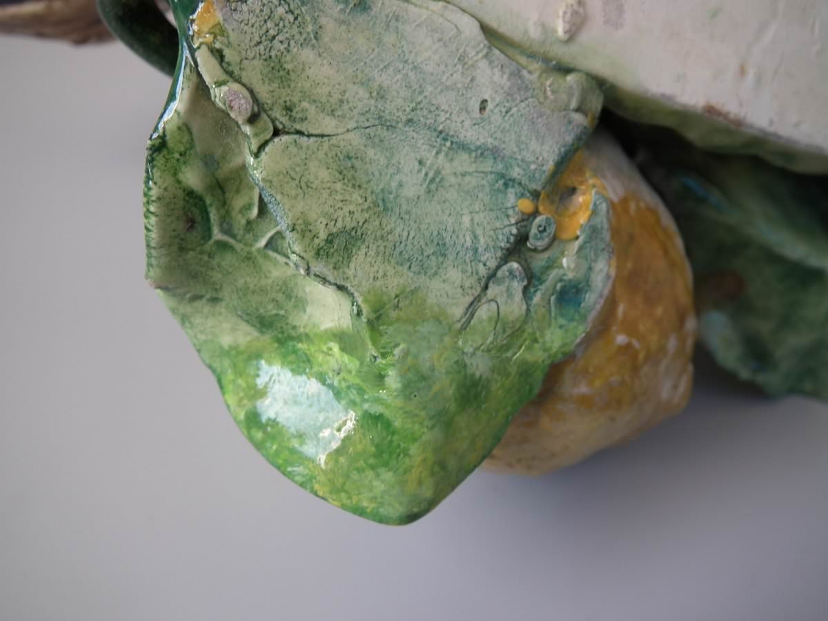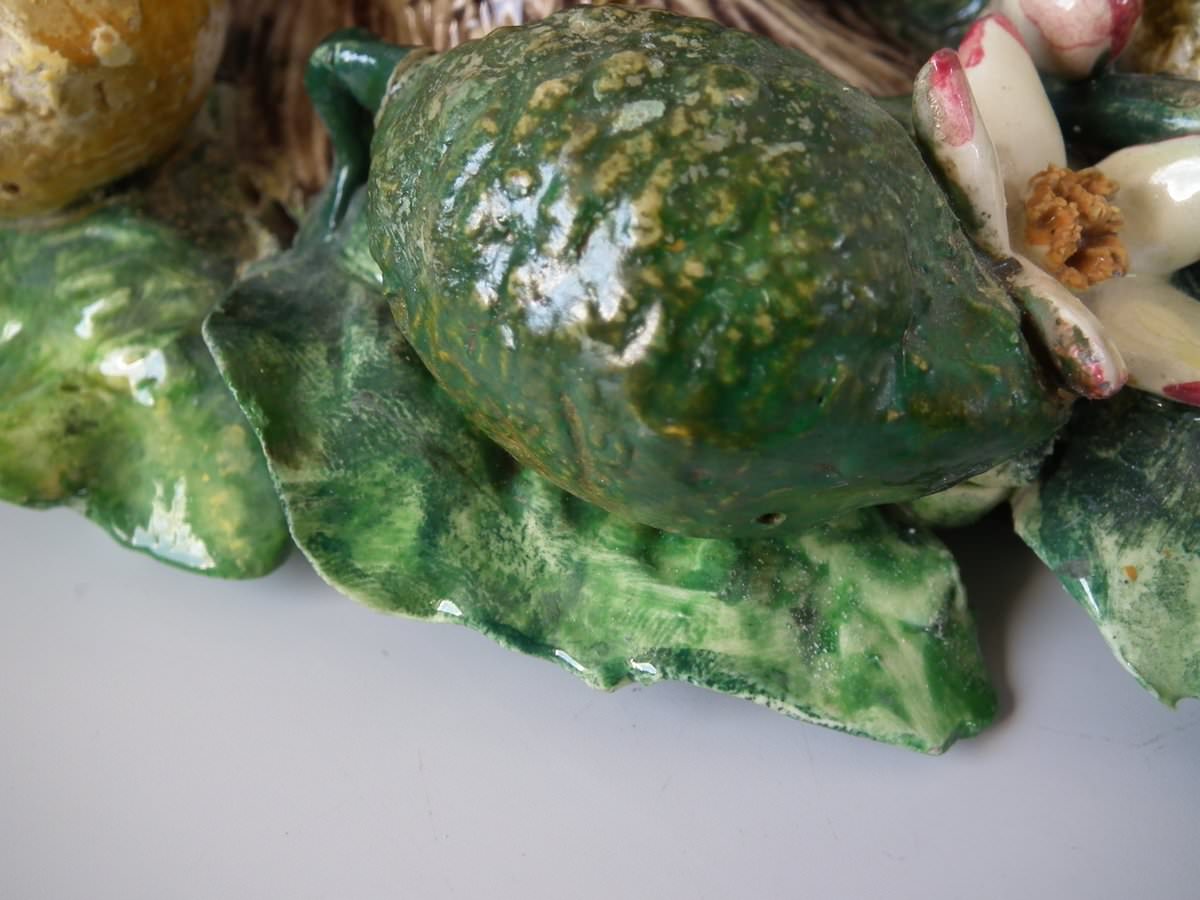 Circa 1880. Tallest is 9.8ins high, 6.5ins wide, 4.1ins depth. Pair of Menton Majolica wall pockets which feature a donkeys head, citrus fruits (oranges and lemons) and tree blossom.