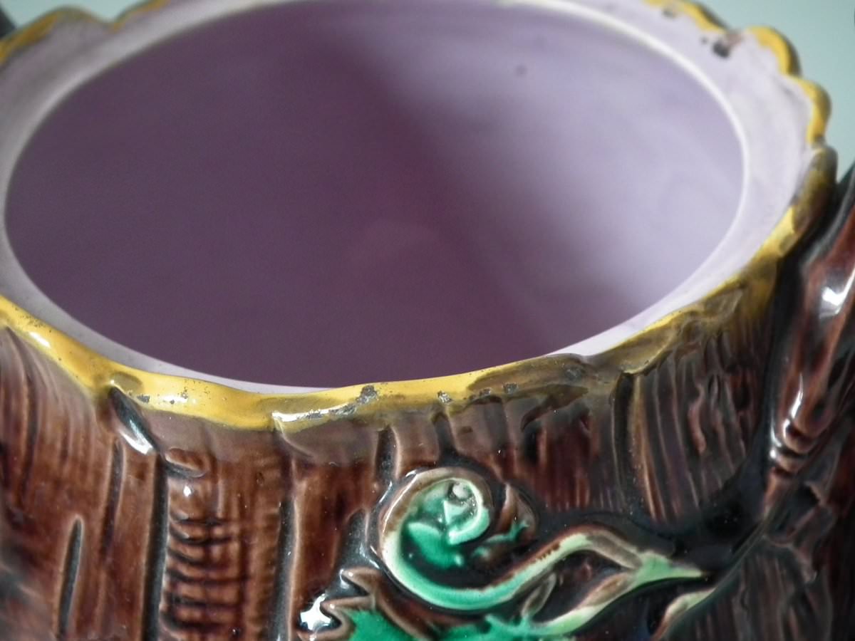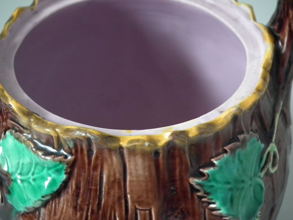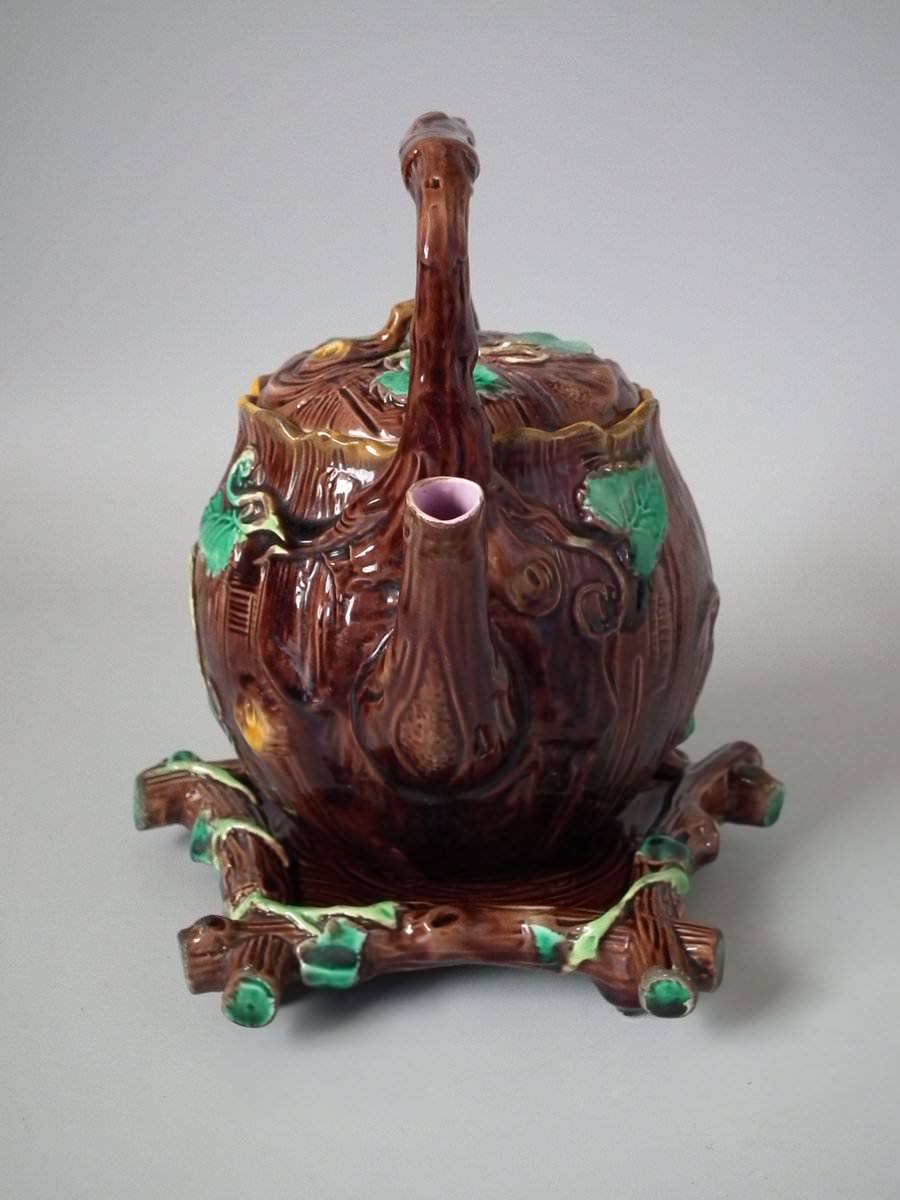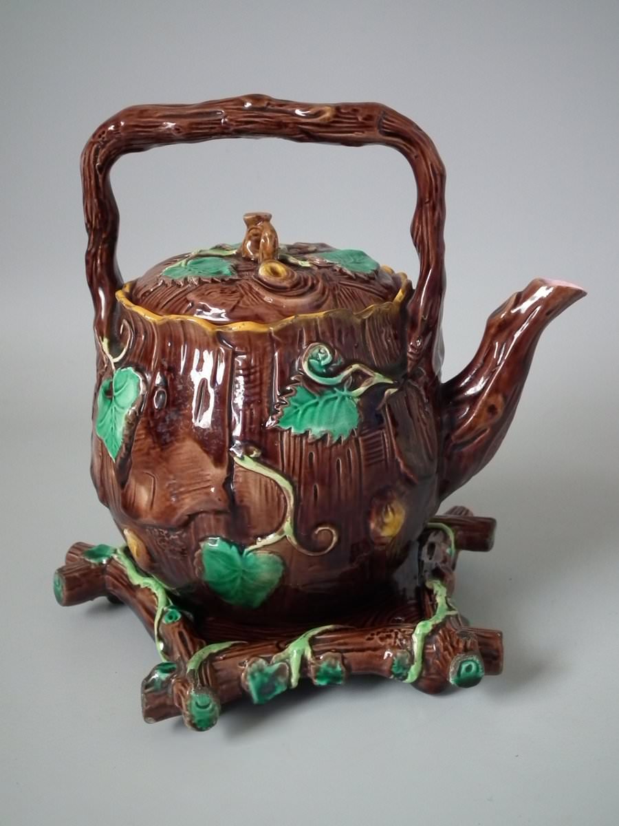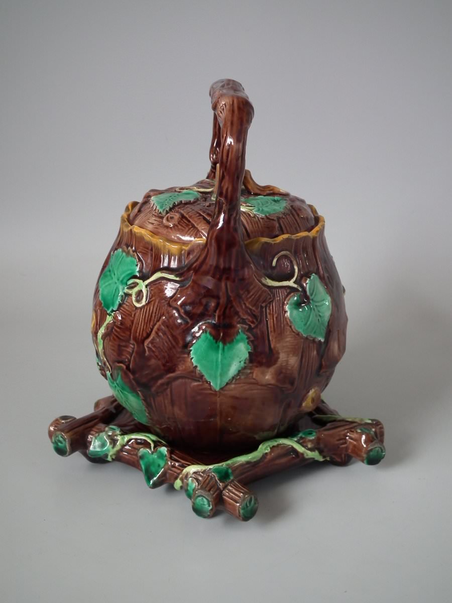 Victorian, circa 1880. 8.7ins high, 8.7ins wide, 7.5ins depth. George Jones Majolica tea kettle on stand which features tree bark and ivy.