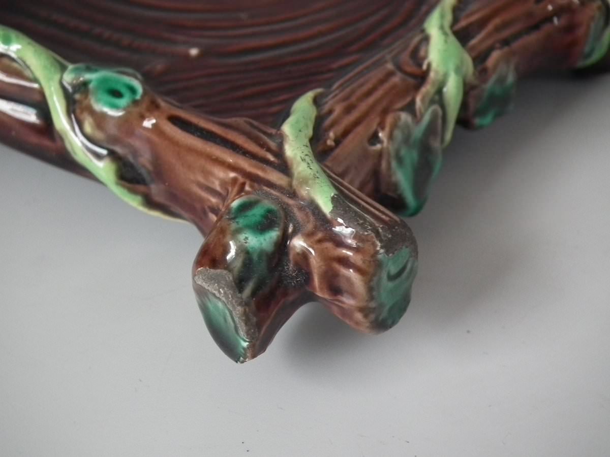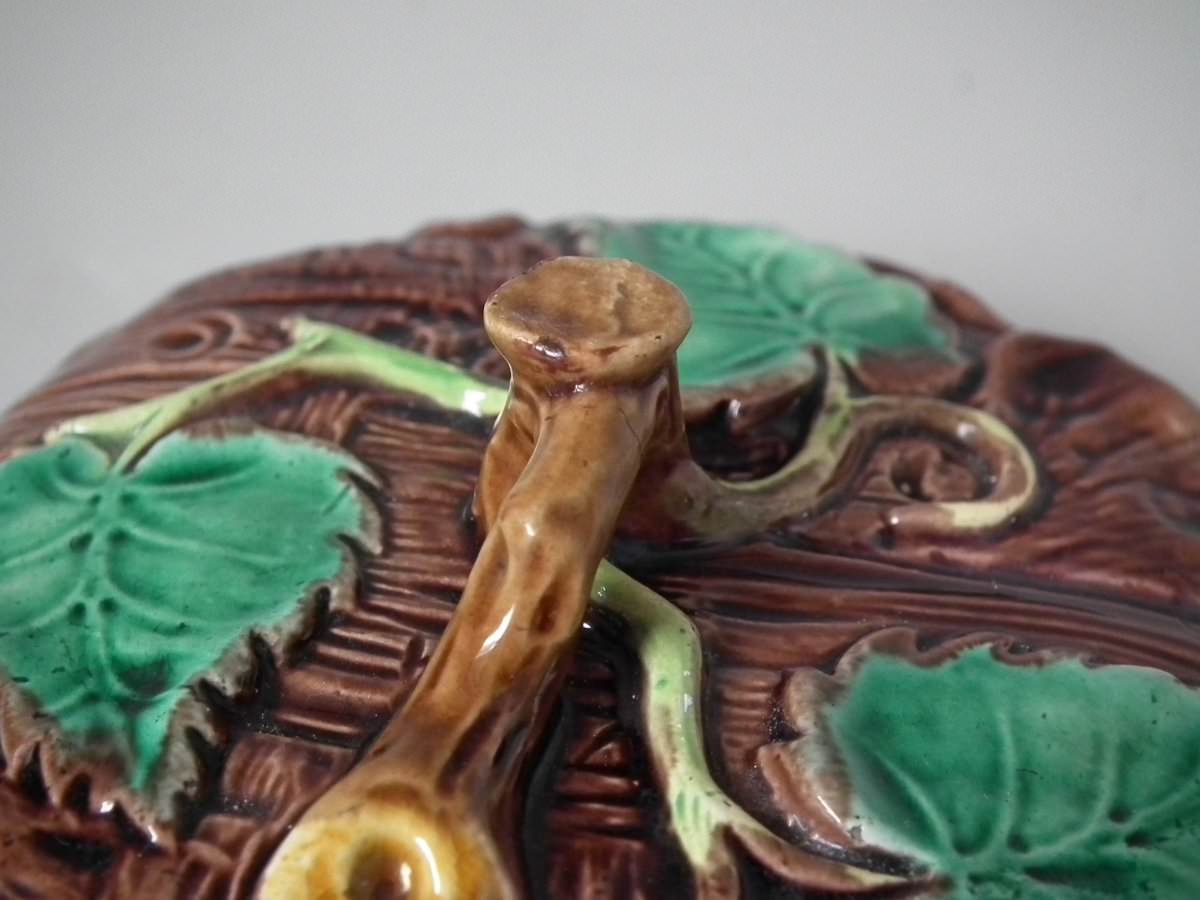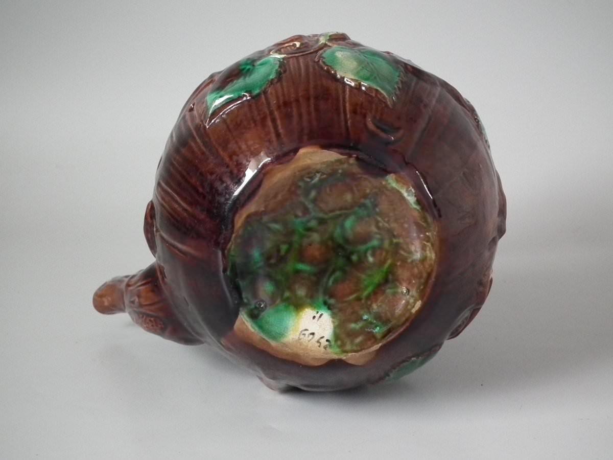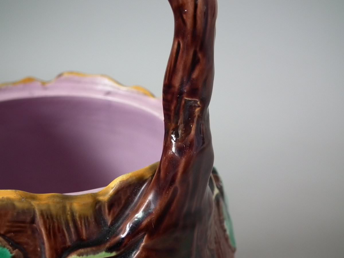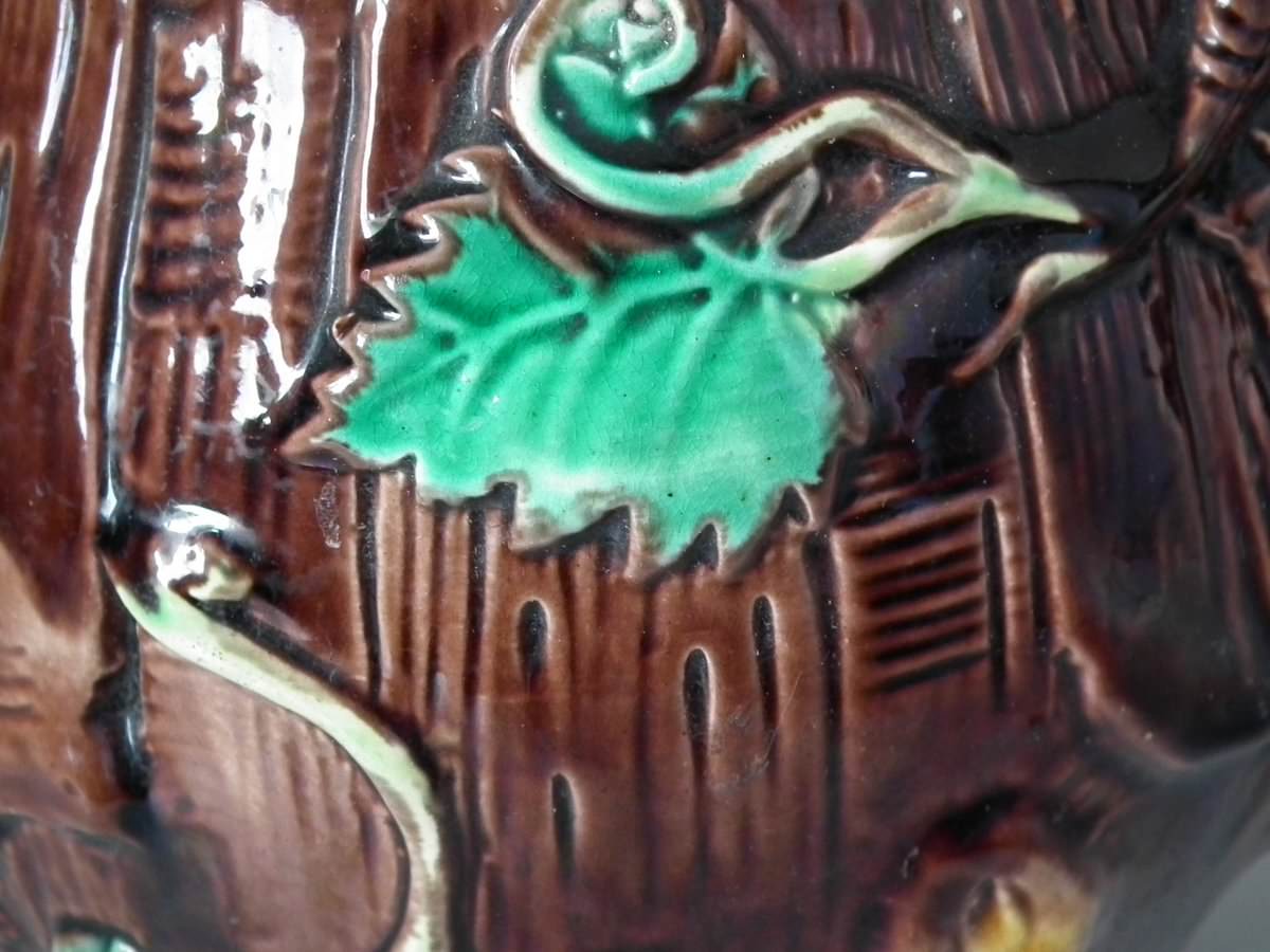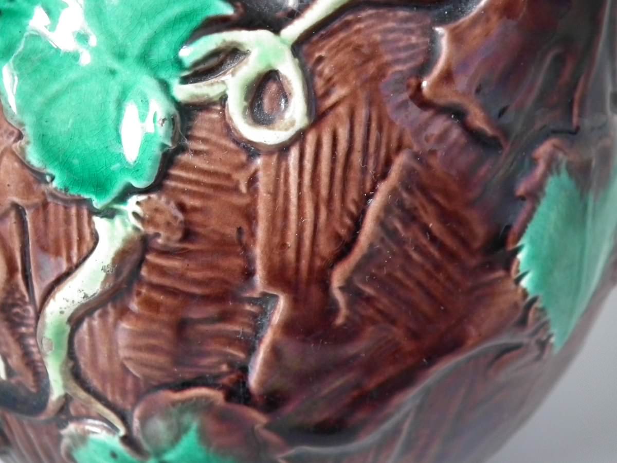 Victorian, circa 1880. 8.7ins high, 8.7ins wide, 7.5ins depth. George Jones Majolica tea kettle on stand which features tree bark and ivy.