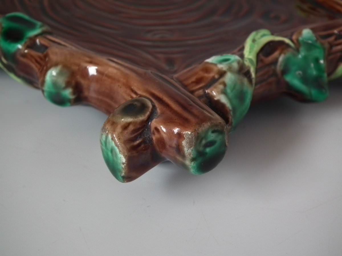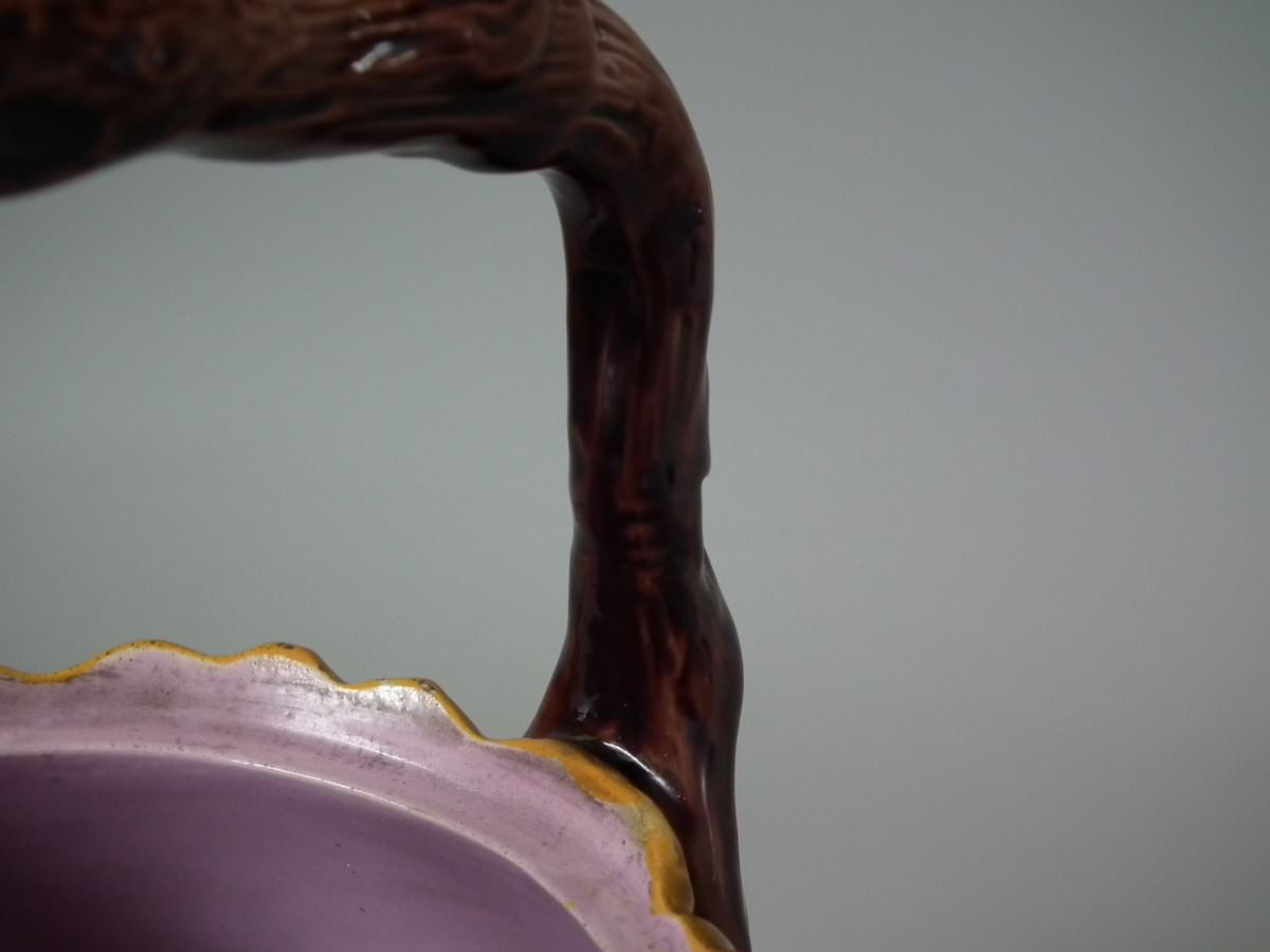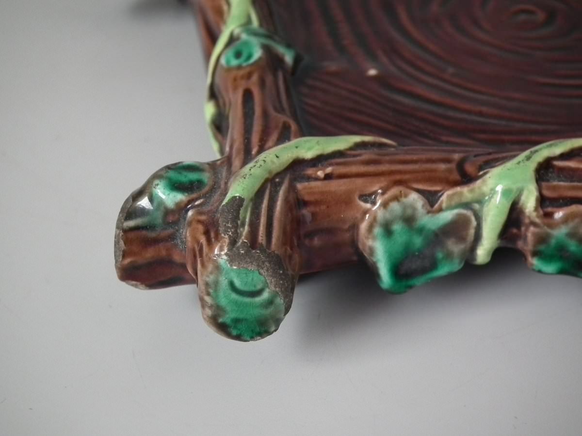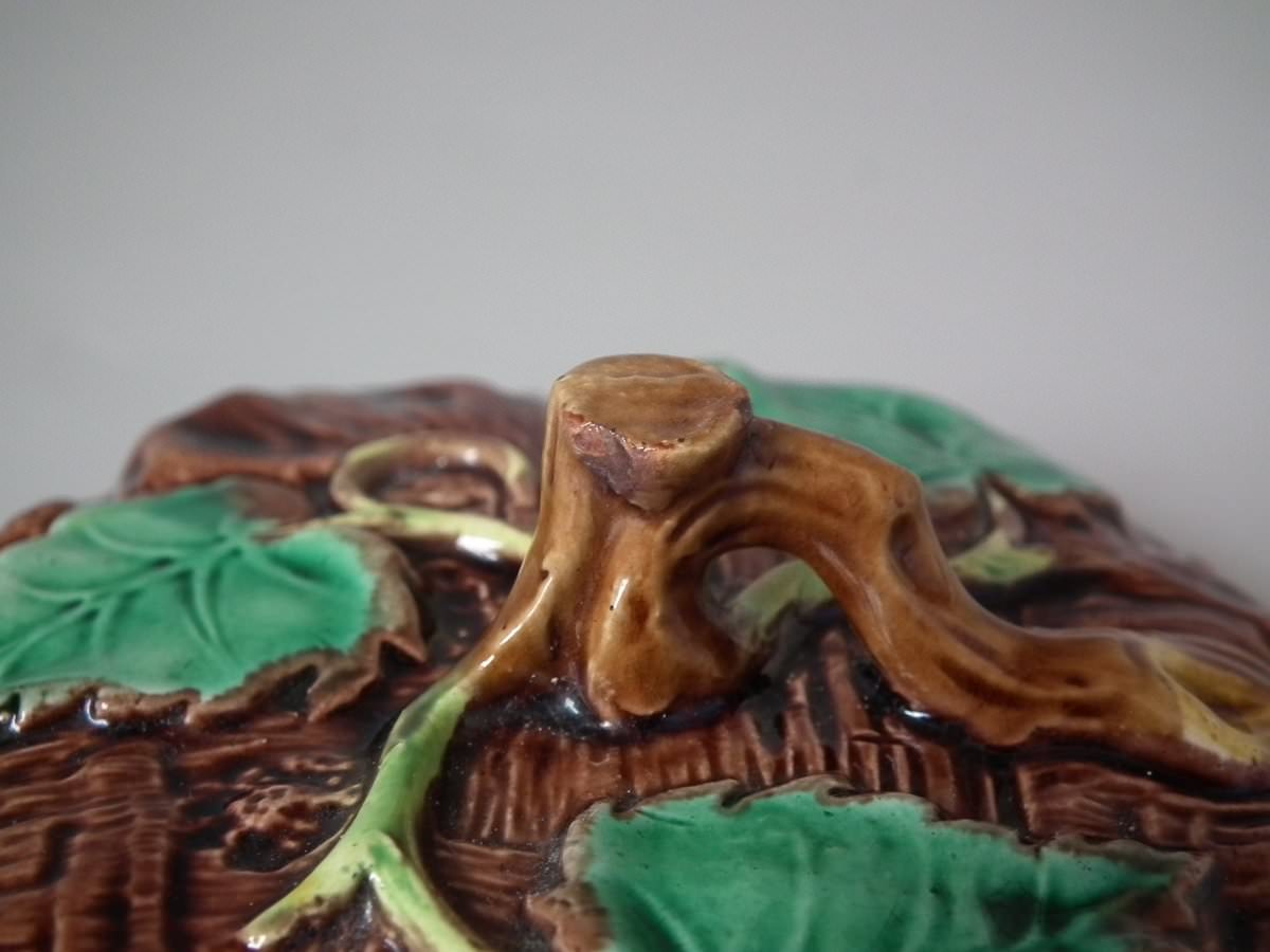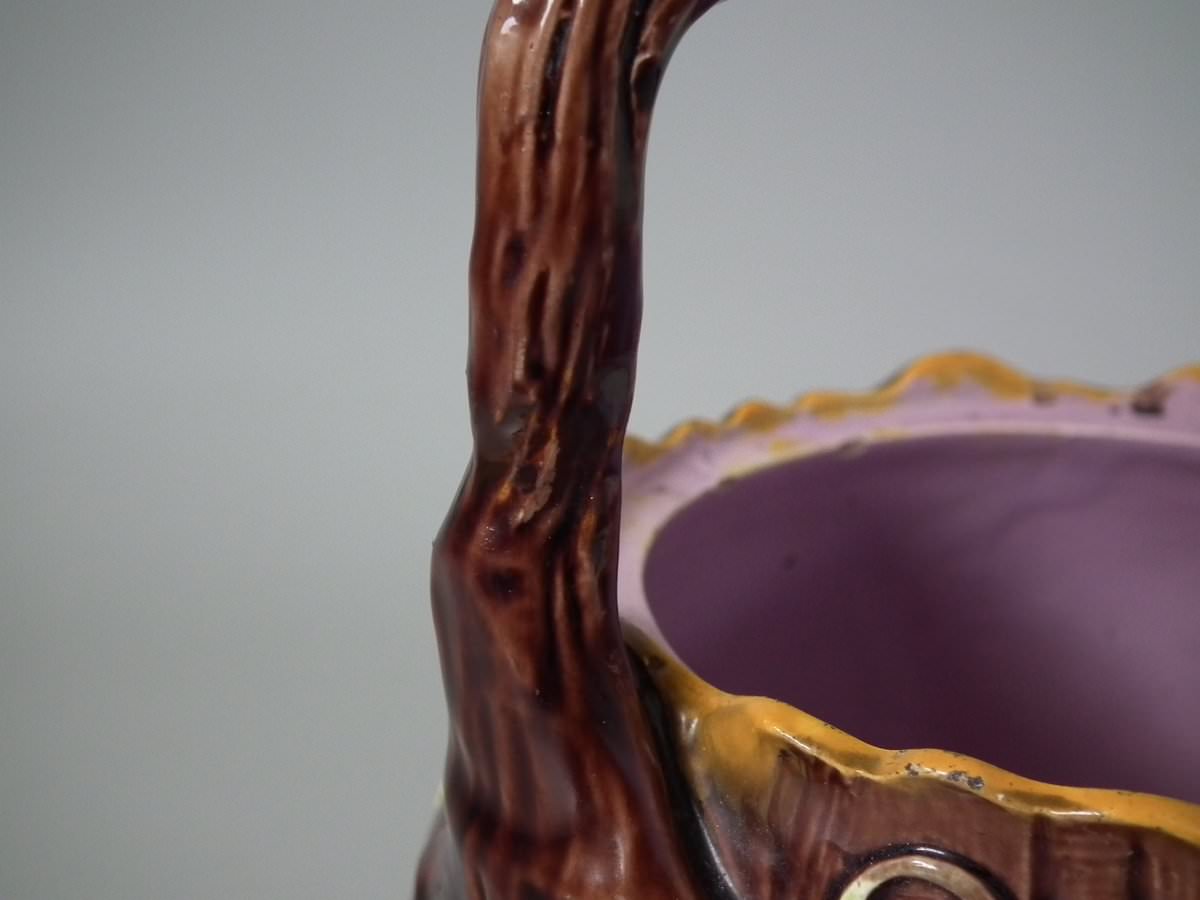 Victorian, circa 1880. 8.7ins high, 8.7ins wide, 7.5ins depth. George Jones Majolica tea kettle on stand which features tree bark and ivy.