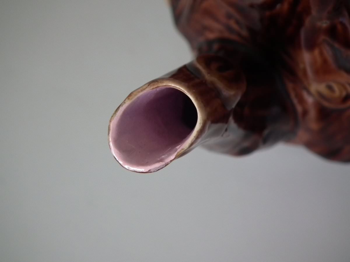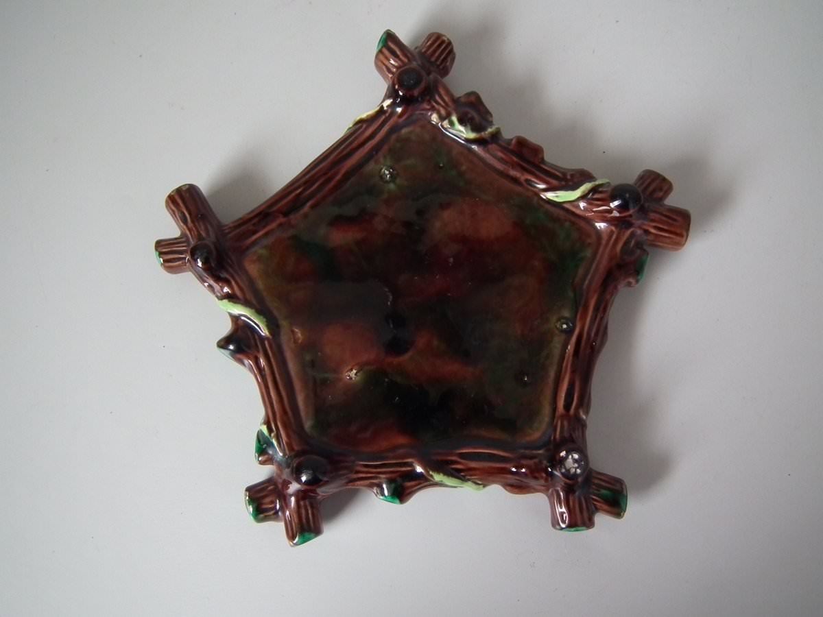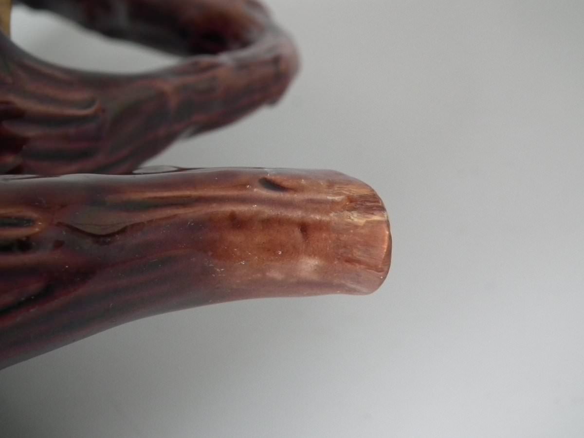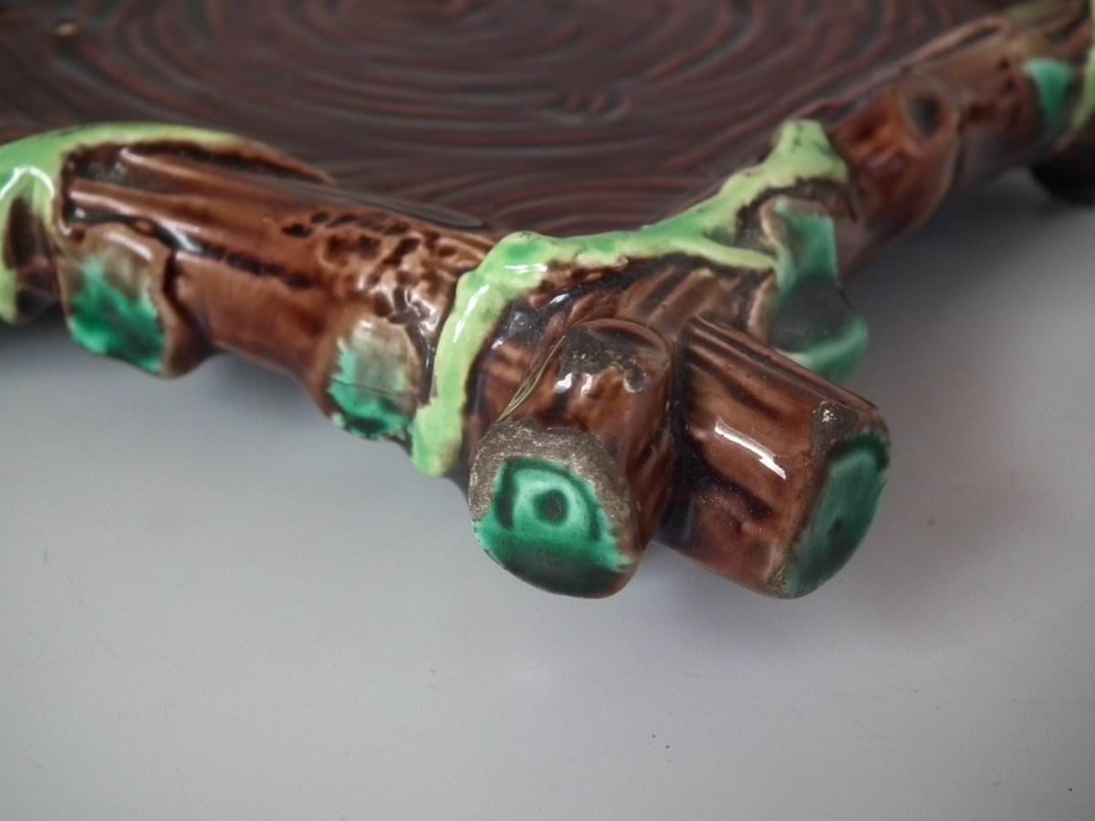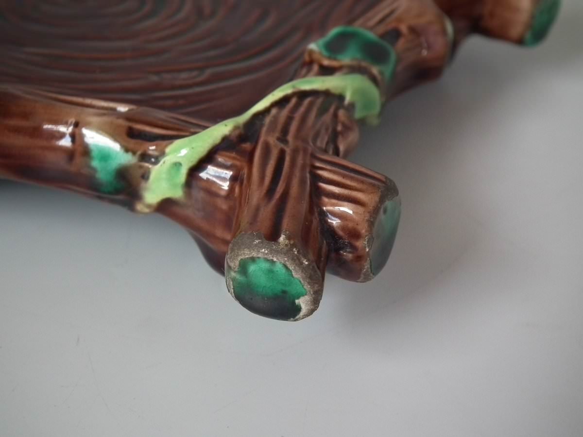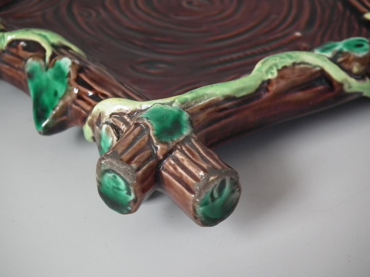 Victorian, circa 1880. 8.7ins high, 8.7ins wide, 7.5ins depth. George Jones Majolica tea kettle on stand which features tree bark and ivy.