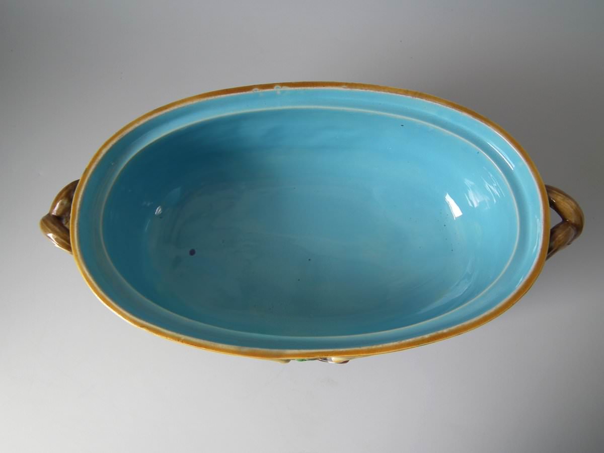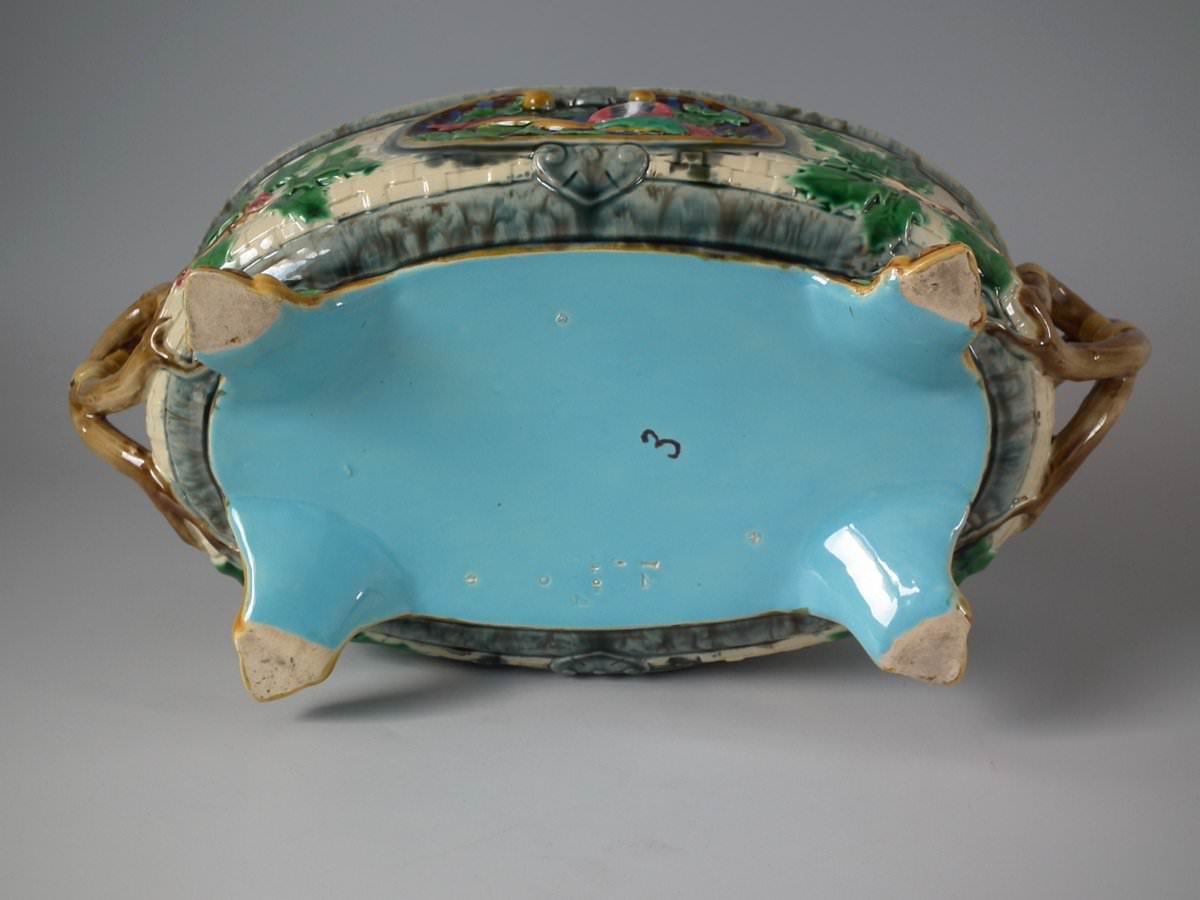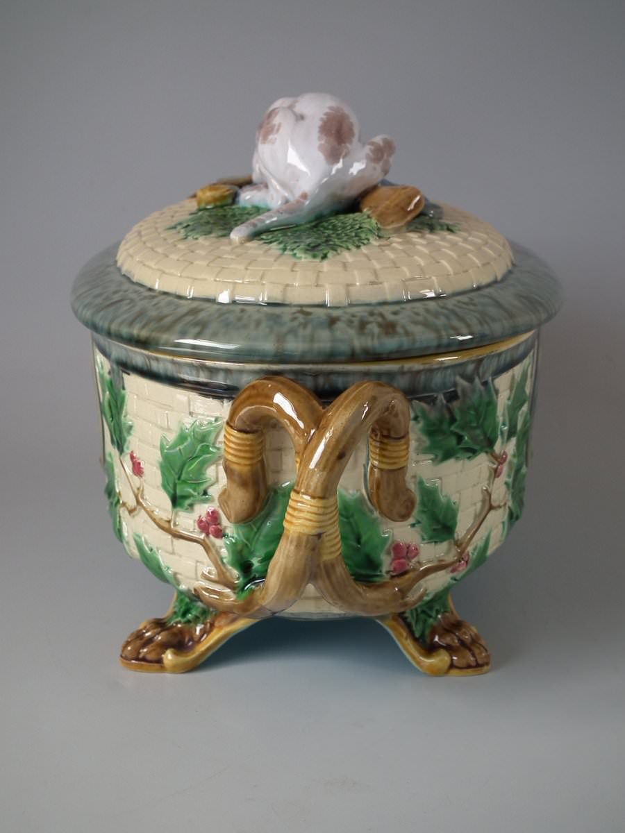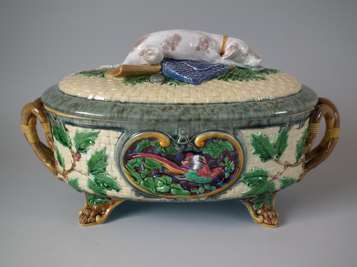 Victorian, circa 1870. 8.3ins high, 14.2ins wide, 7.3ins depth. Minton Majolica game pie dish with liner which features a hunting dog asleep next to a rifle, a powder flask and a game bag.