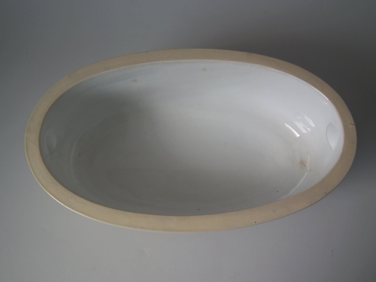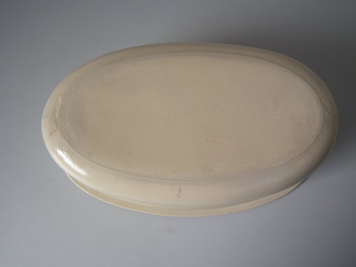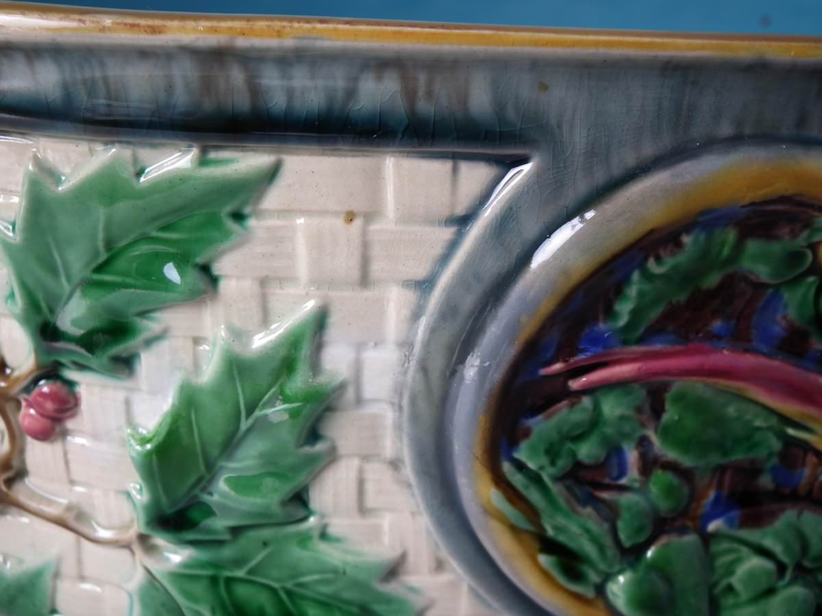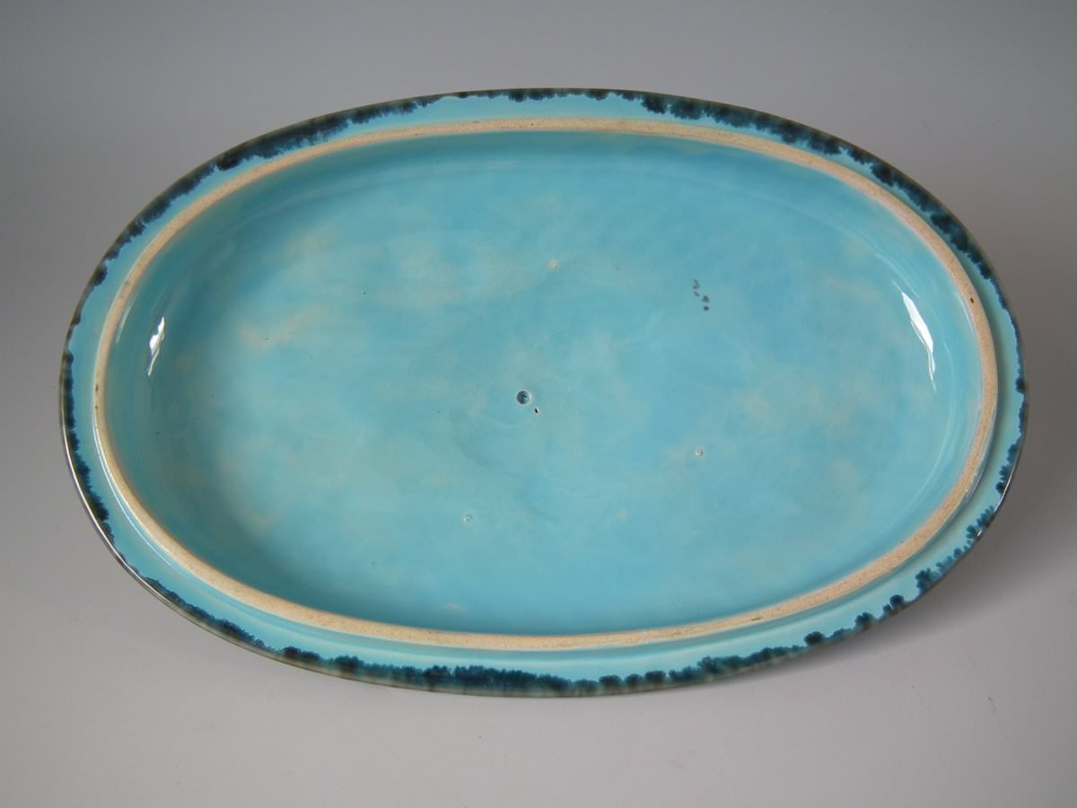 Victorian, circa 1870. 8.3ins high, 14.2ins wide, 7.3ins depth. Minton Majolica game pie dish with liner which features a hunting dog asleep next to a rifle, a powder flask and a game bag.