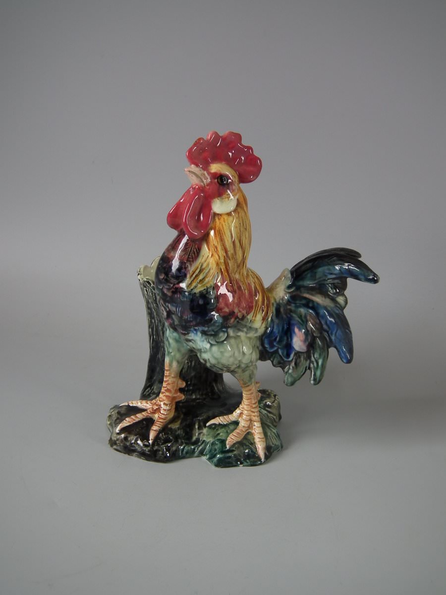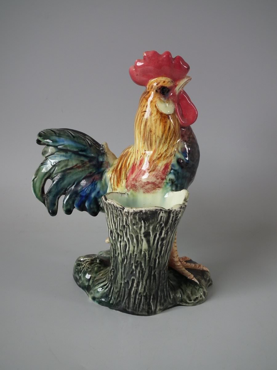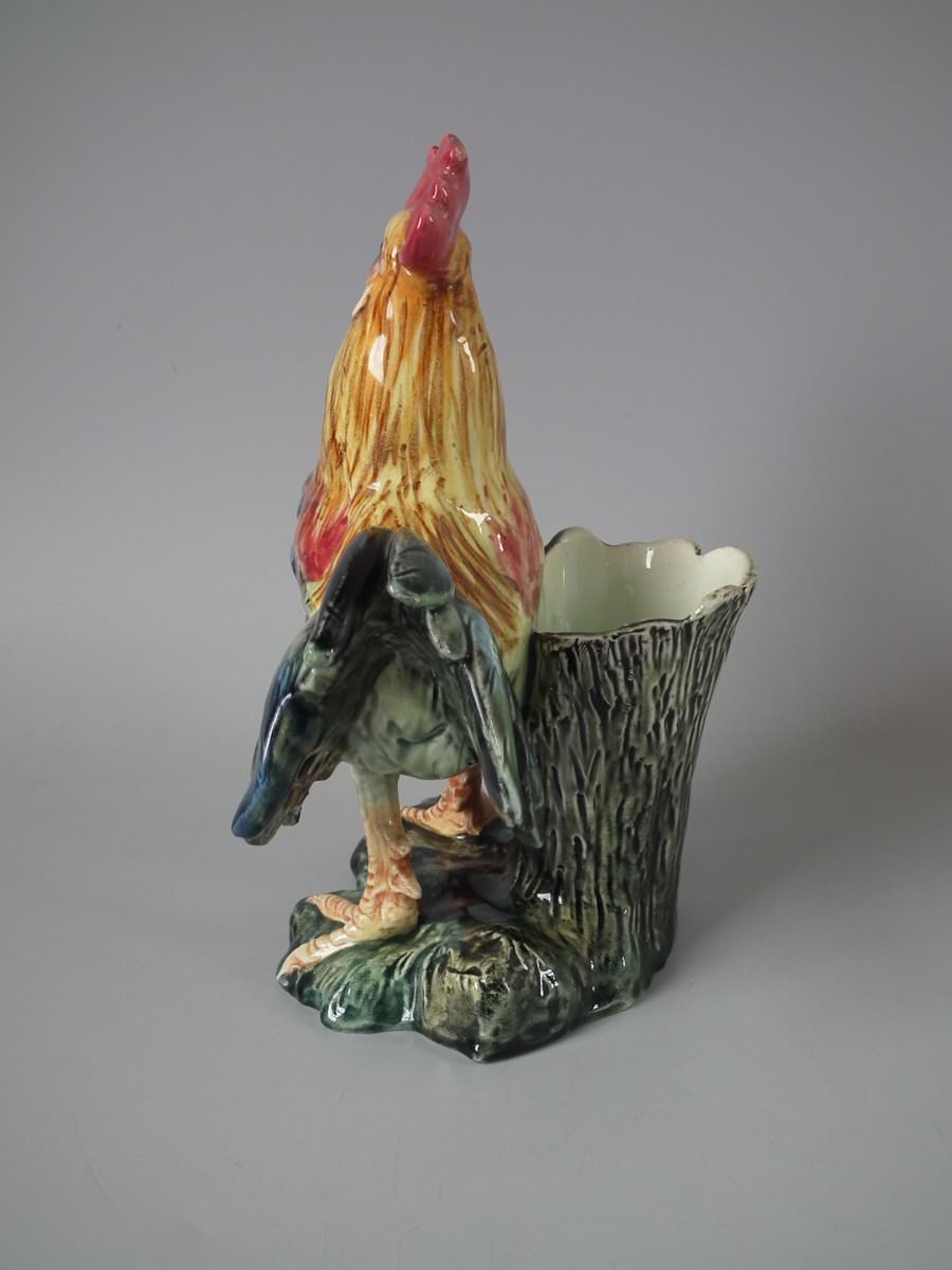 Circa 1900. 9.4ins high, 7.1ins wide, 5.5ins depth. Jerome Massier Fils Majolica vase which features a cockerel/rooster stood in front of a tree stump.