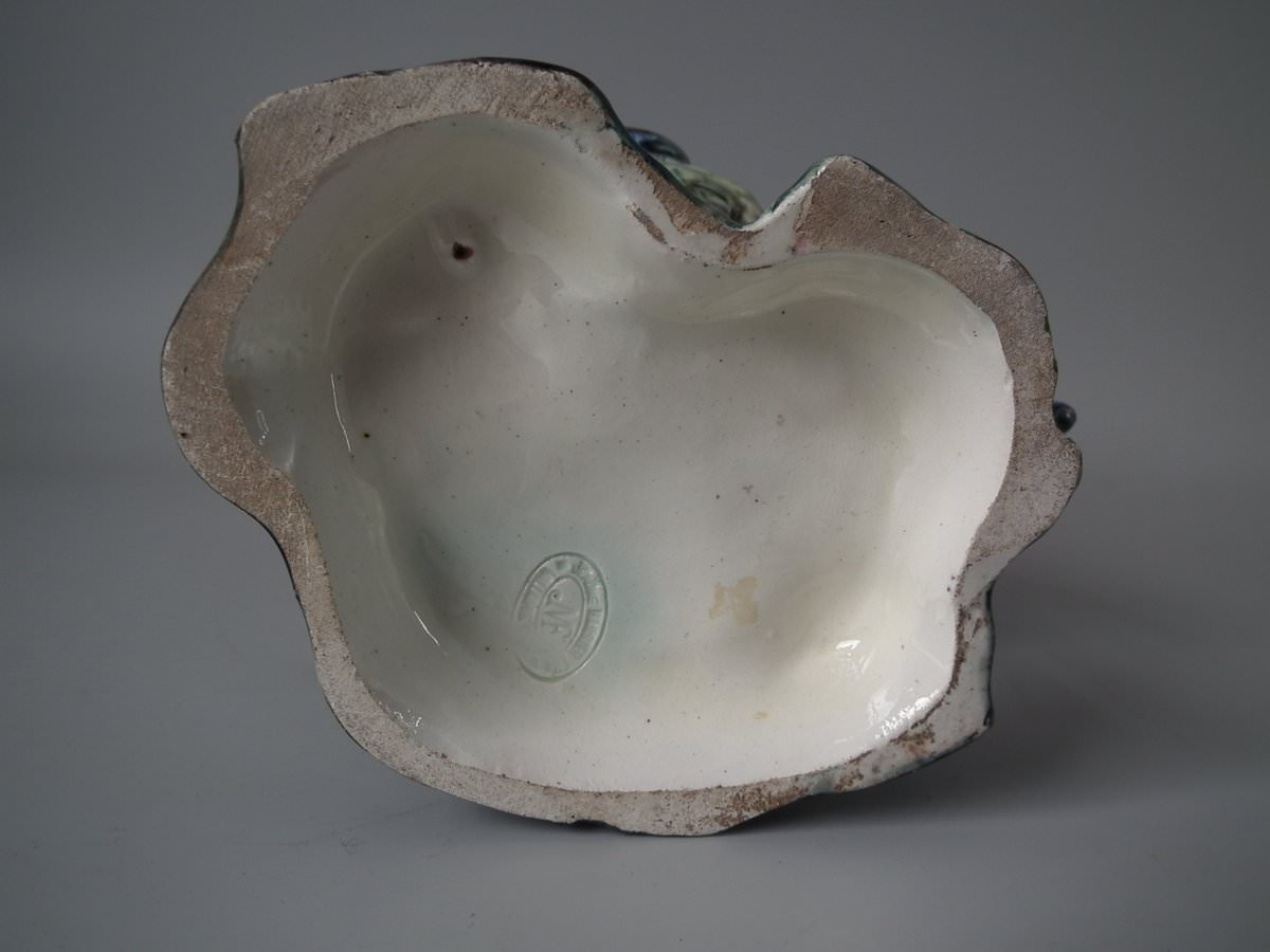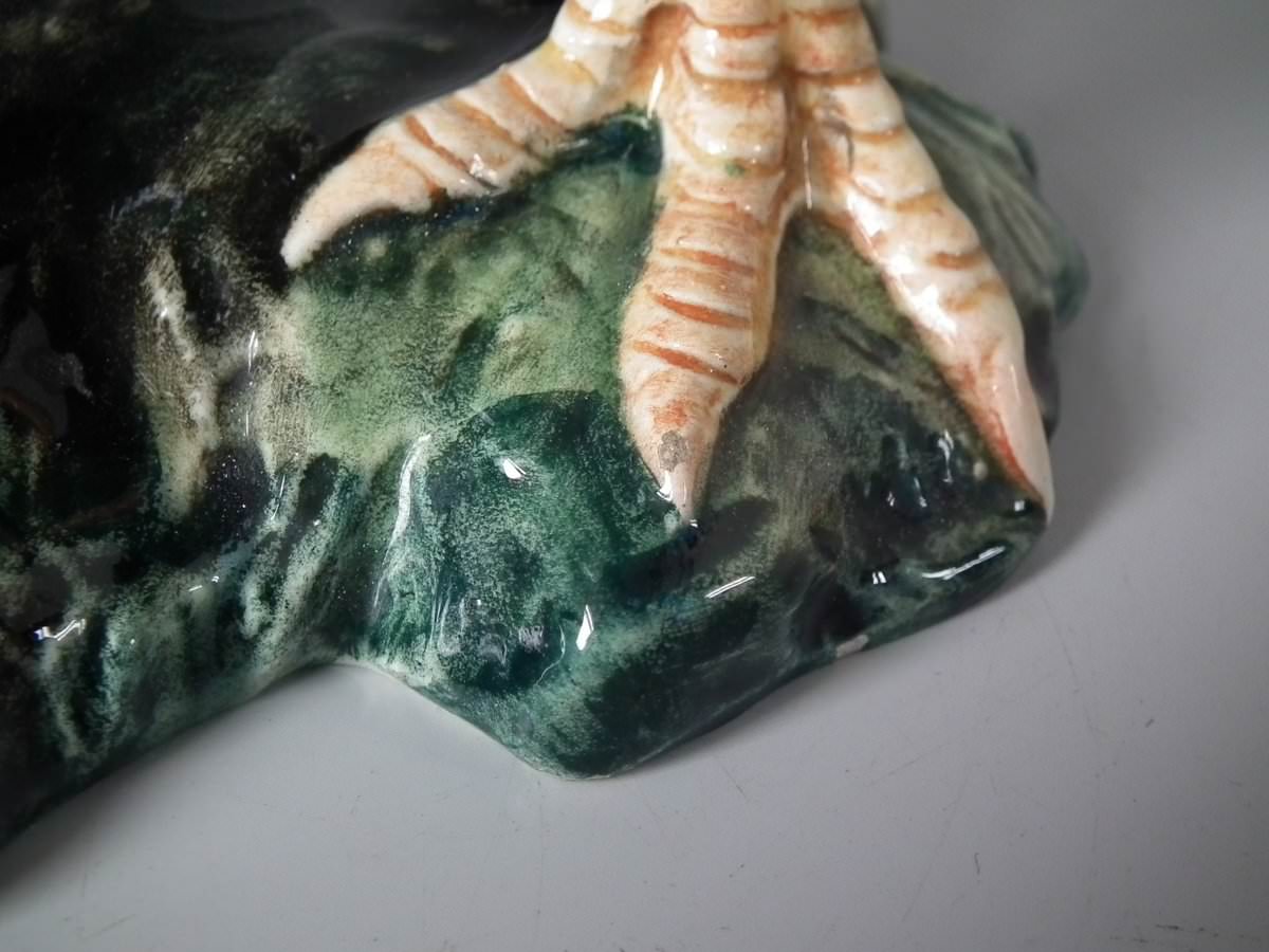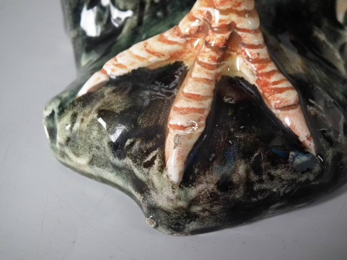 Circa 1900. 9.4ins high, 7.1ins wide, 5.5ins depth. Jerome Massier Fils Majolica vase which features a cockerel/rooster stood in front of a tree stump.
