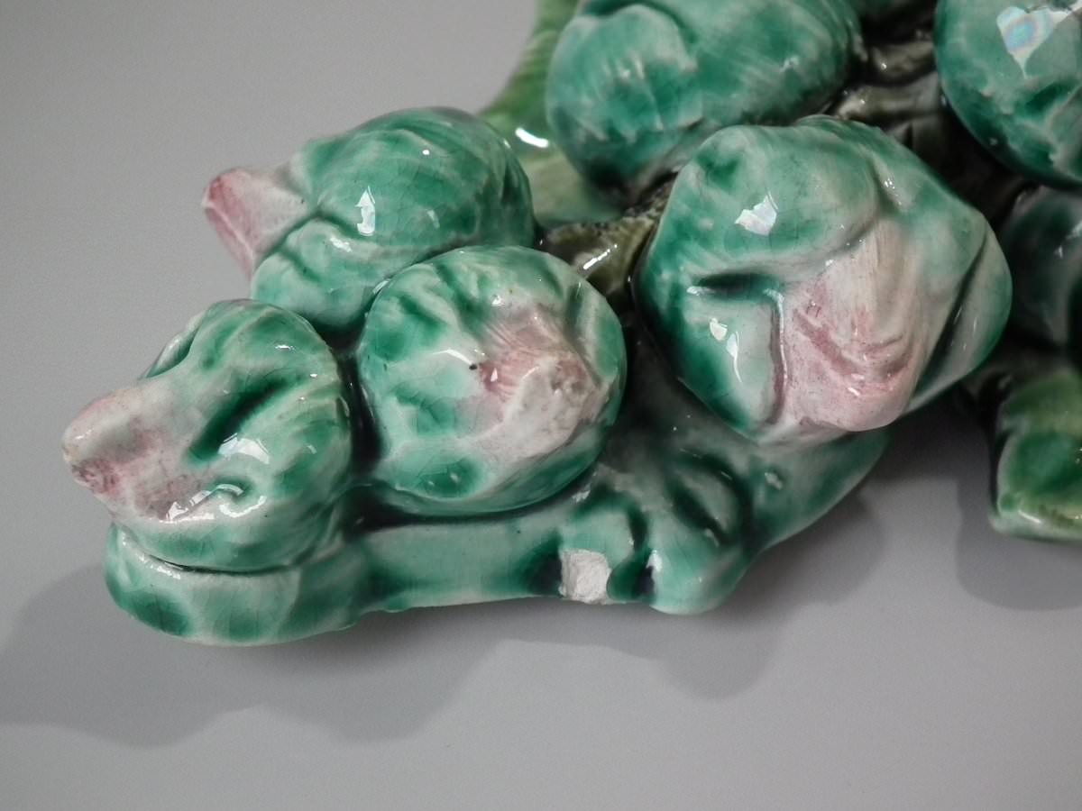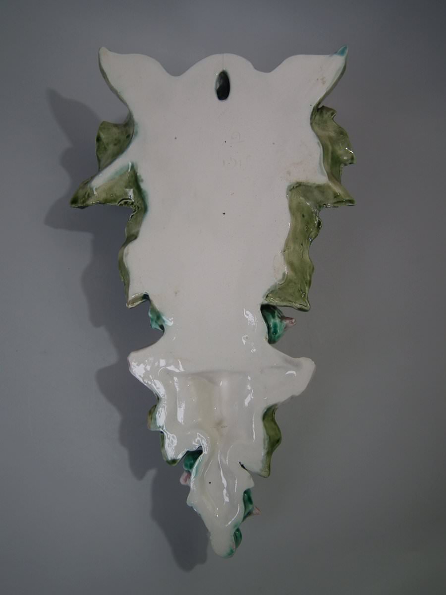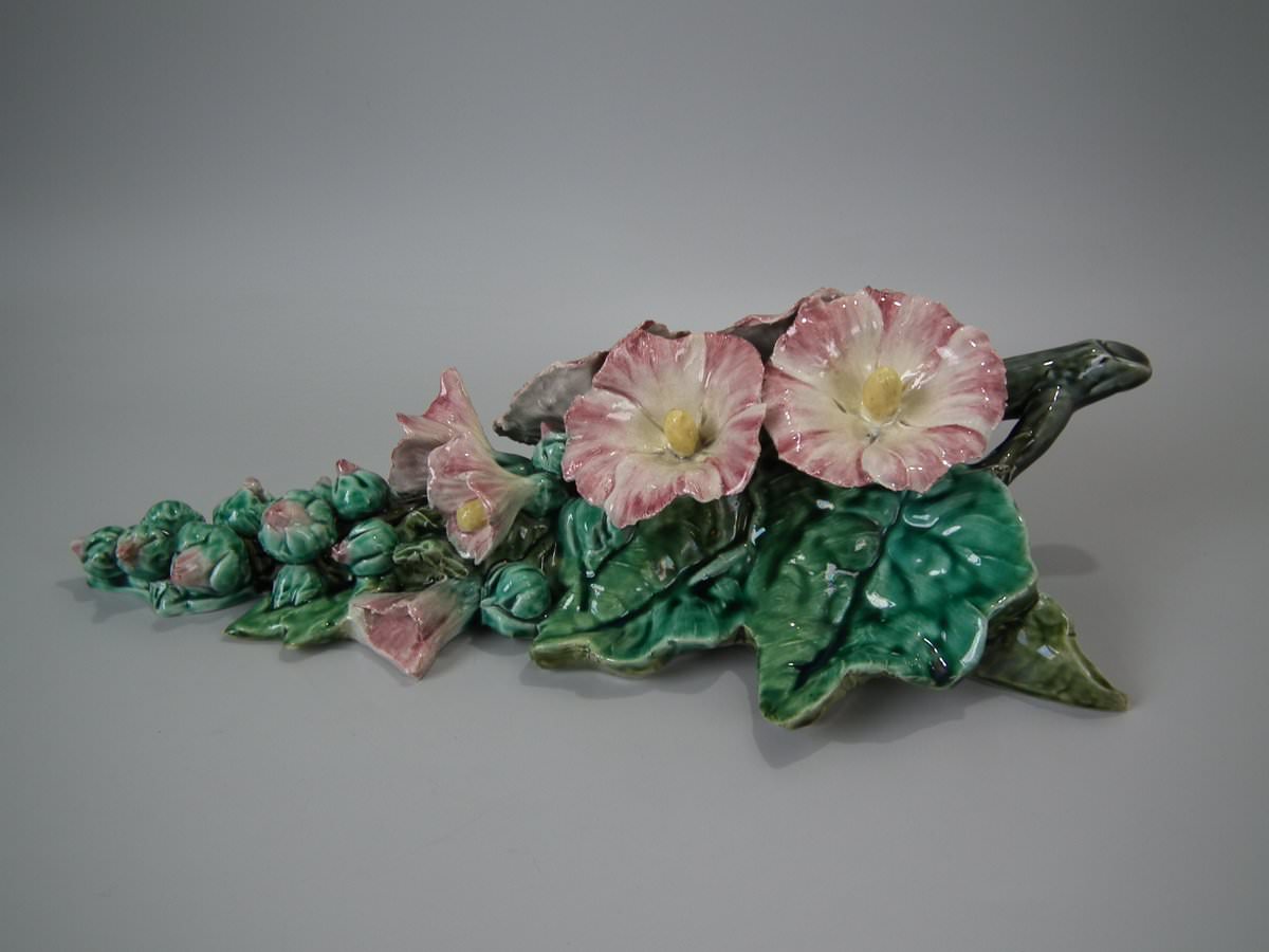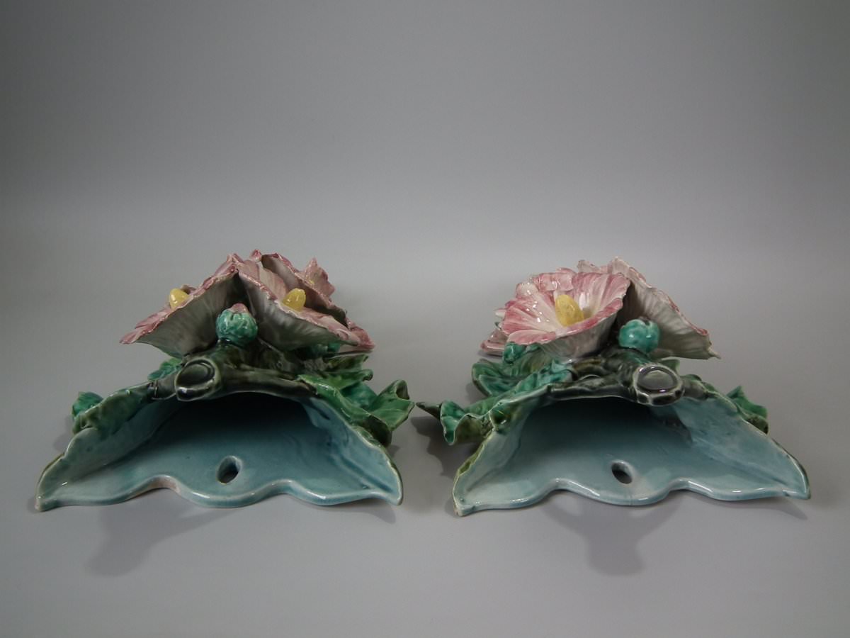 Victorian, circa 1870. Tallest is 16.1ins high, 8.7ins wide, 5.1ins depth. Pair of Majolica wall pockets which feature Hollyhock flowers and leaves.