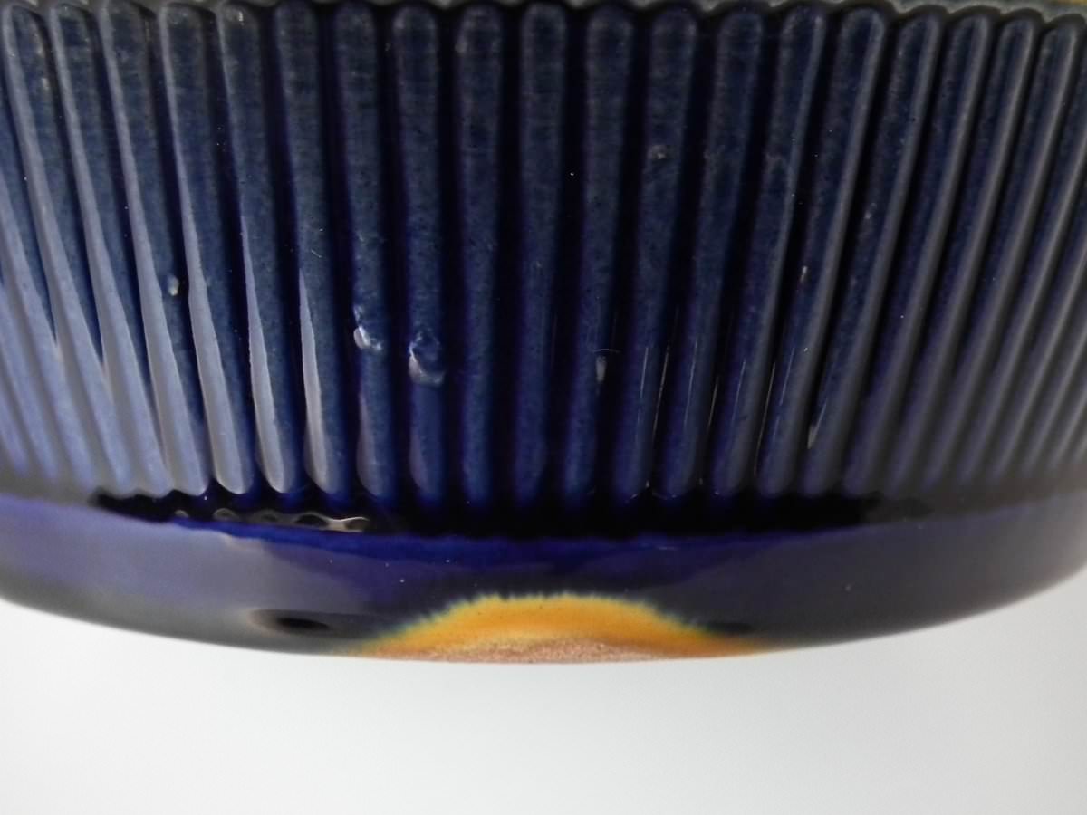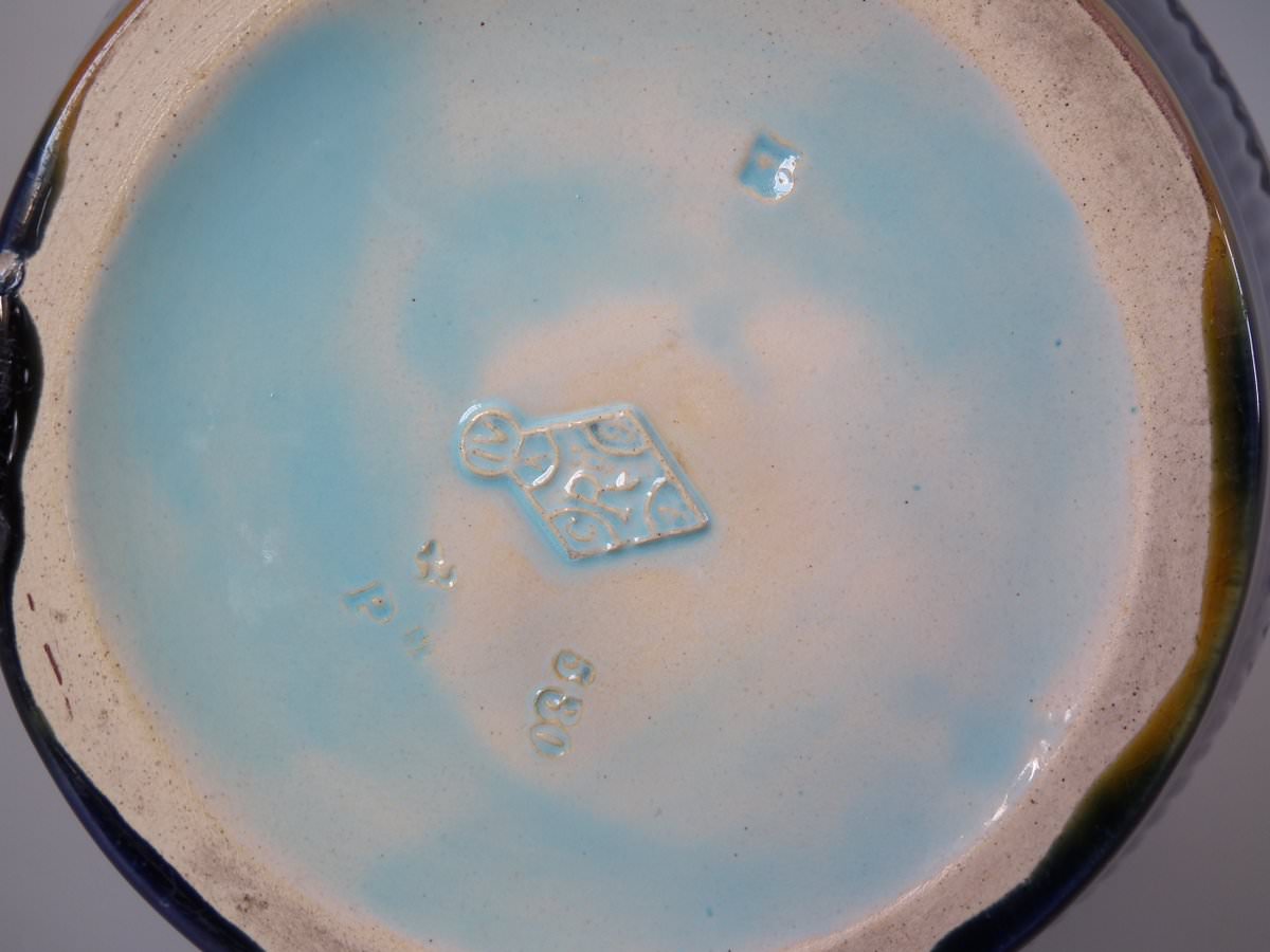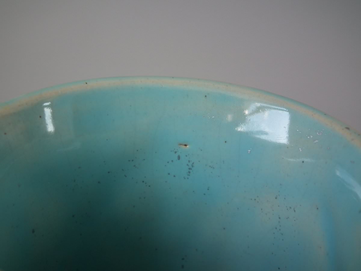glaze run to some of the green and ochre enamel.