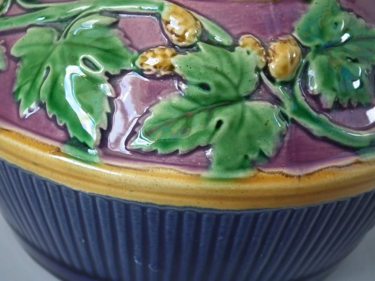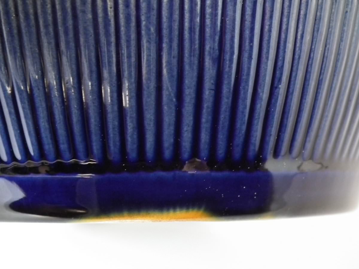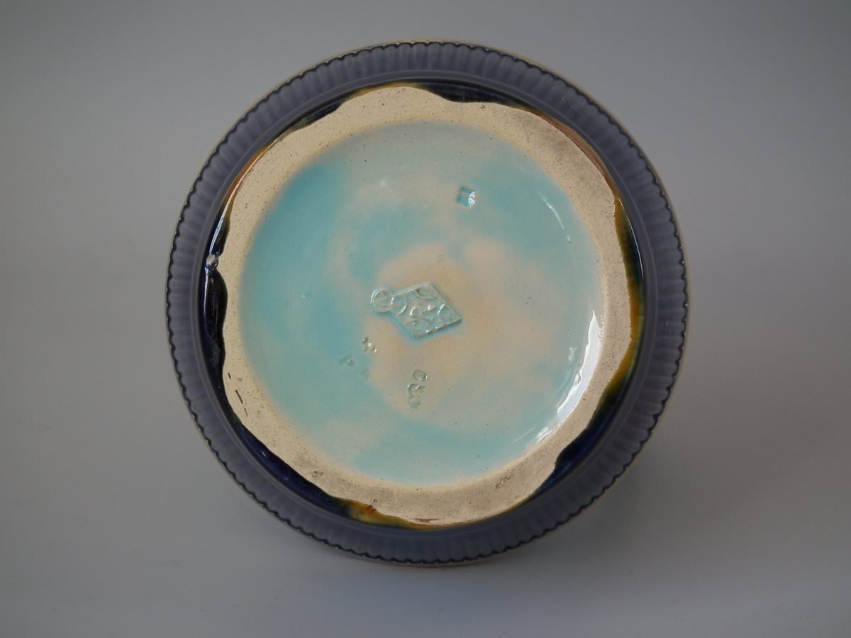 glaze run to some of the green and ochre enamel.