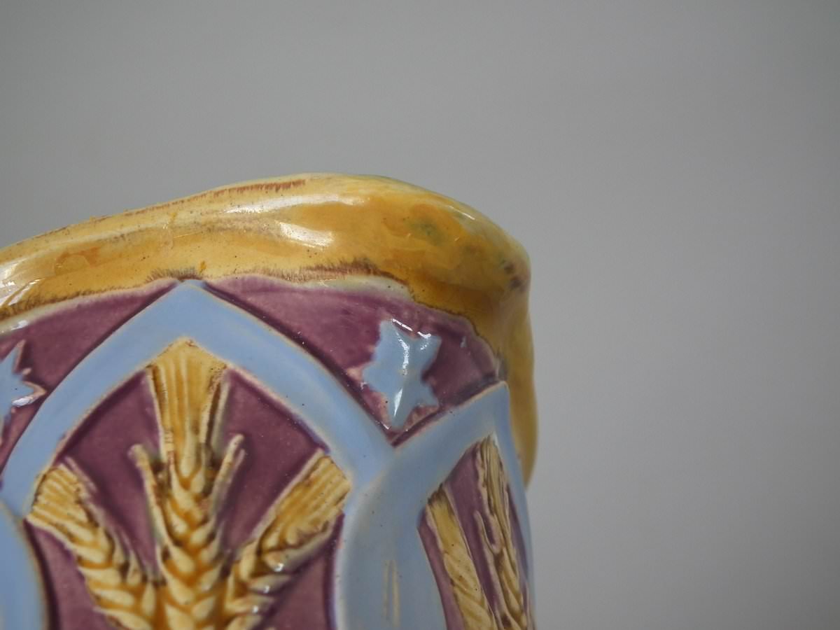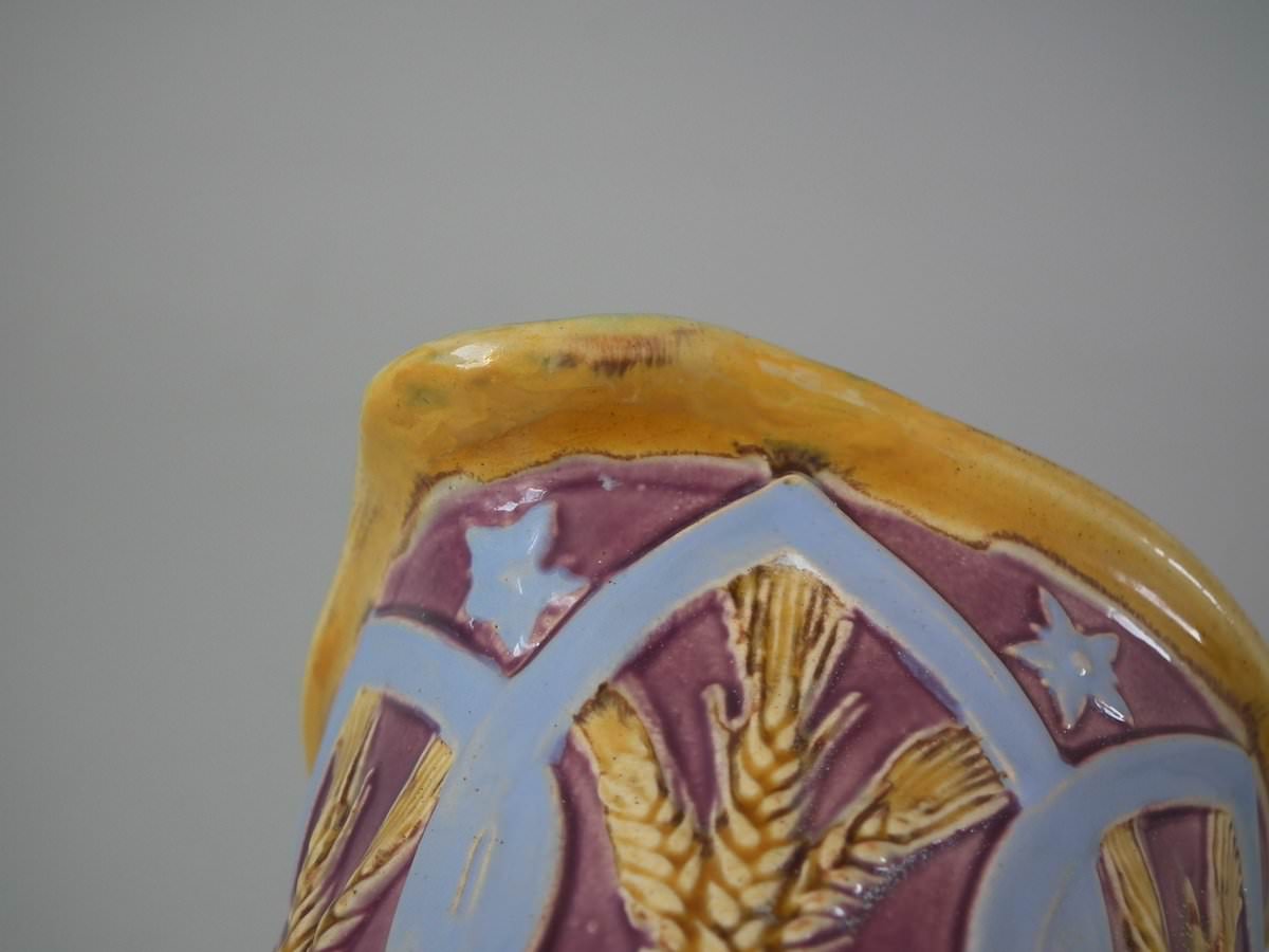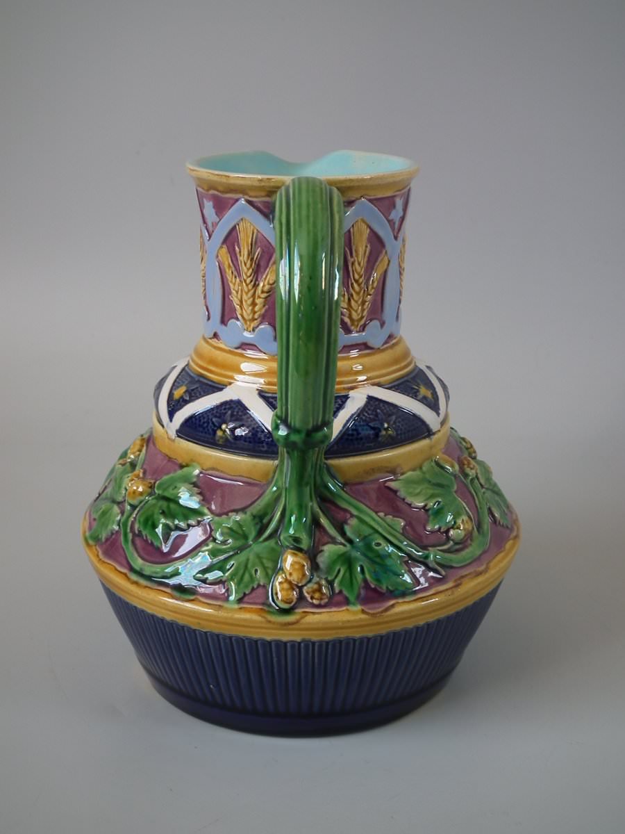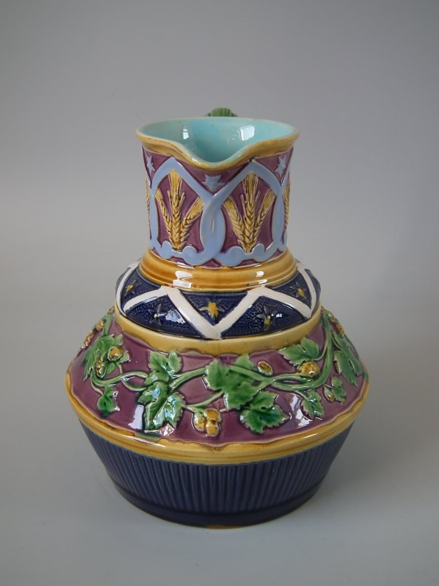 Victorian, circa 1857. 7.1ins high, 5.9ins wide, 5.9ins depth. Minton Majolica jug/pitcher which features wheat and hops.