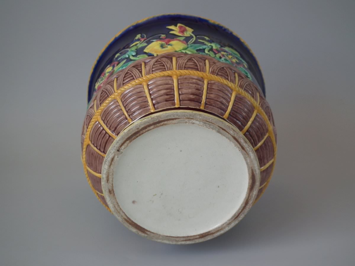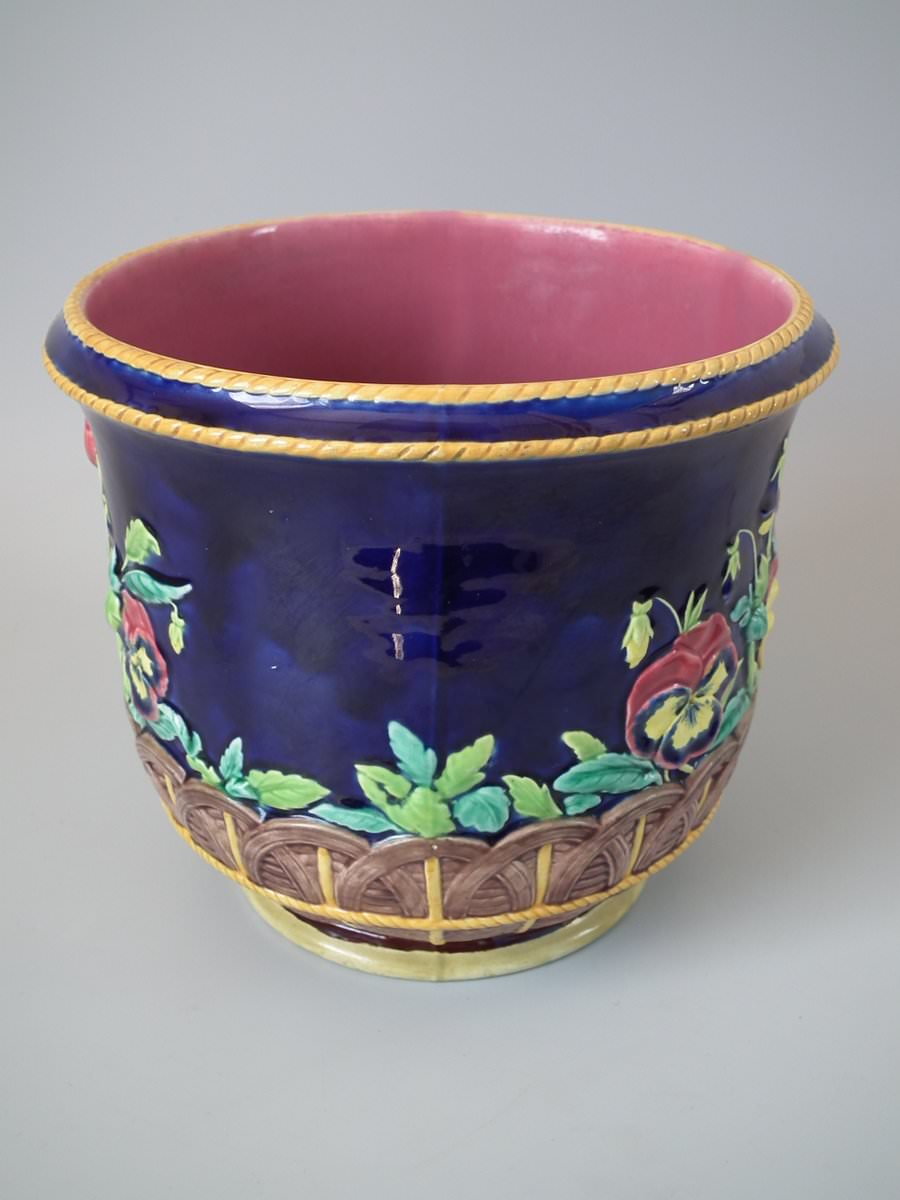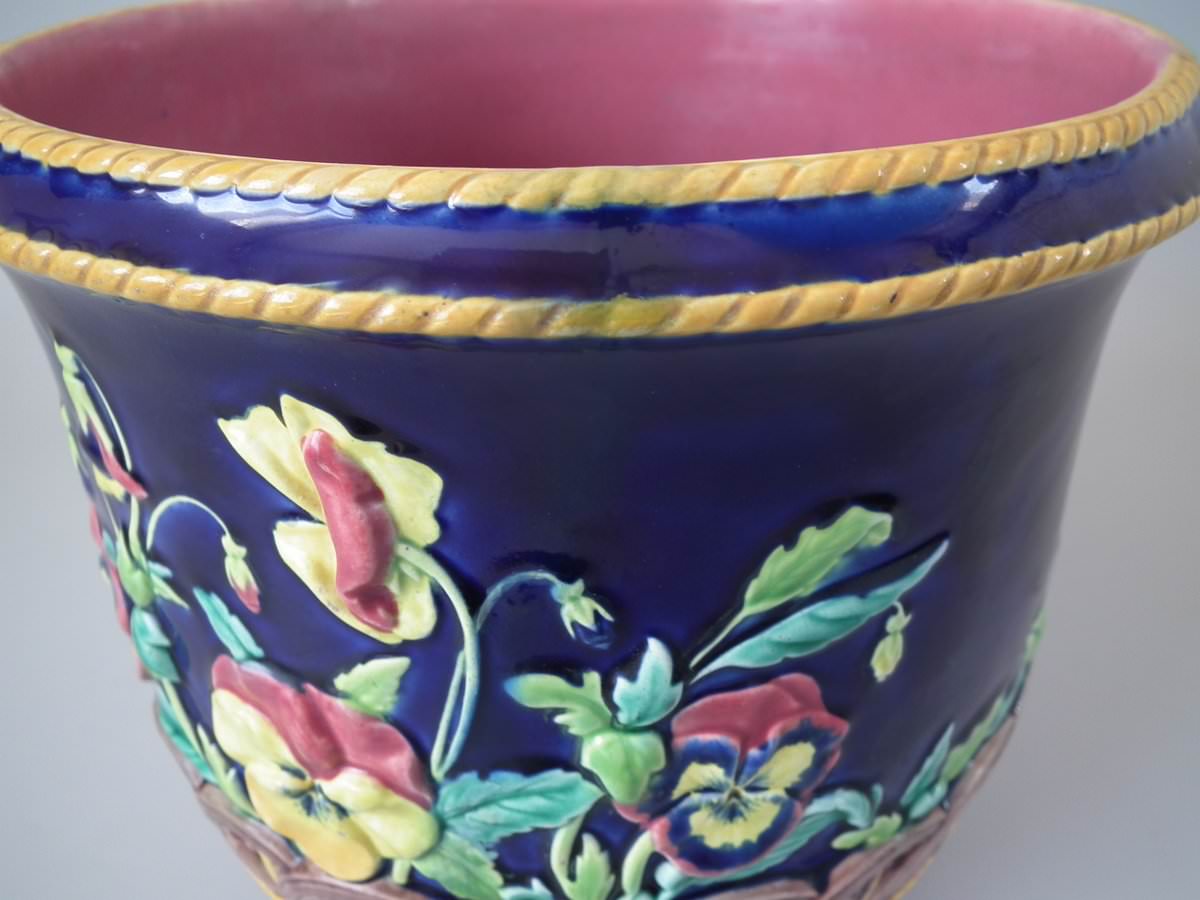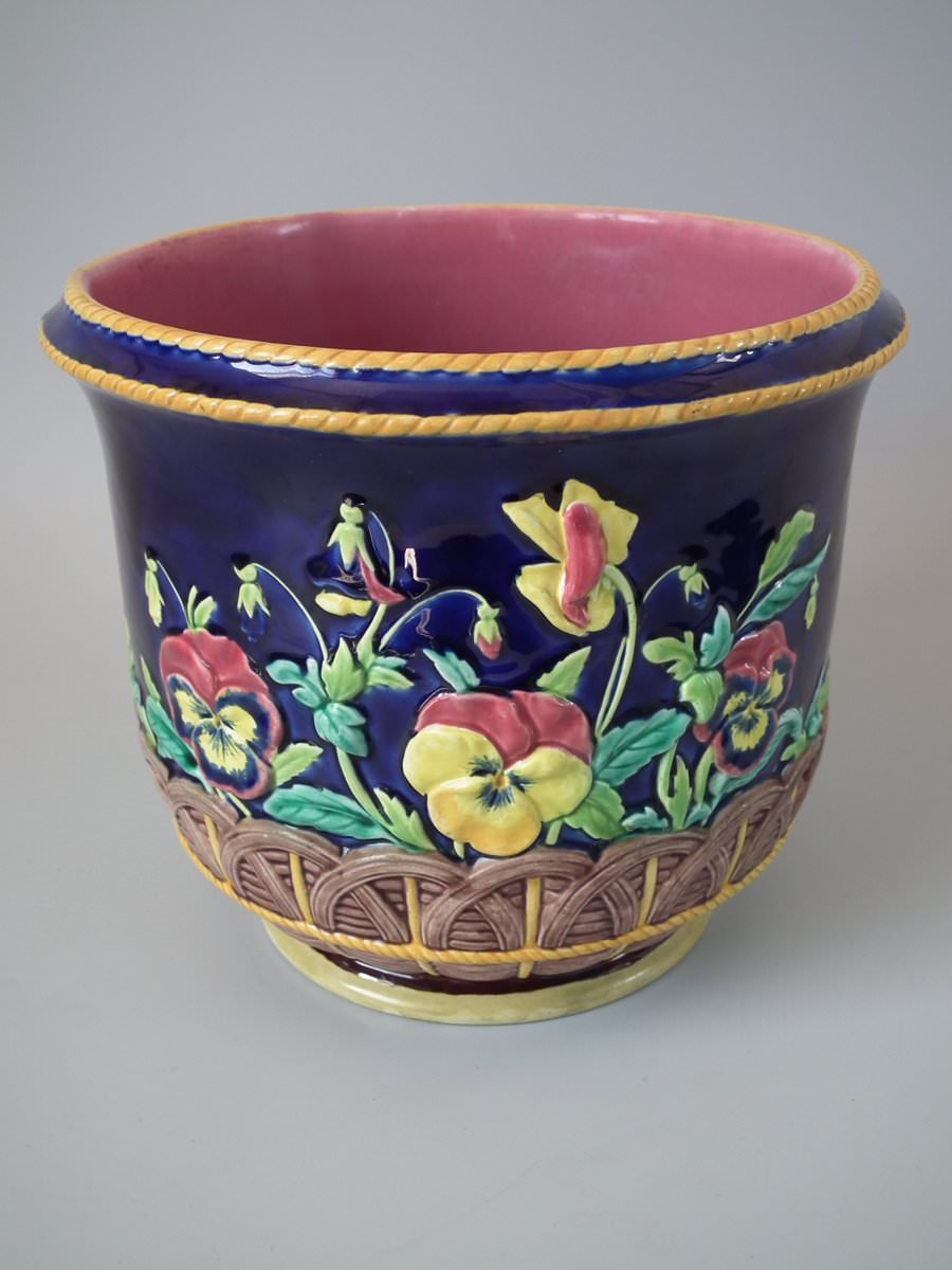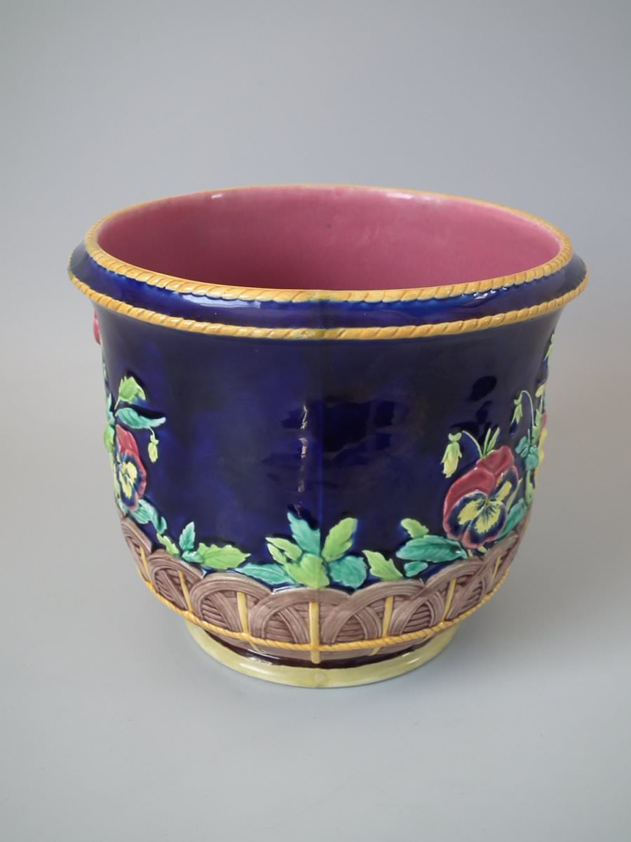 Victorian, circa 1880. 7.5ins high, 8.7ins wide, 8.7ins depth. Copeland Majolica jardinière which features pansy's growing from a woven basket border.