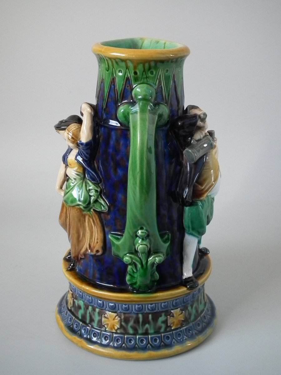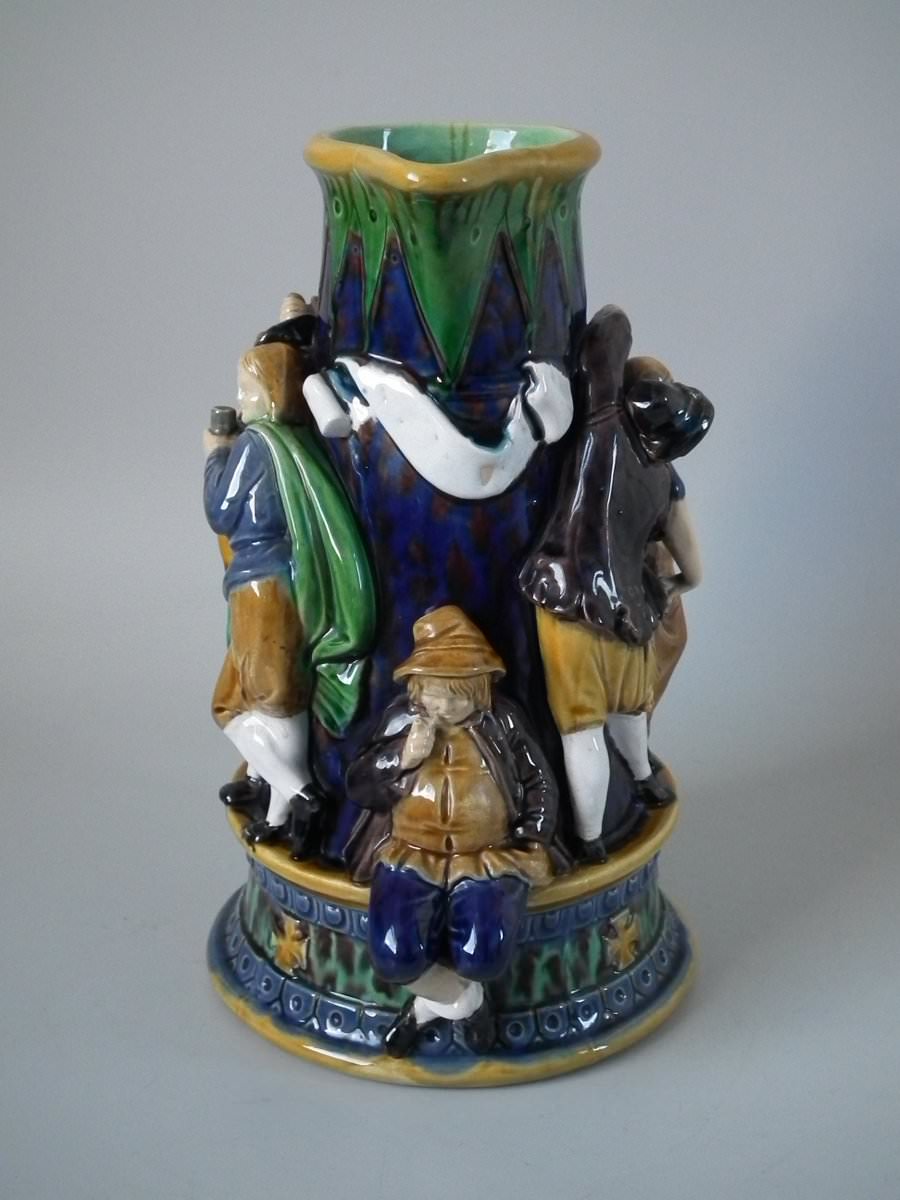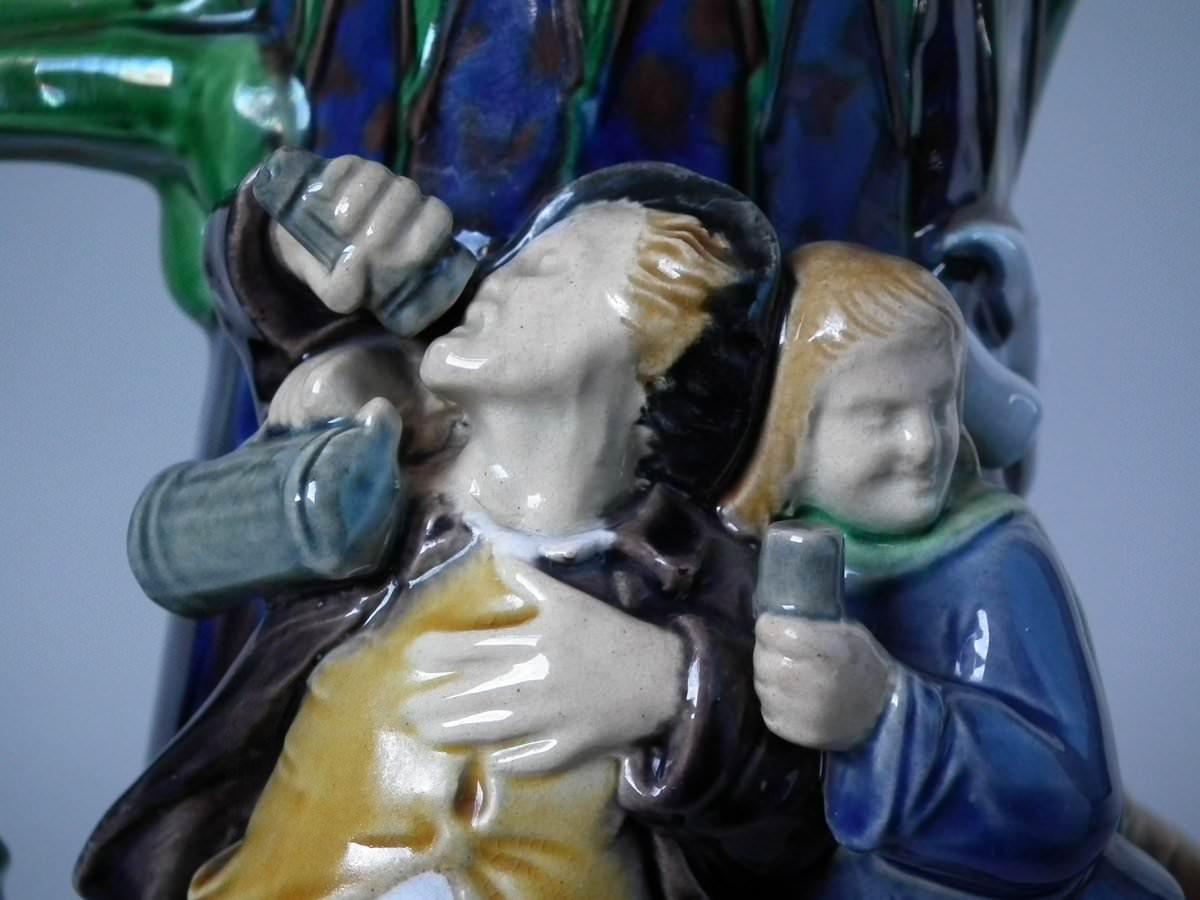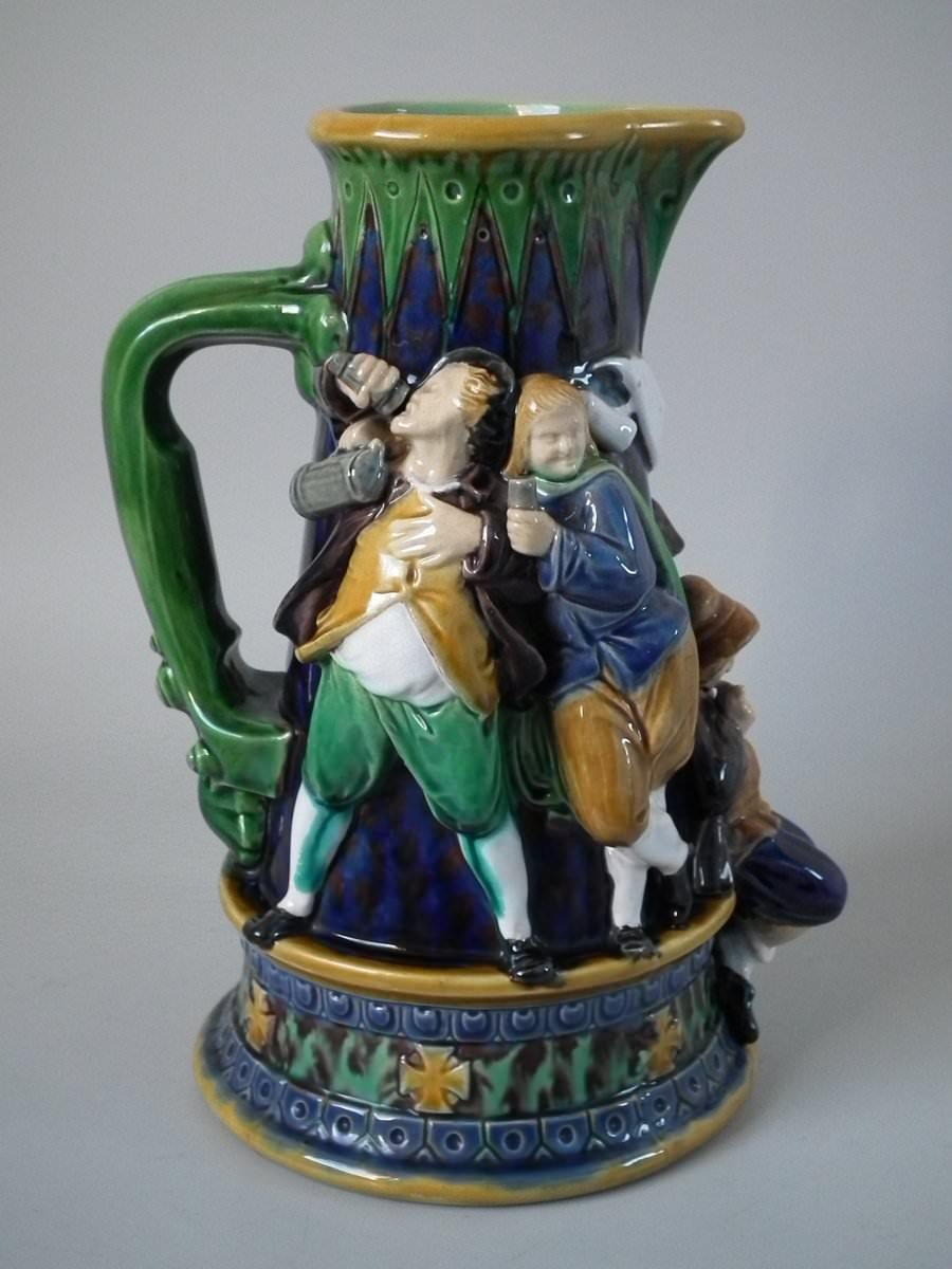 Victorian, circa 1869. 10.2ins high, 7.1ins wide, 6.1ins depth. Minton Majolica jug/pitcher which features drinking and dancing figures.
