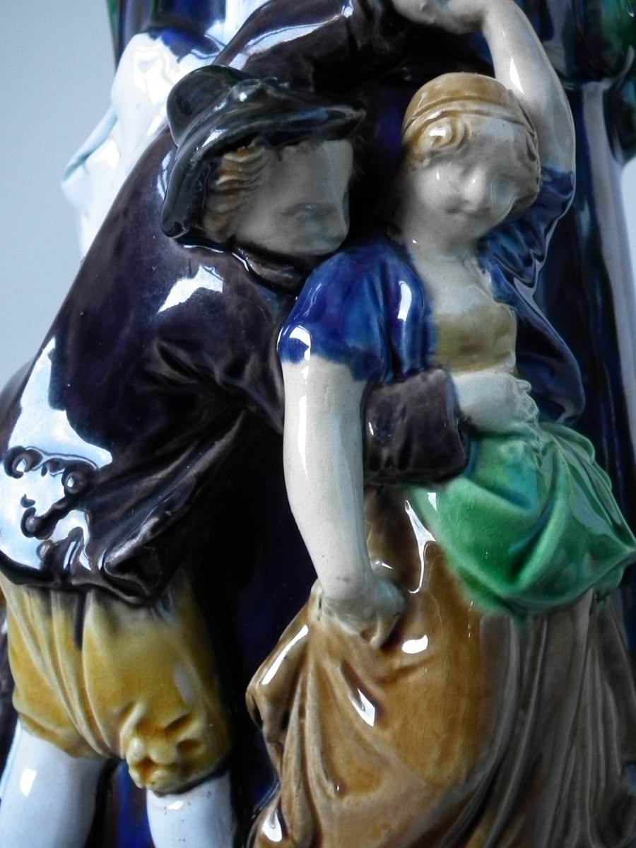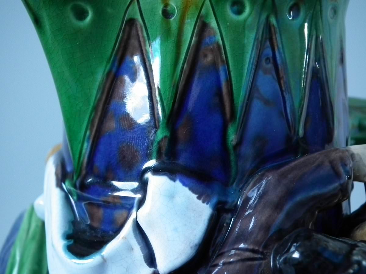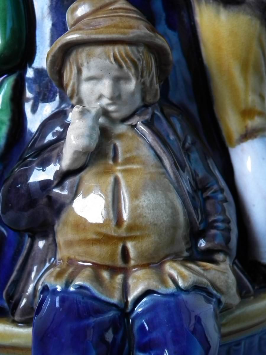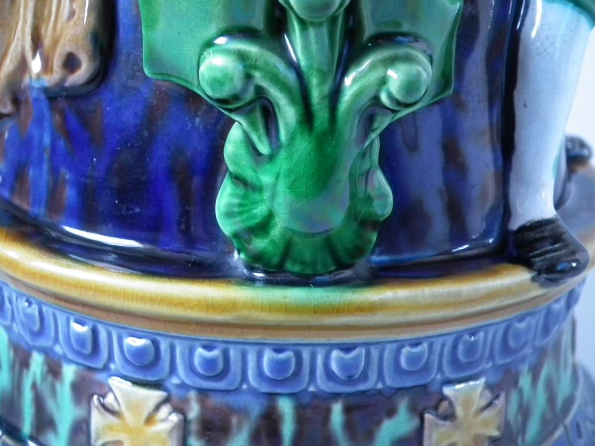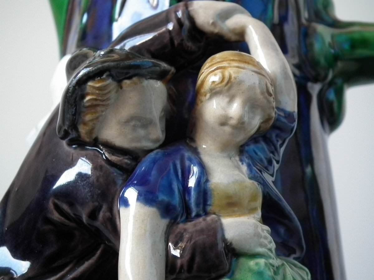 Victorian, circa 1869. 10.2ins high, 7.1ins wide, 6.1ins depth. Minton Majolica jug/pitcher which features drinking and dancing figures.