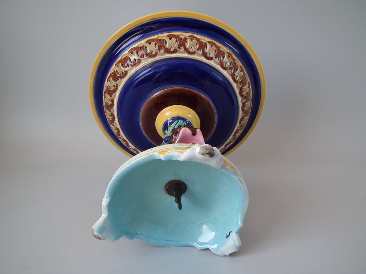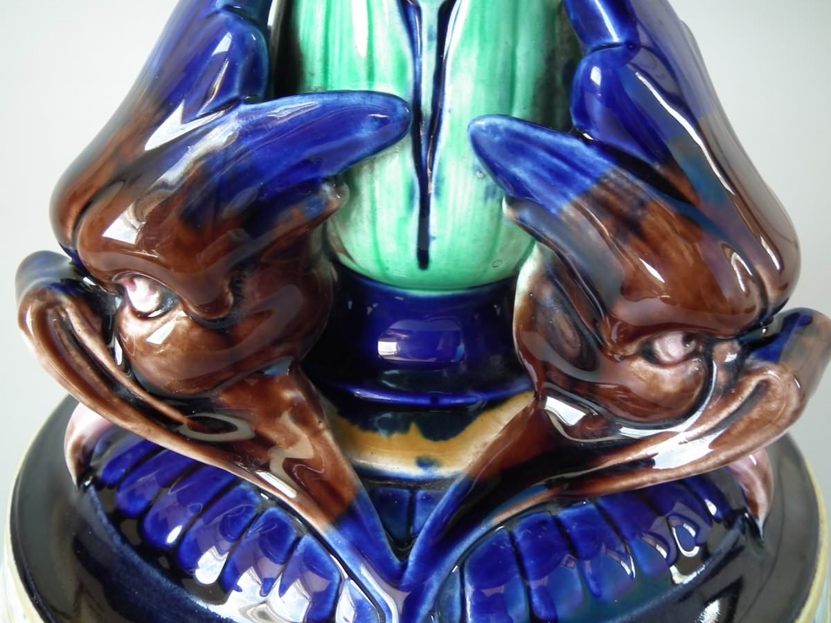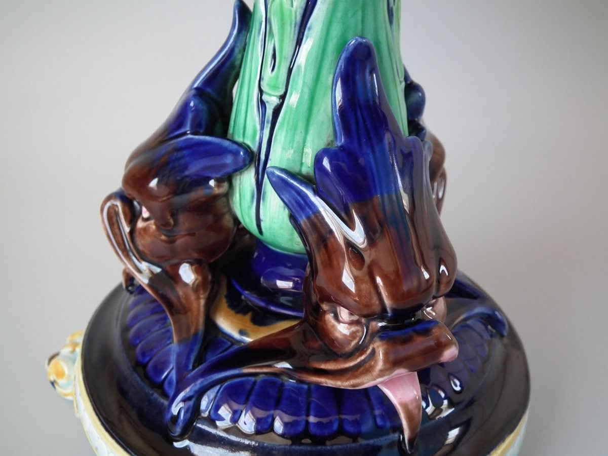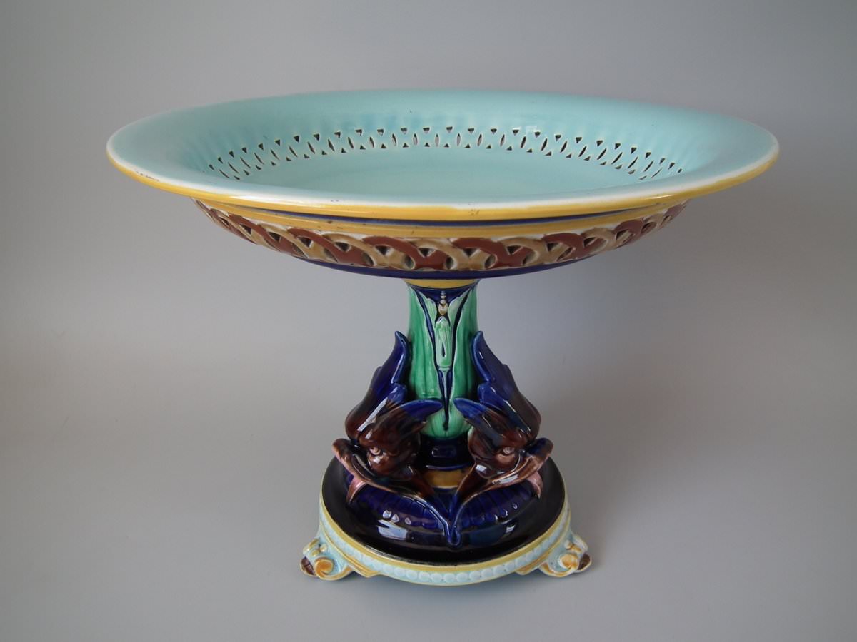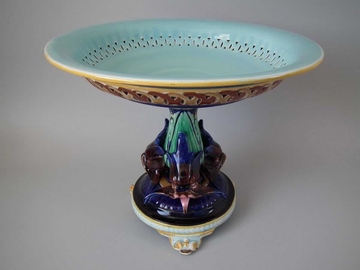 Circa 1890. 10.2ins high, 12.6ins wide, 12.6ins depth. Sarreguemines Majolica compote which features mythical dolphin heads around he base.