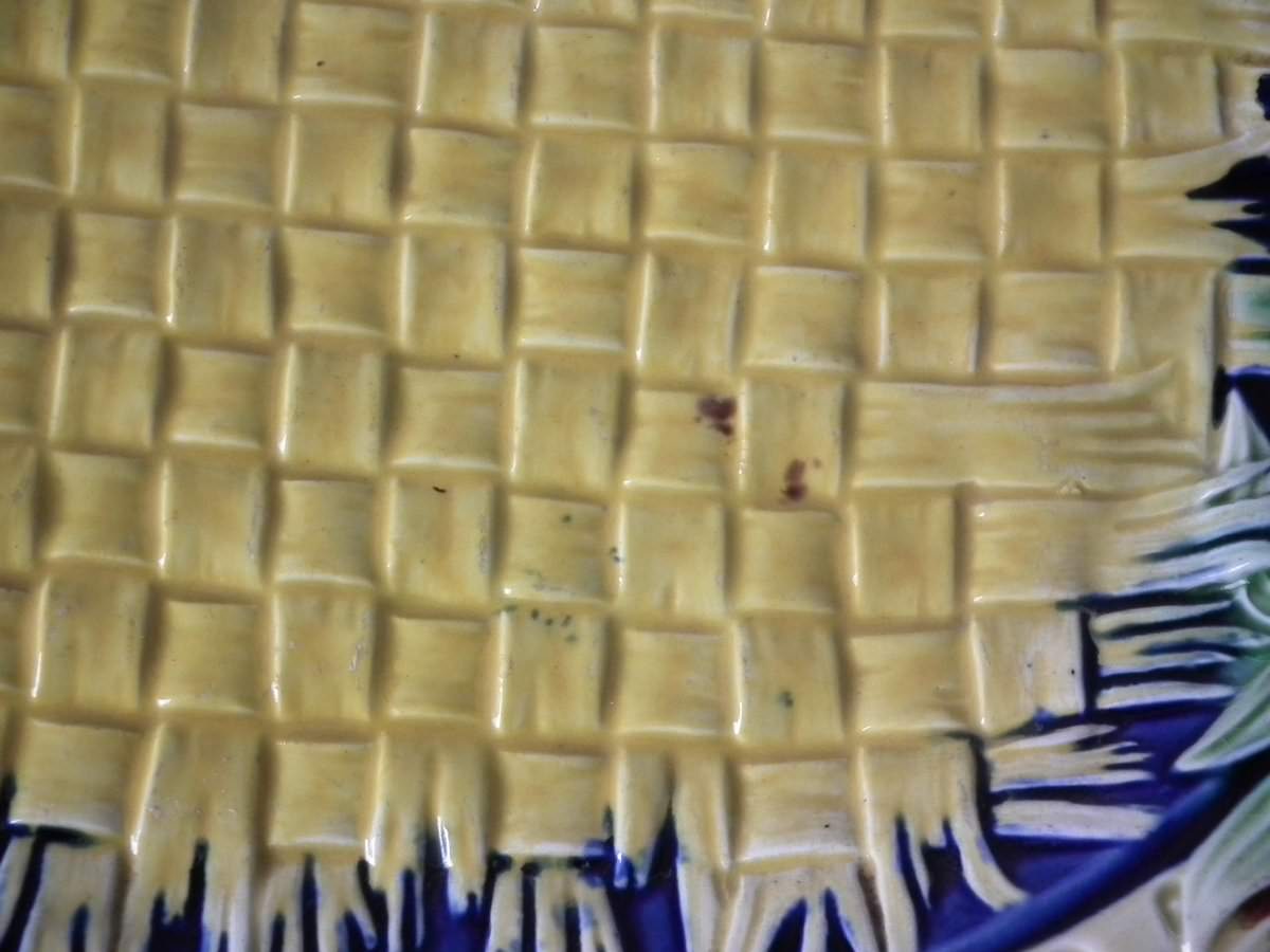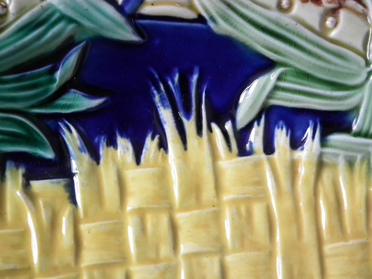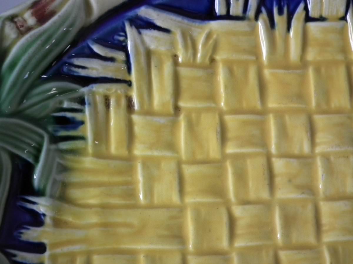 Victorian, circa 1877. 9.8ins high, 12.4ins wide, 1.6ins depth. Wedgwood Majolica bread platter which features a basketweave blanket to the centre, bamboo handles.