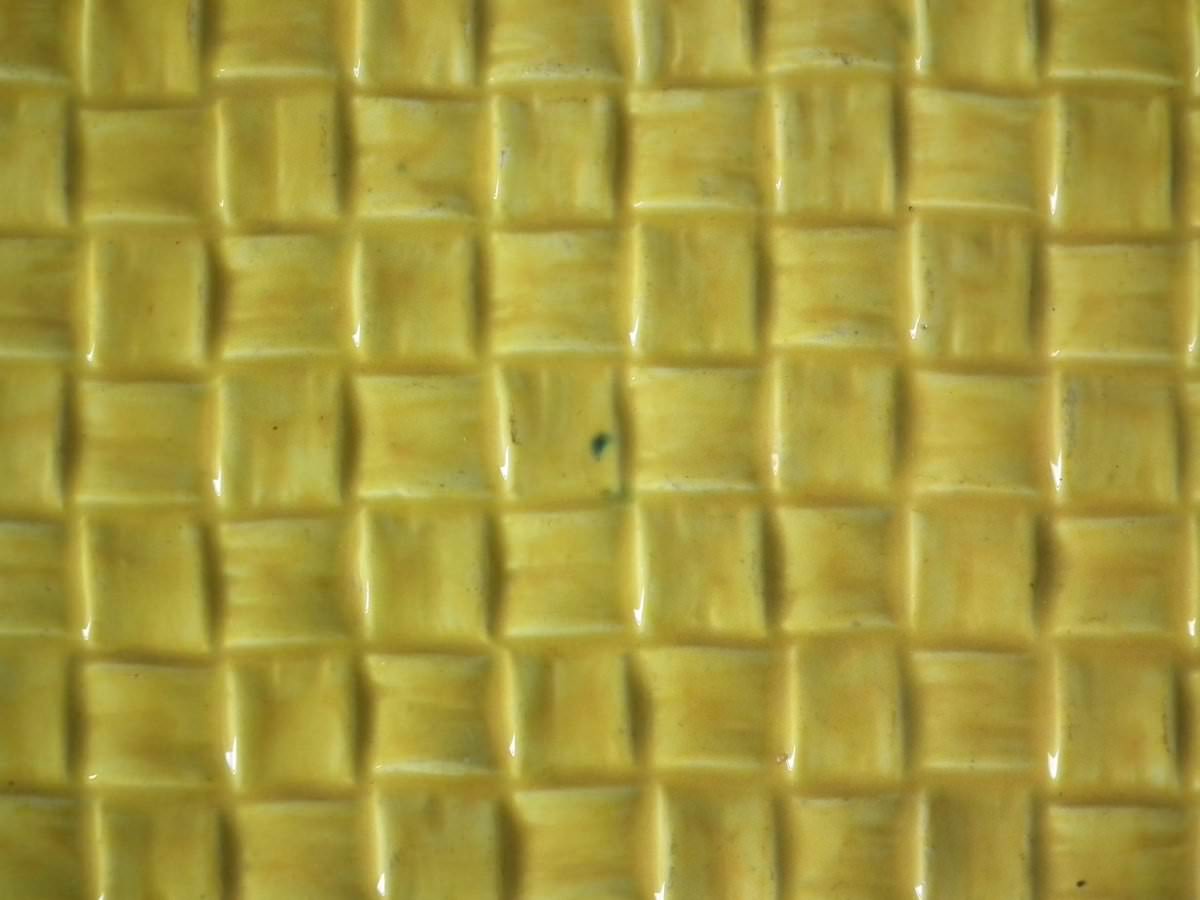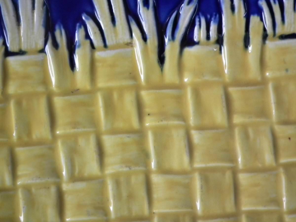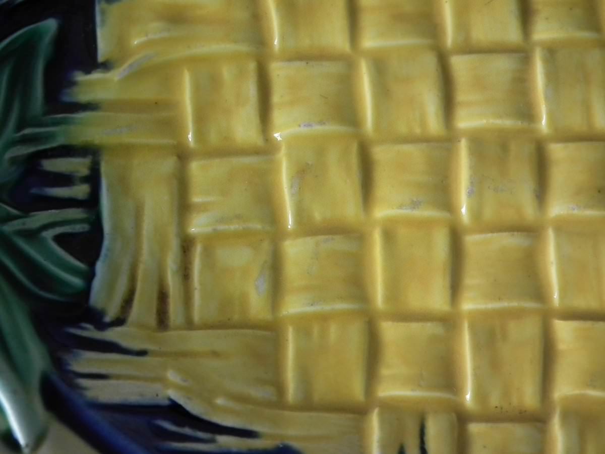 Victorian, circa 1877. 9.8ins high, 12.4ins wide, 1.6ins depth. Wedgwood Majolica bread platter which features a basketweave blanket to the centre, bamboo handles.