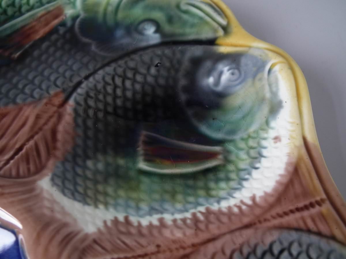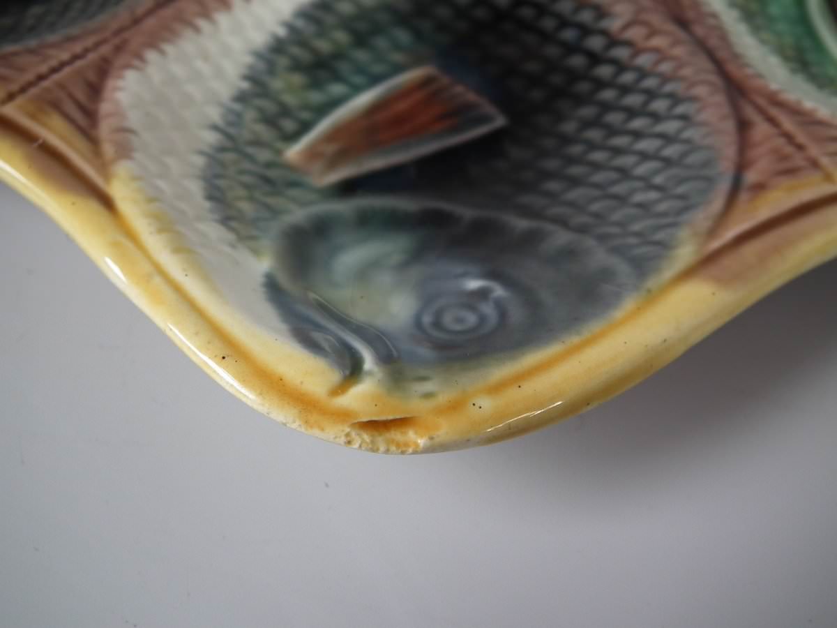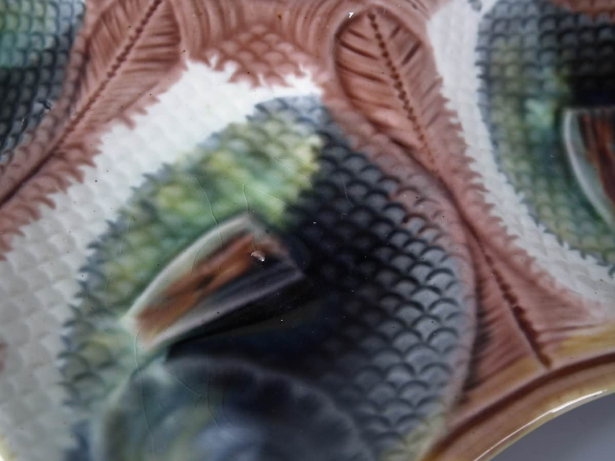Victorian, circa 1870. 9.4ins high, 10ins wide, 0.8ins depth. Adams & Bromley Majolica oyster plate which features six oyster wells moulded as fish heads, a larger fish to the rim.