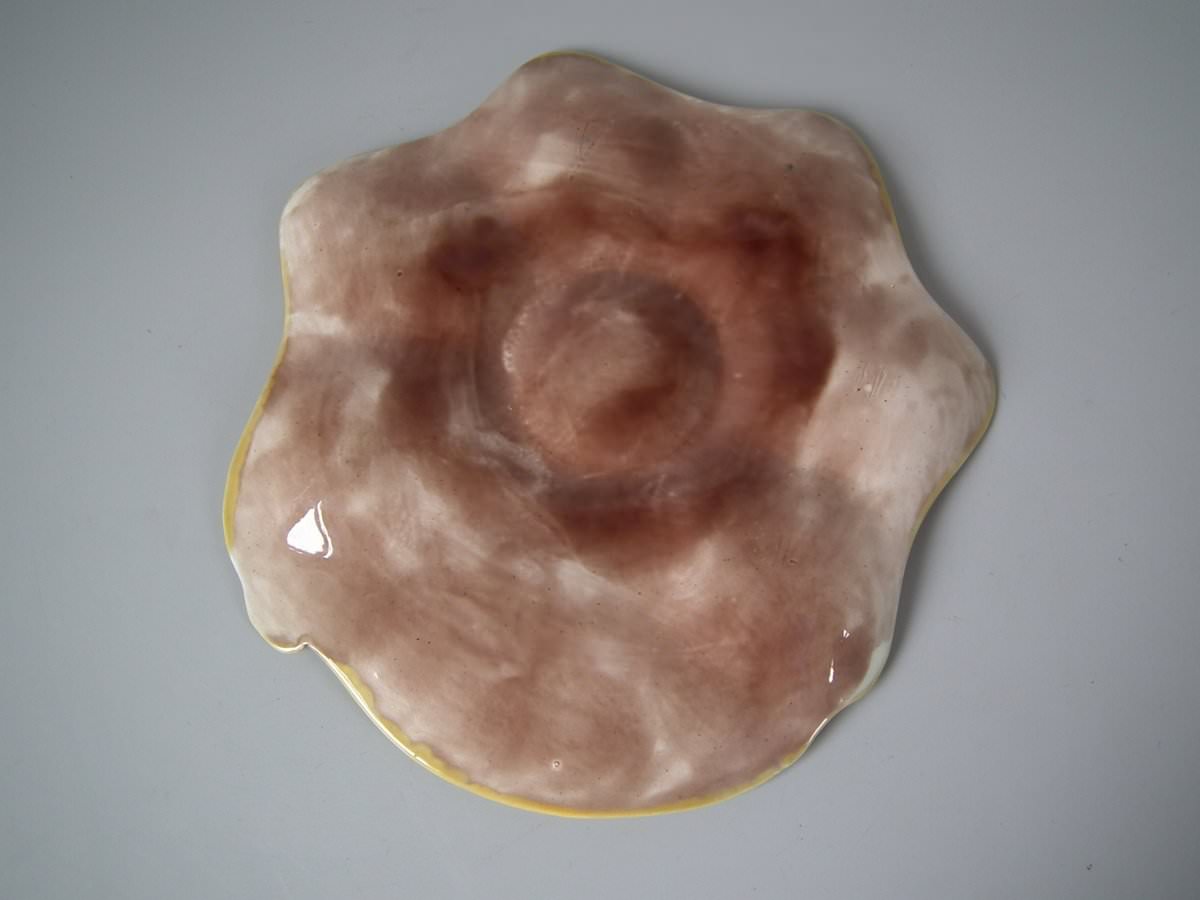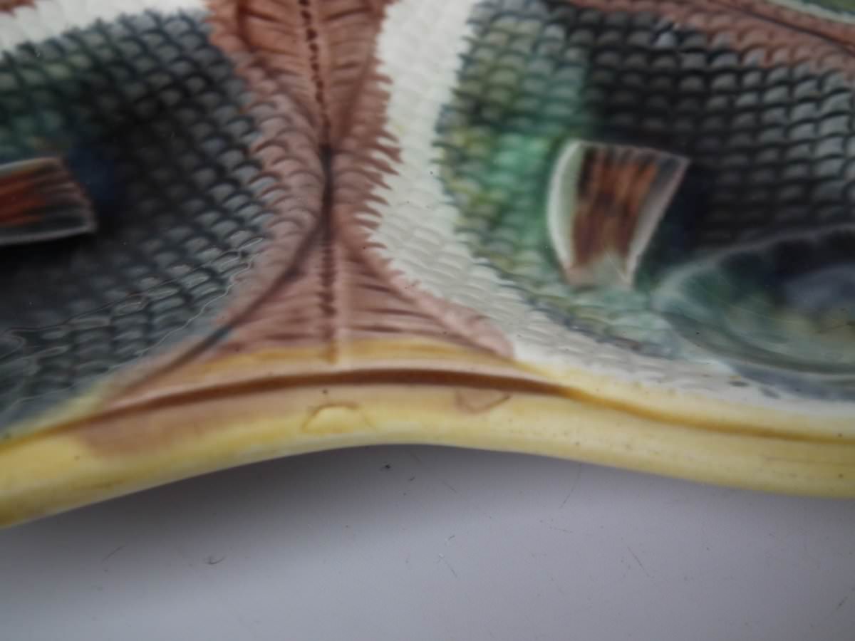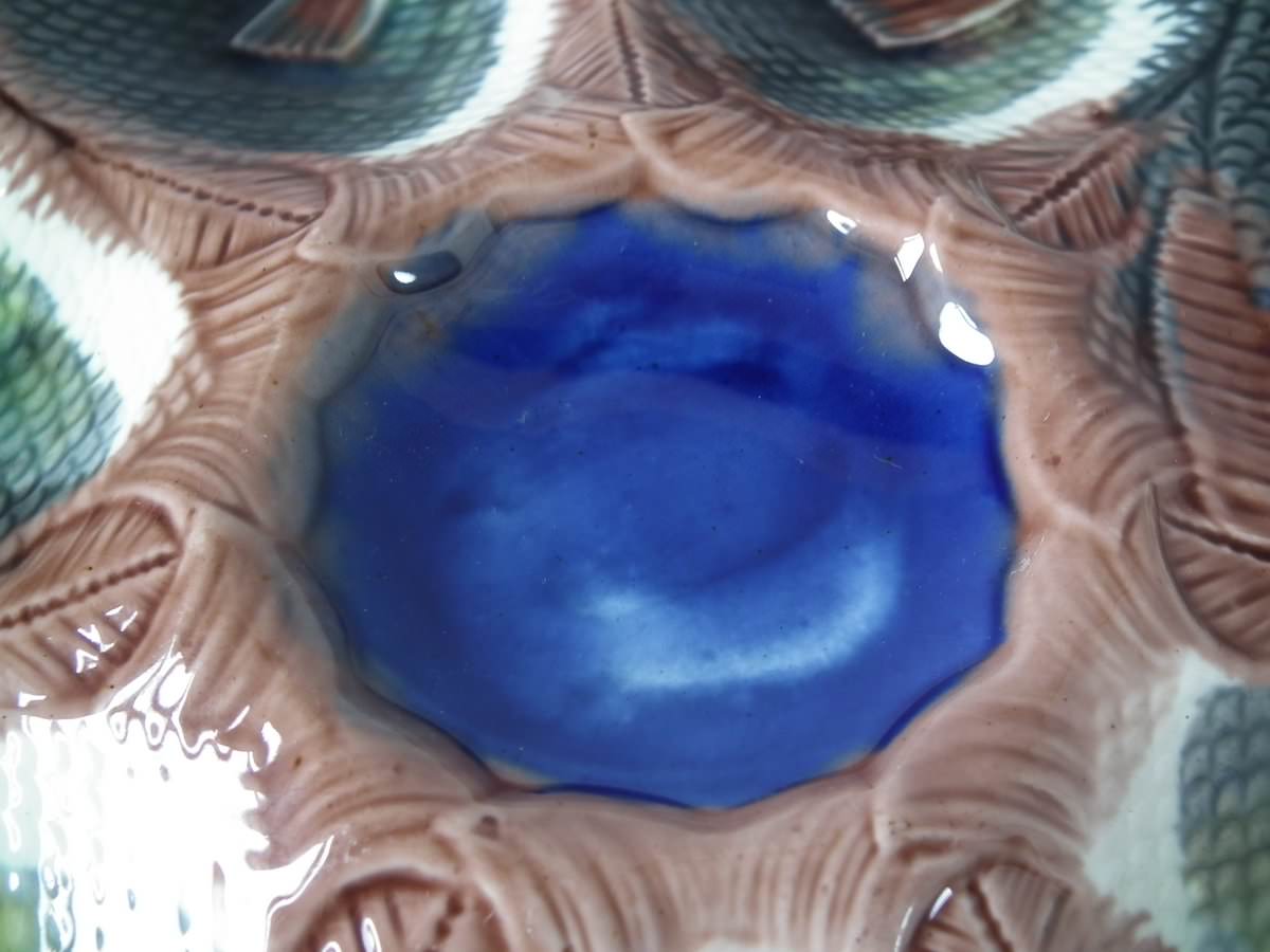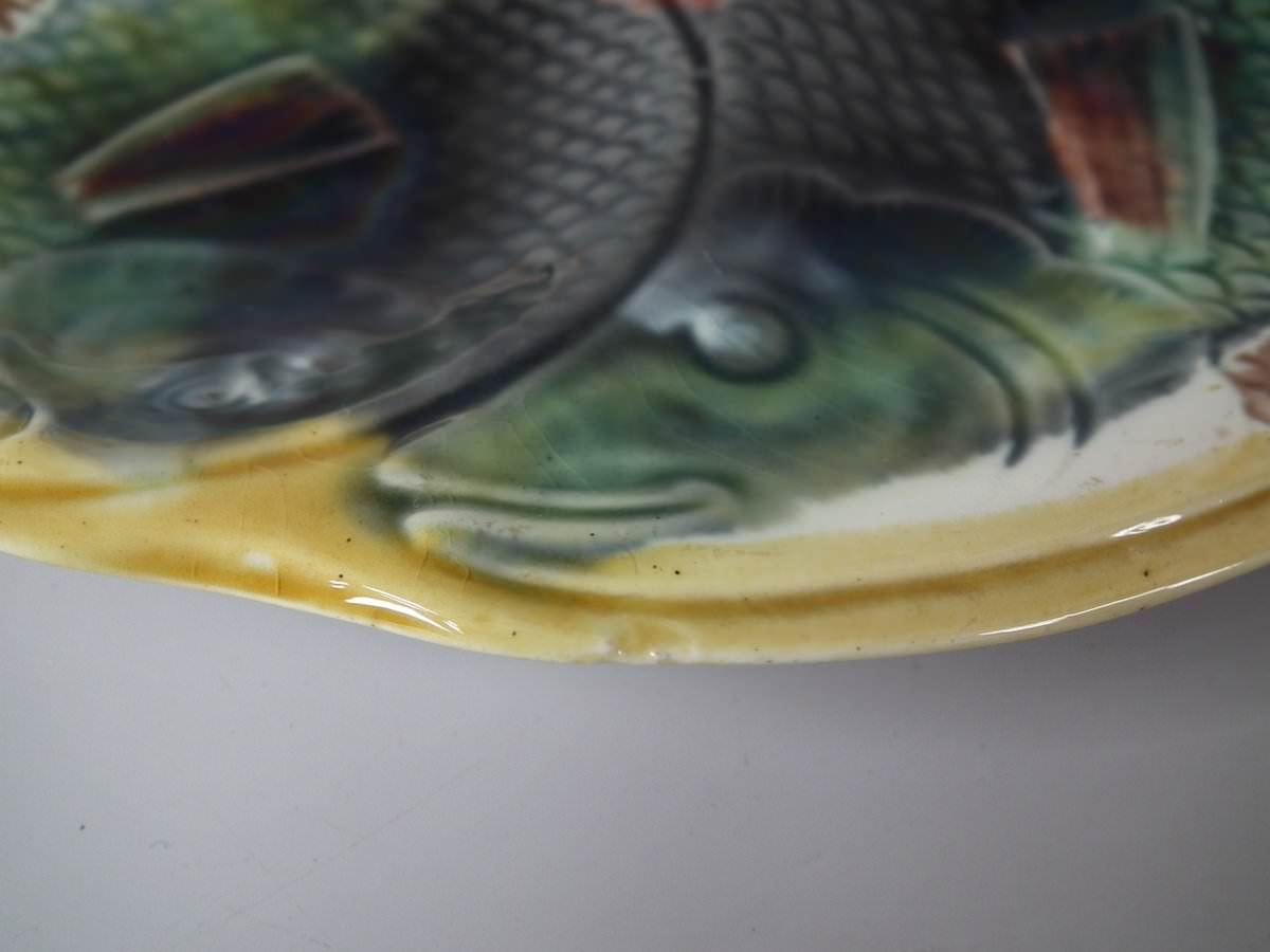 Victorian, circa 1870. 9.4ins high, 10ins wide, 0.8ins depth. Adams & Bromley Majolica oyster plate which features six oyster wells moulded as fish heads, a larger fish to the rim.