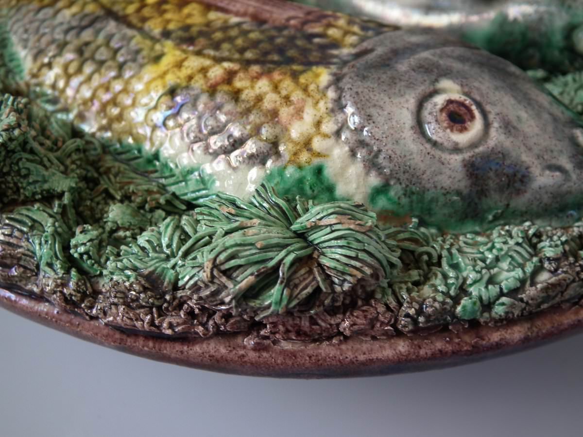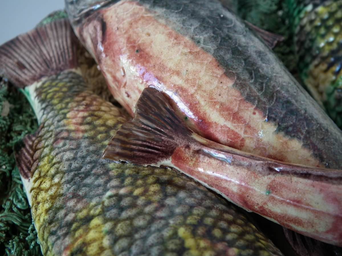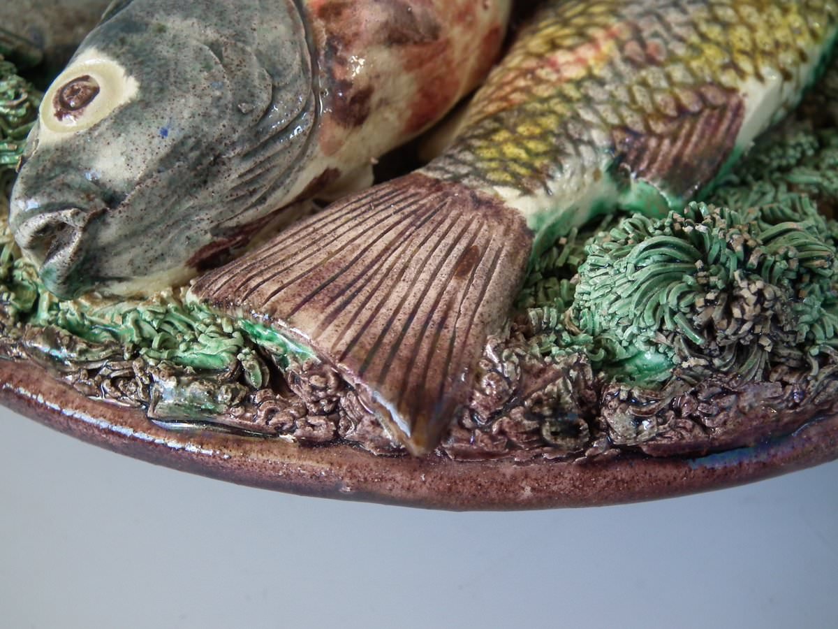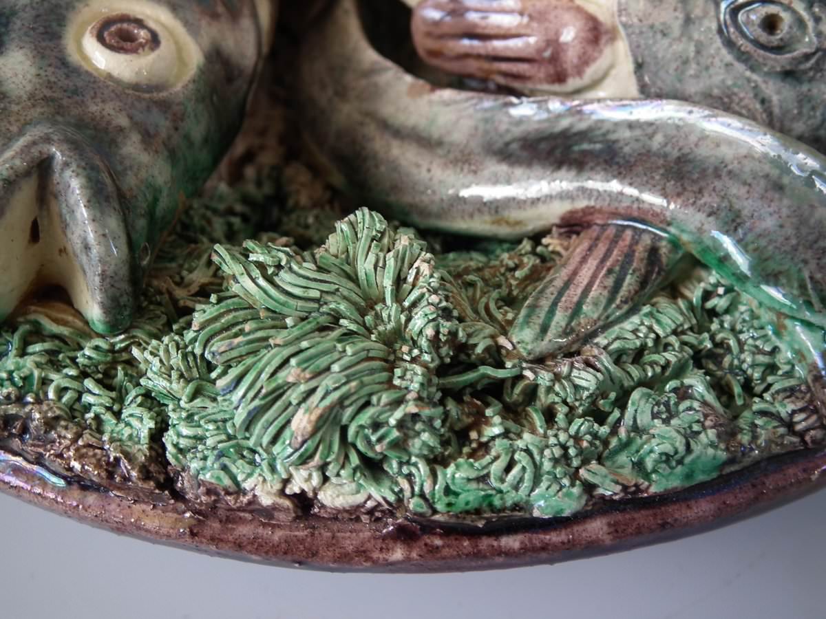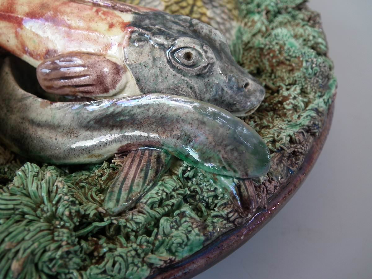 Victorian, circa 1890. 8.7ins high, 8.7ins wide, 2.4ins depth. Mafra Portuguese Palissy Majolica wall plate which features four fish and an eel.