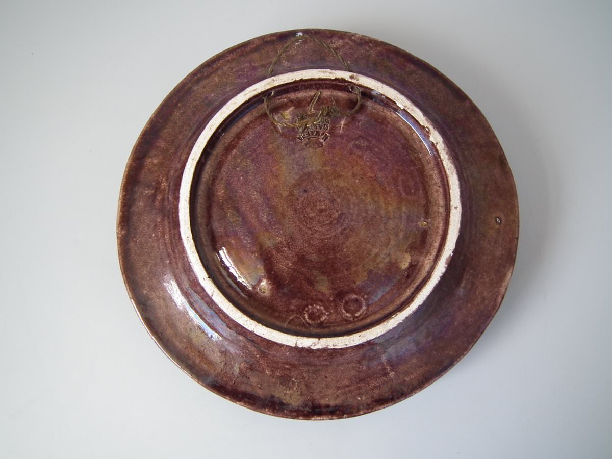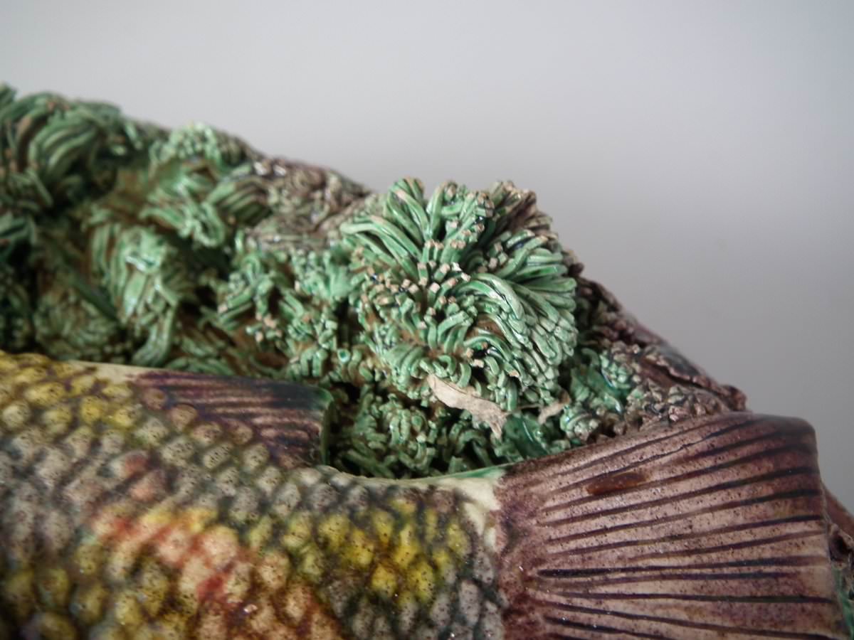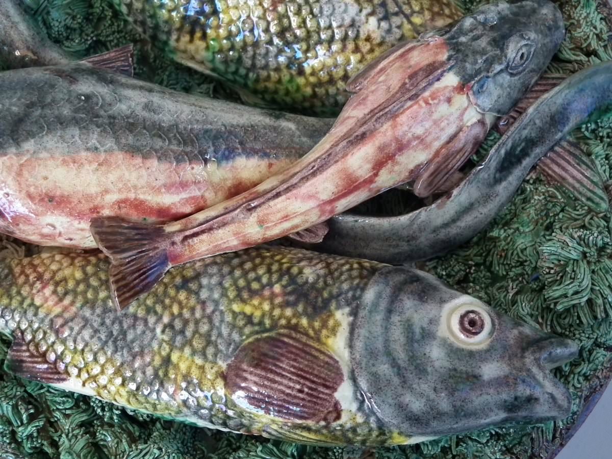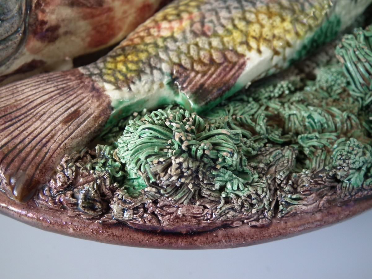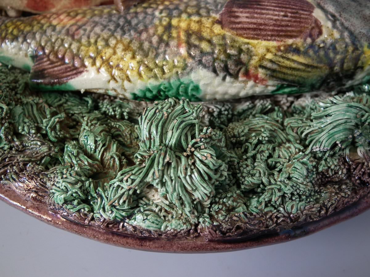 Victorian, circa 1890. 8.7ins high, 8.7ins wide, 2.4ins depth. Mafra Portuguese Palissy Majolica wall plate which features four fish and an eel.