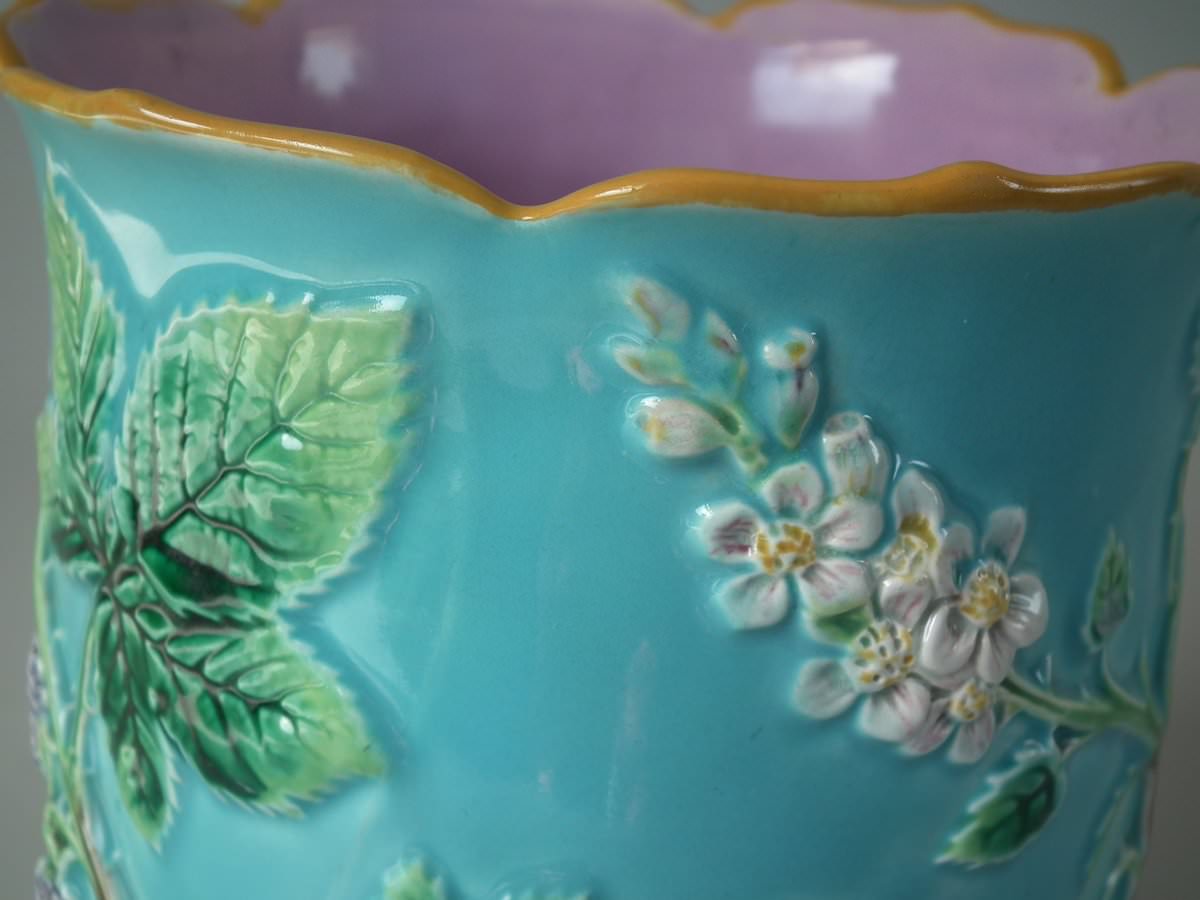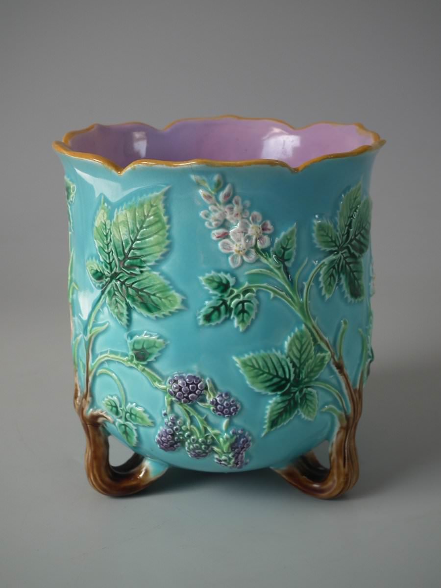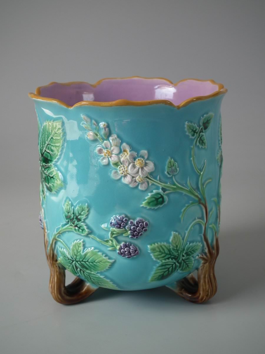 Victorian, circa 1870. 5.5ins high, 5.1ins wide, 5.1ins depth. George Jones Majolica planter which features blackberry fruits, leaves and blossom.