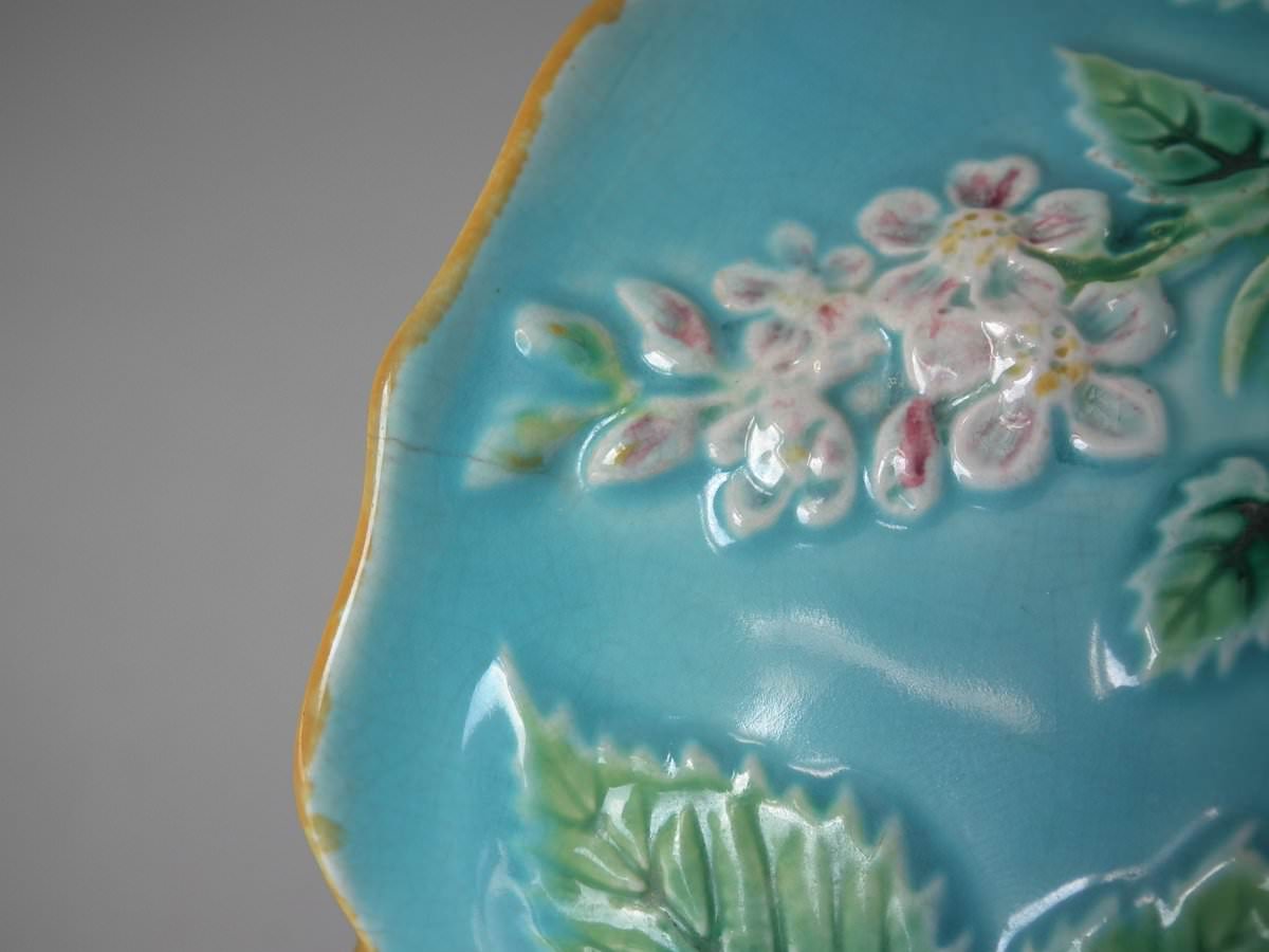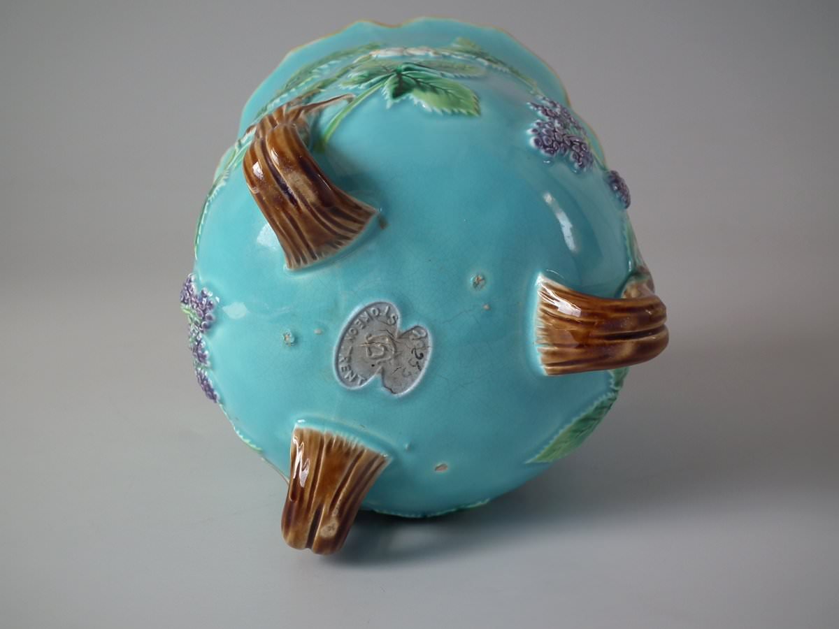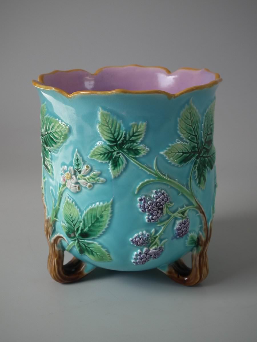Victorian, circa 1870. 5.5ins high, 5.1ins wide, 5.1ins depth. George Jones Majolica planter which features blackberry fruits, leaves and blossom.