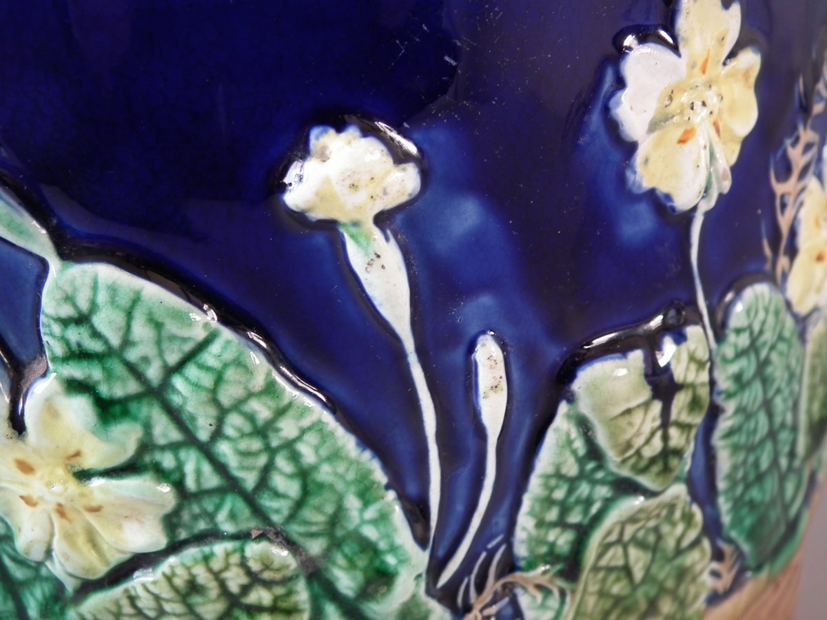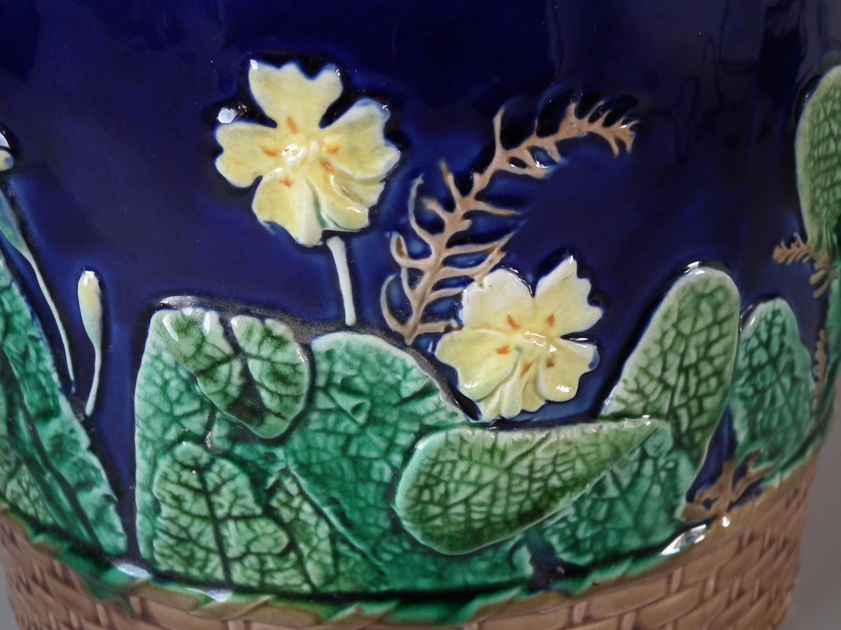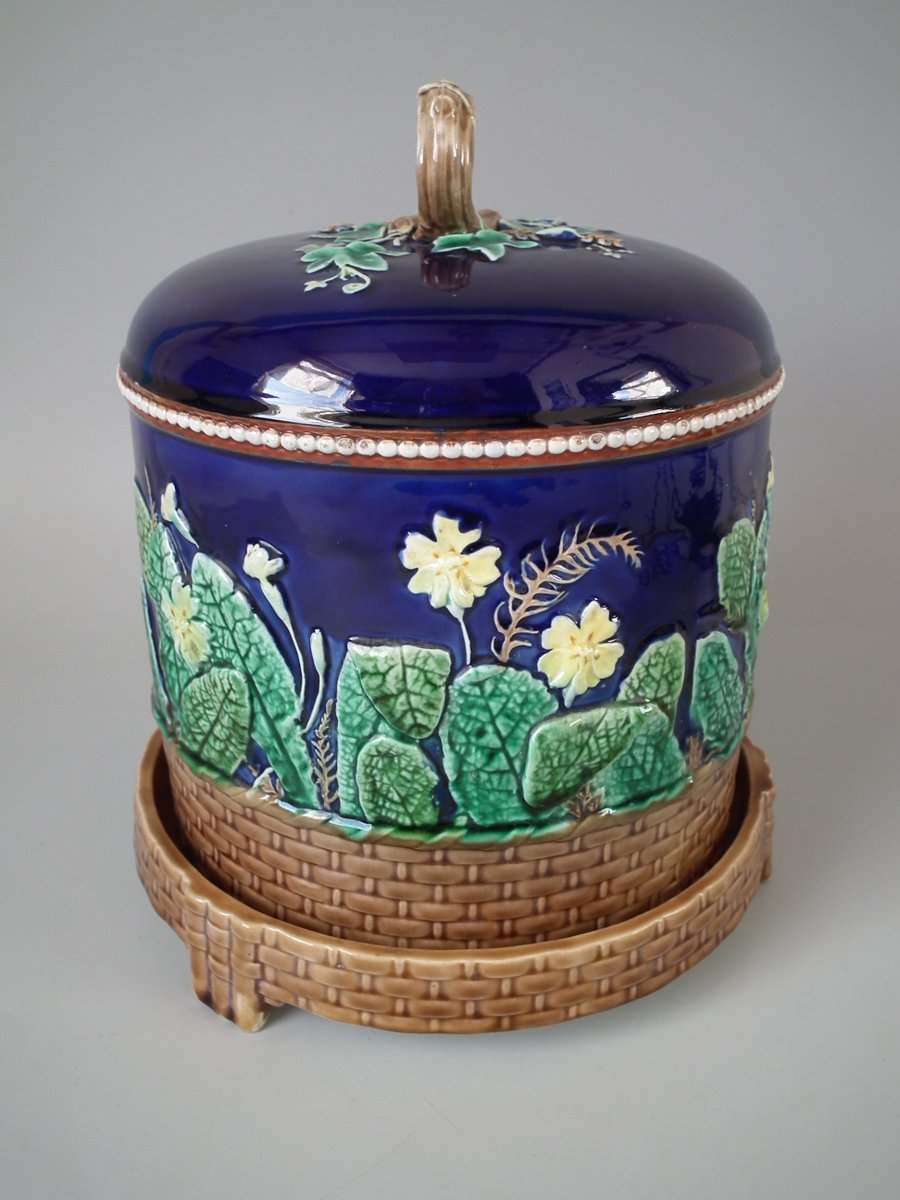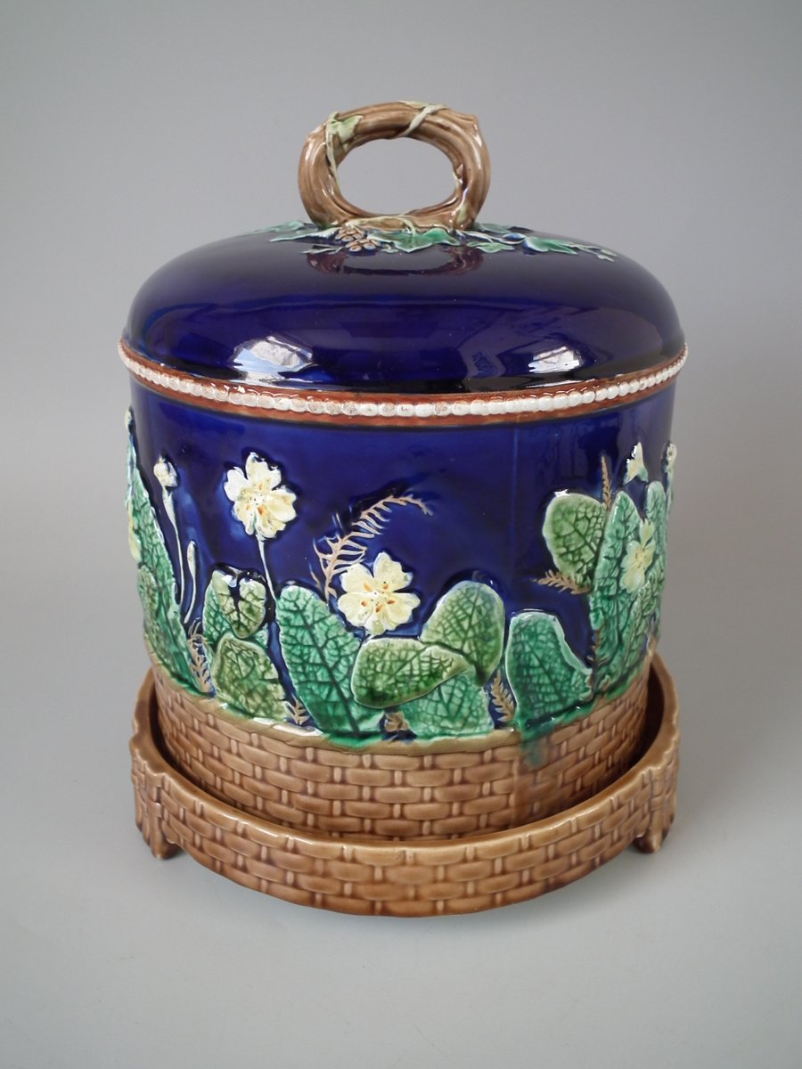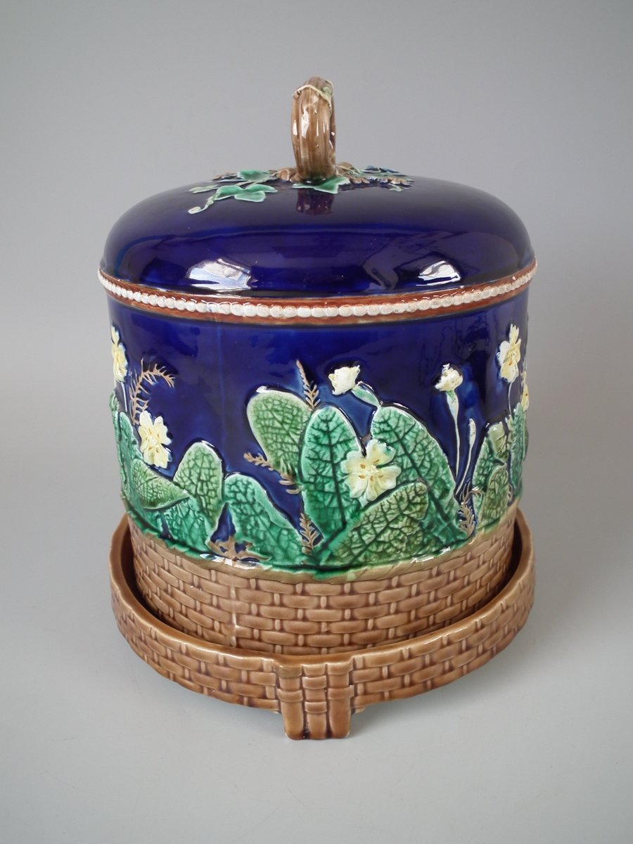 Victorian, circa 1875. 11ins high, 9.1ins wide, 9.1ins depth. Wedgwood Majolica cheese keep which features yellow primroses and a basket weave border. Cobalt blue ground version.