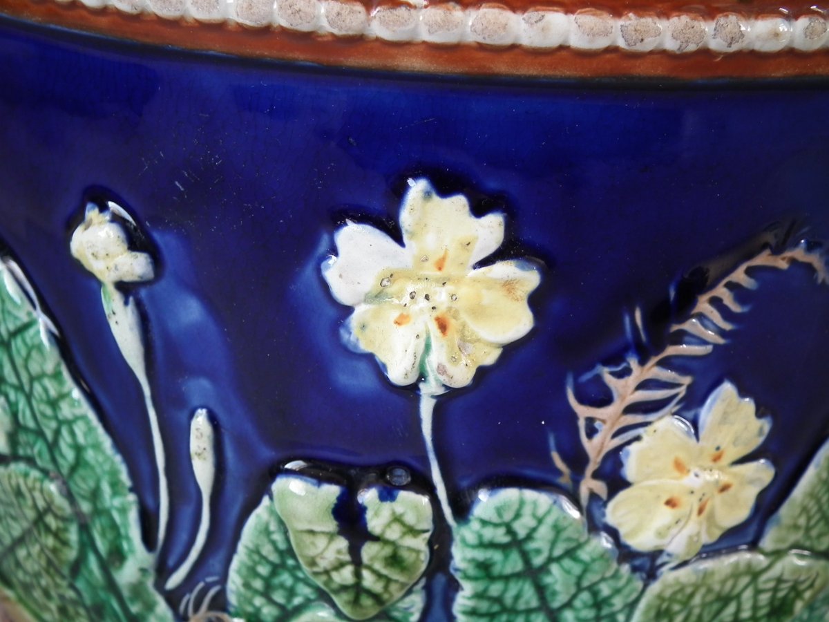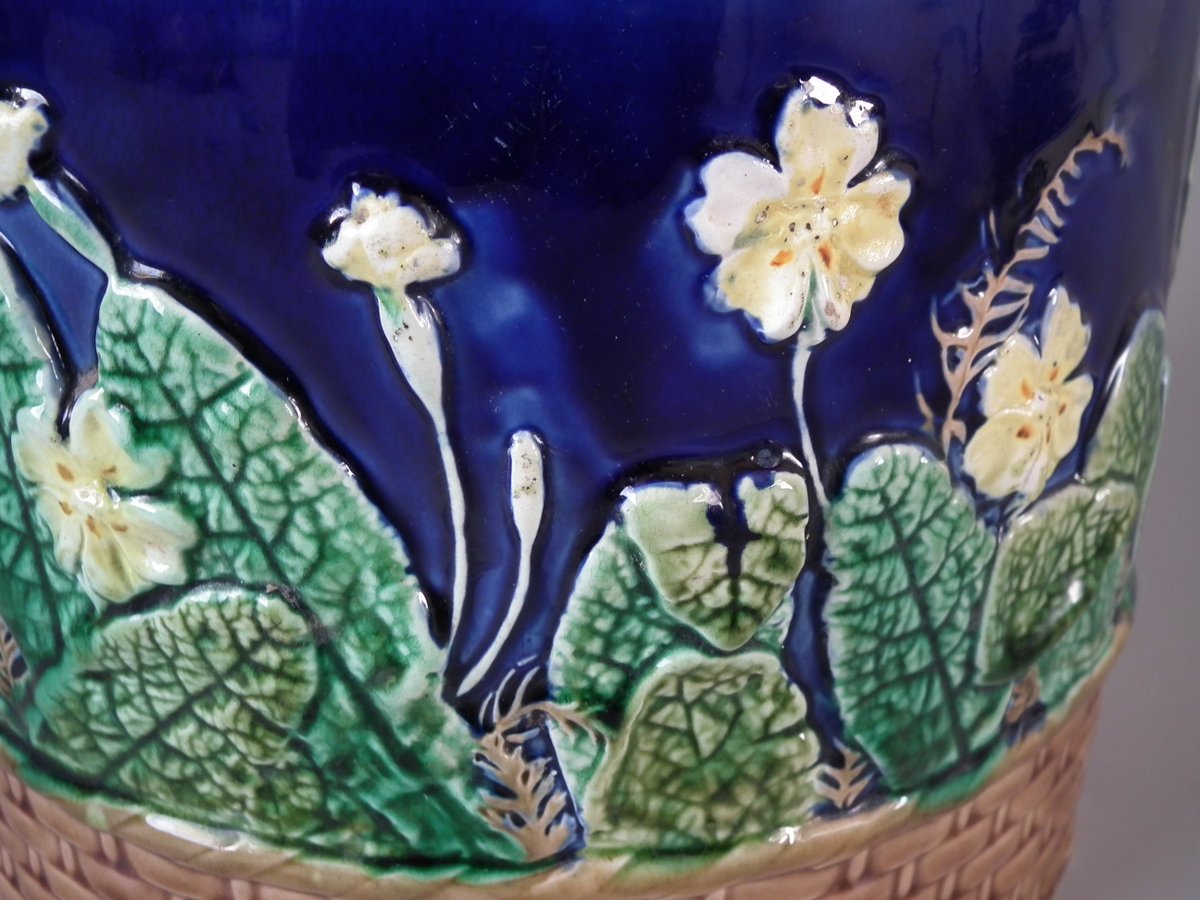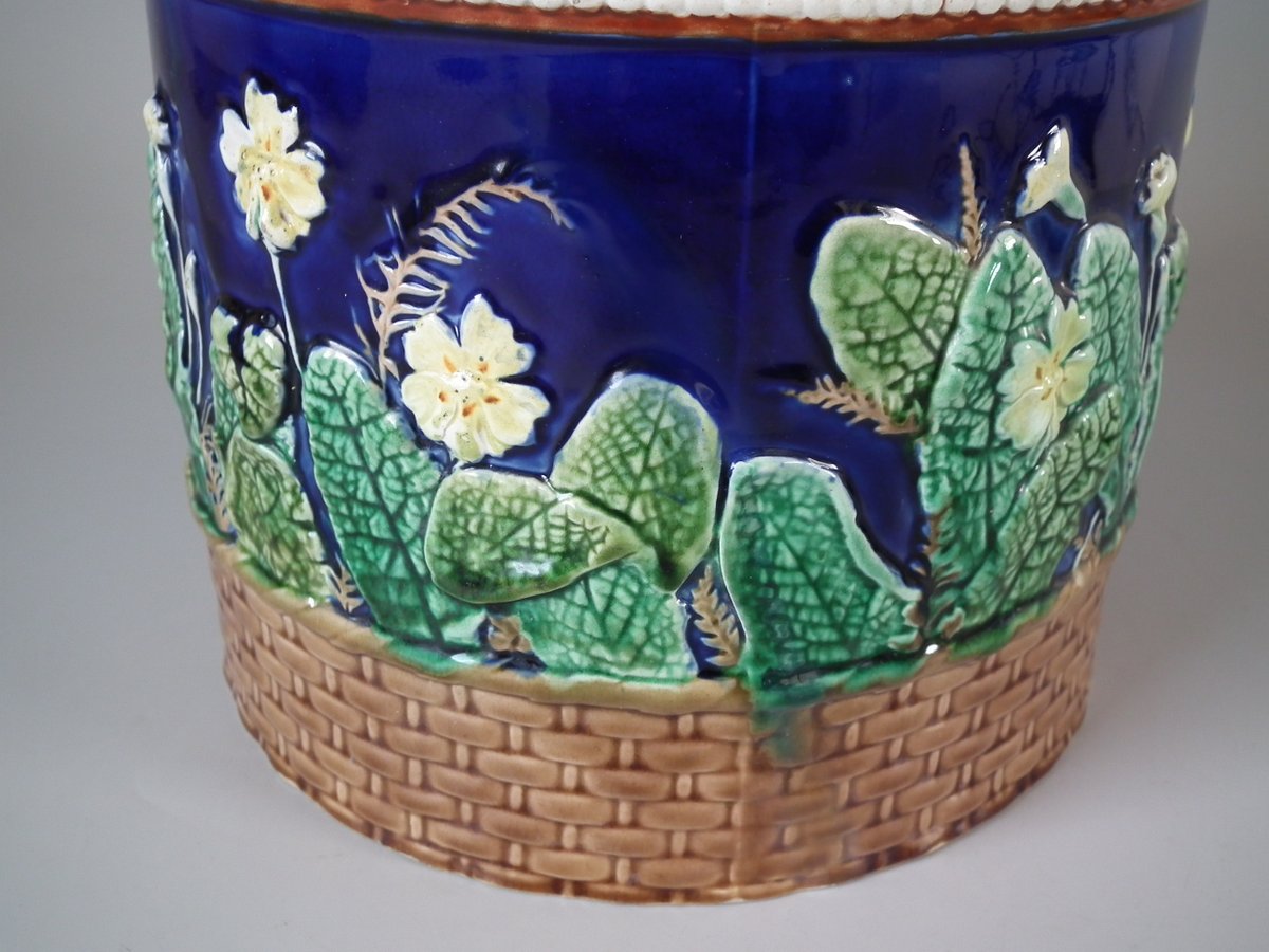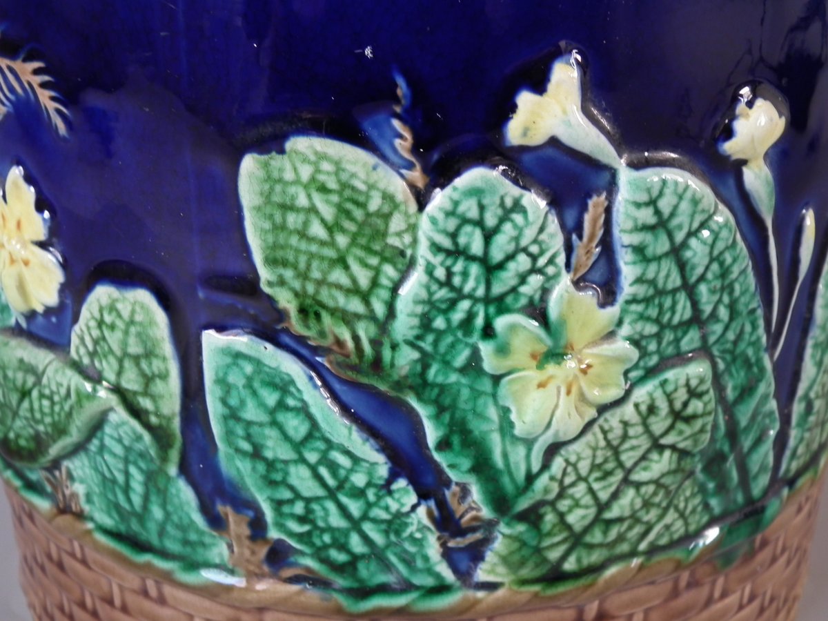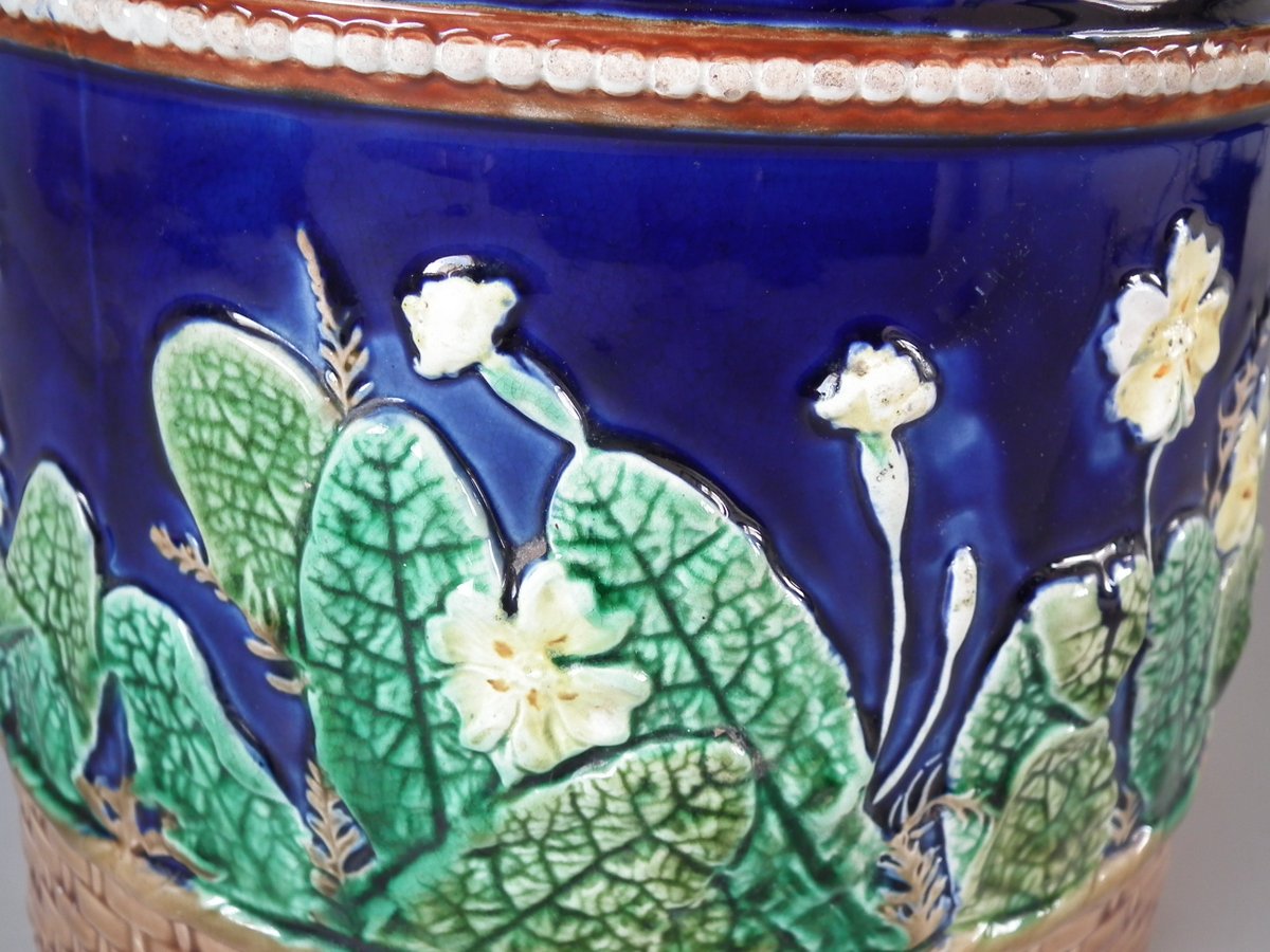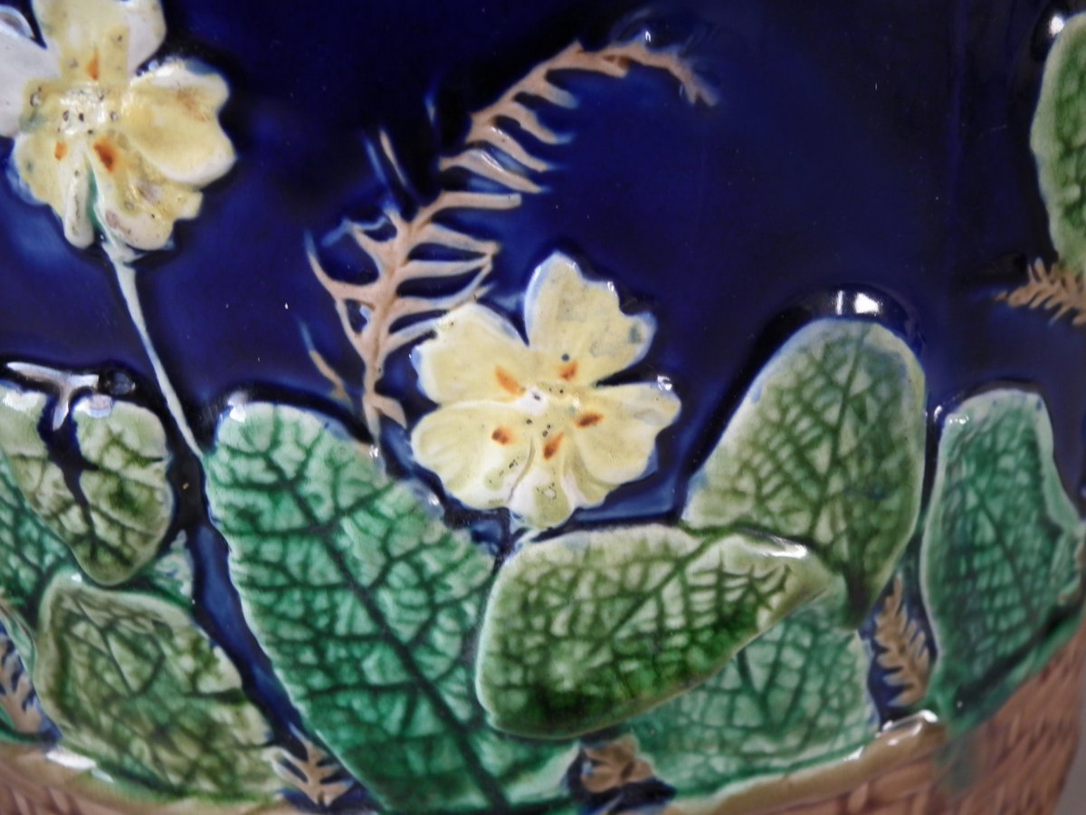 Victorian, circa 1875. 11ins high, 9.1ins wide, 9.1ins depth. Wedgwood Majolica cheese keep which features yellow primroses and a basket weave border. Cobalt blue ground version.