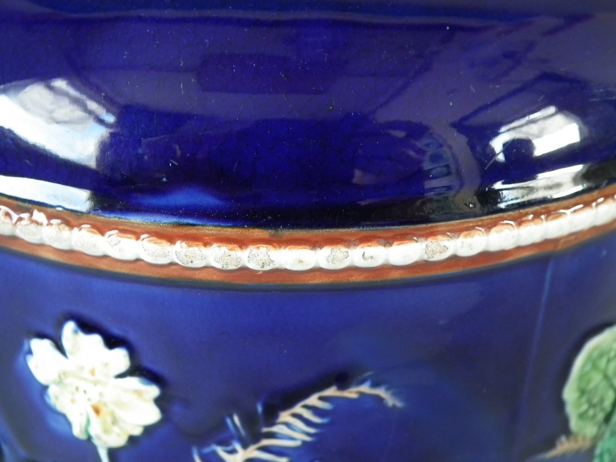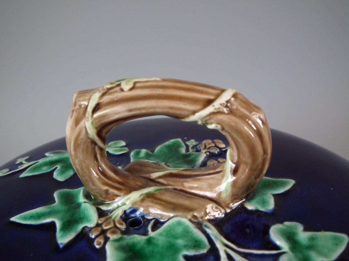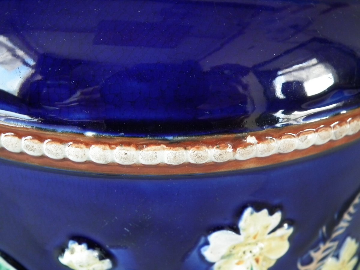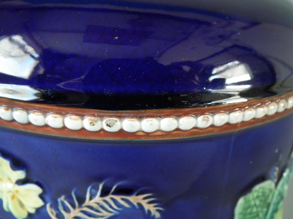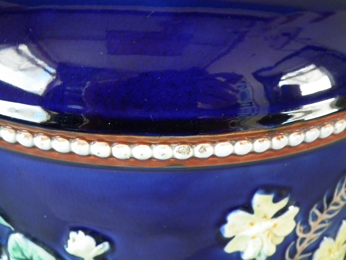 Victorian, circa 1875. 11ins high, 9.1ins wide, 9.1ins depth. Wedgwood Majolica cheese keep which features yellow primroses and a basket weave border. Cobalt blue ground version.