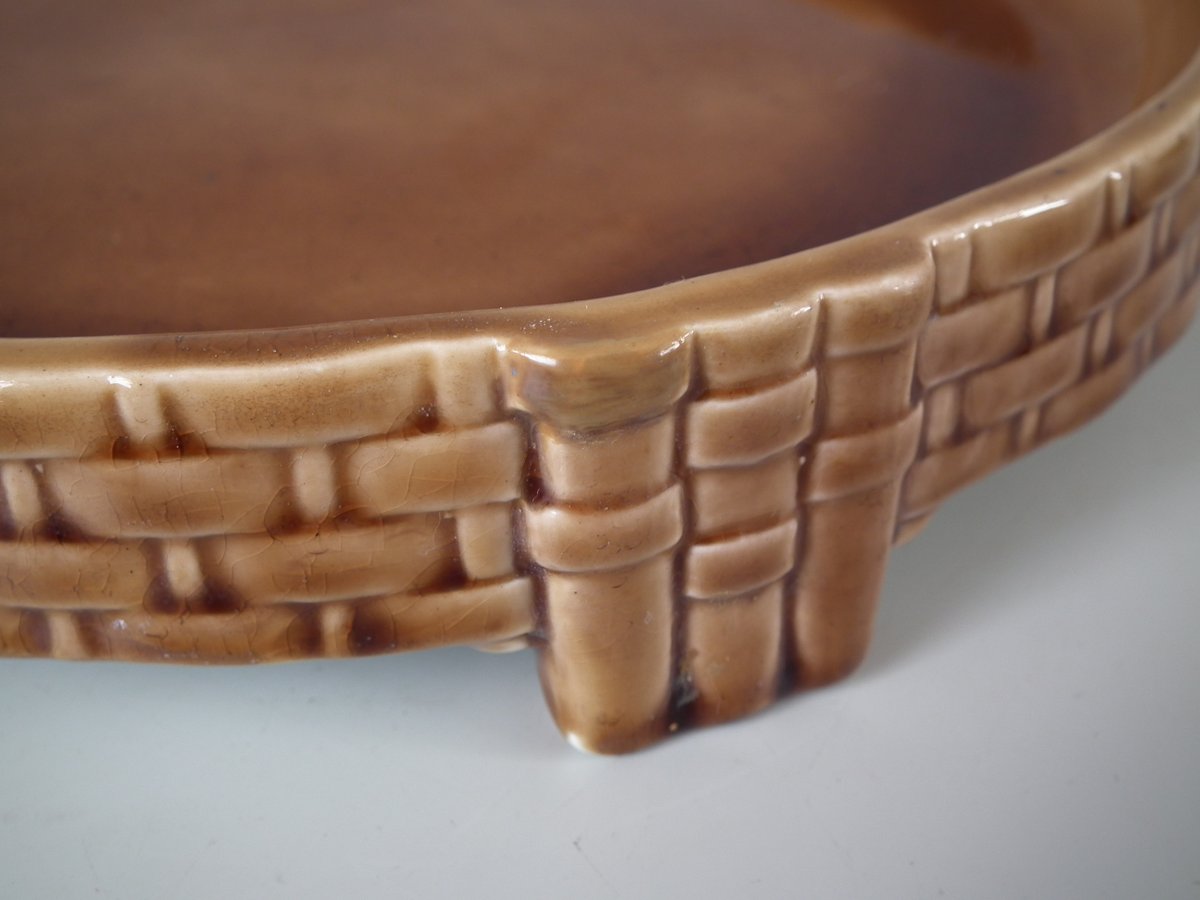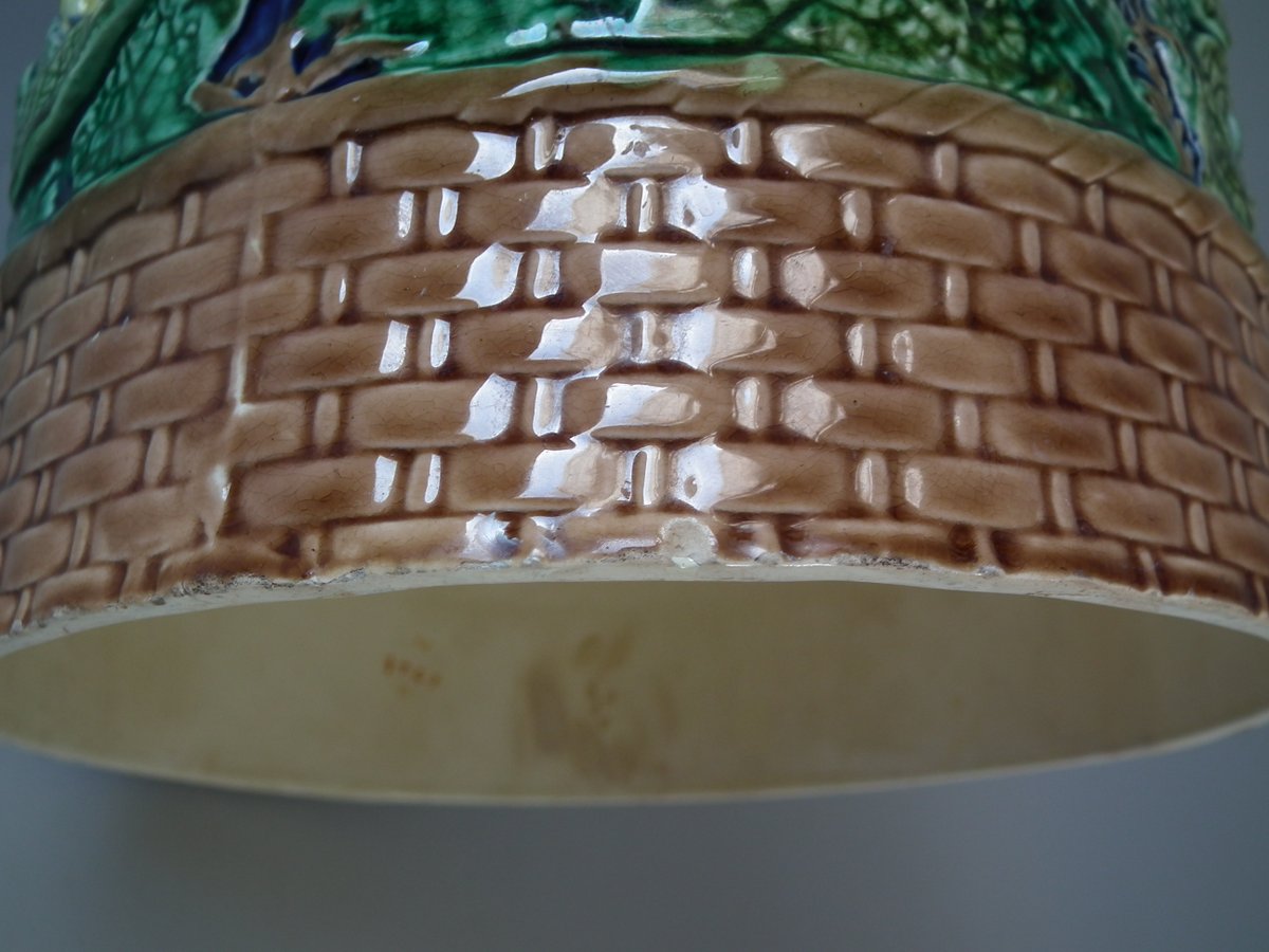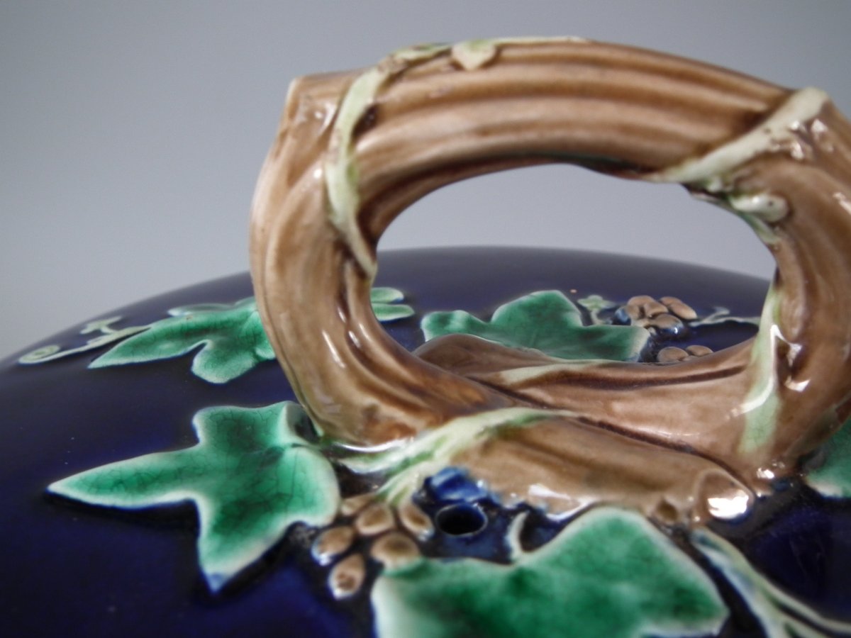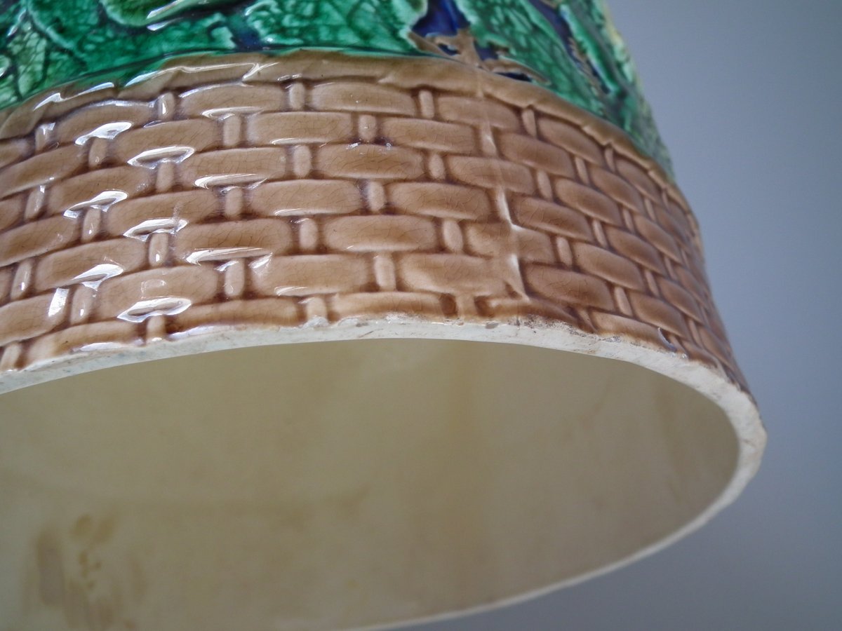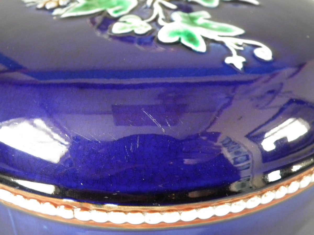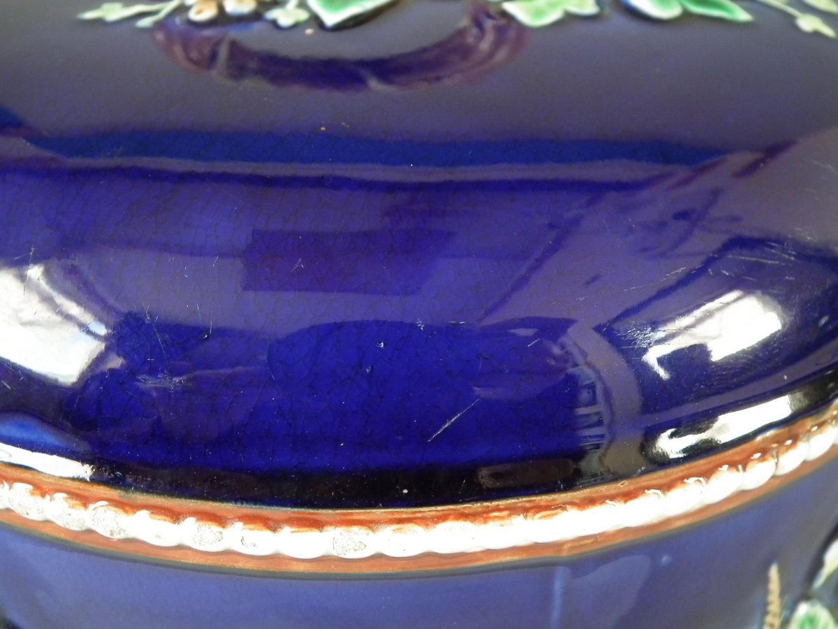 Victorian, circa 1875. 11ins high, 9.1ins wide, 9.1ins depth. Wedgwood Majolica cheese keep which features yellow primroses and a basket weave border. Cobalt blue ground version.