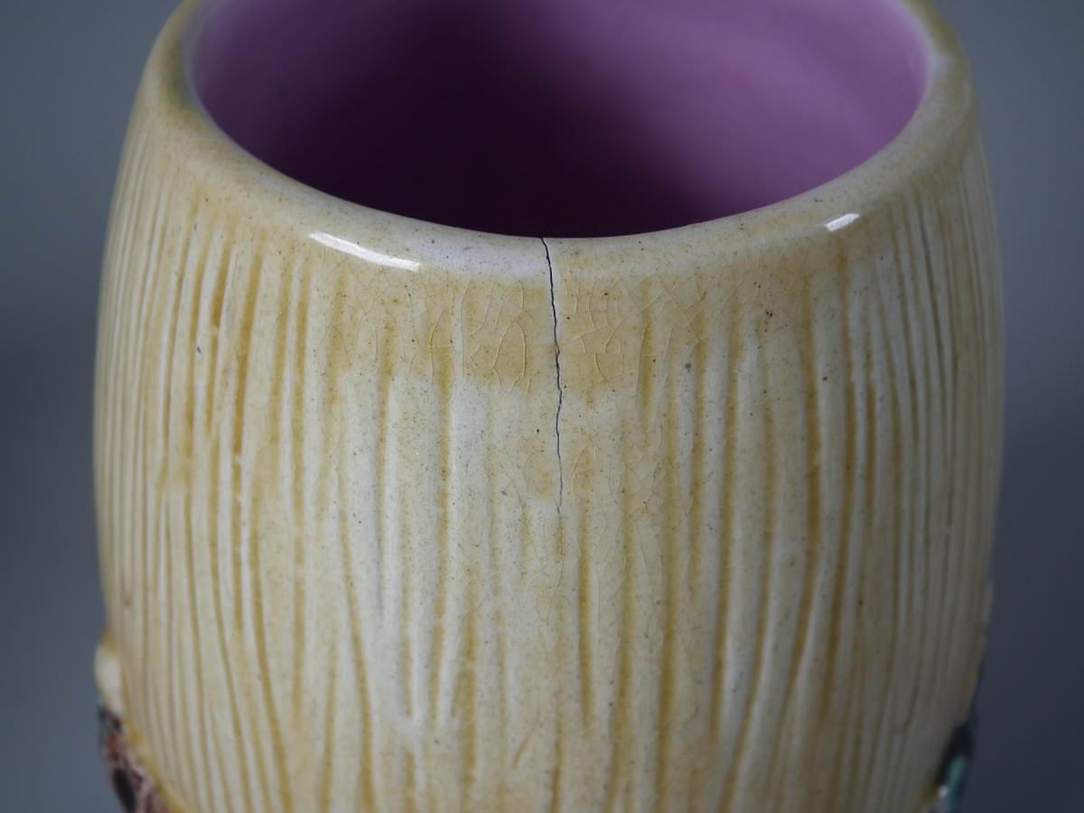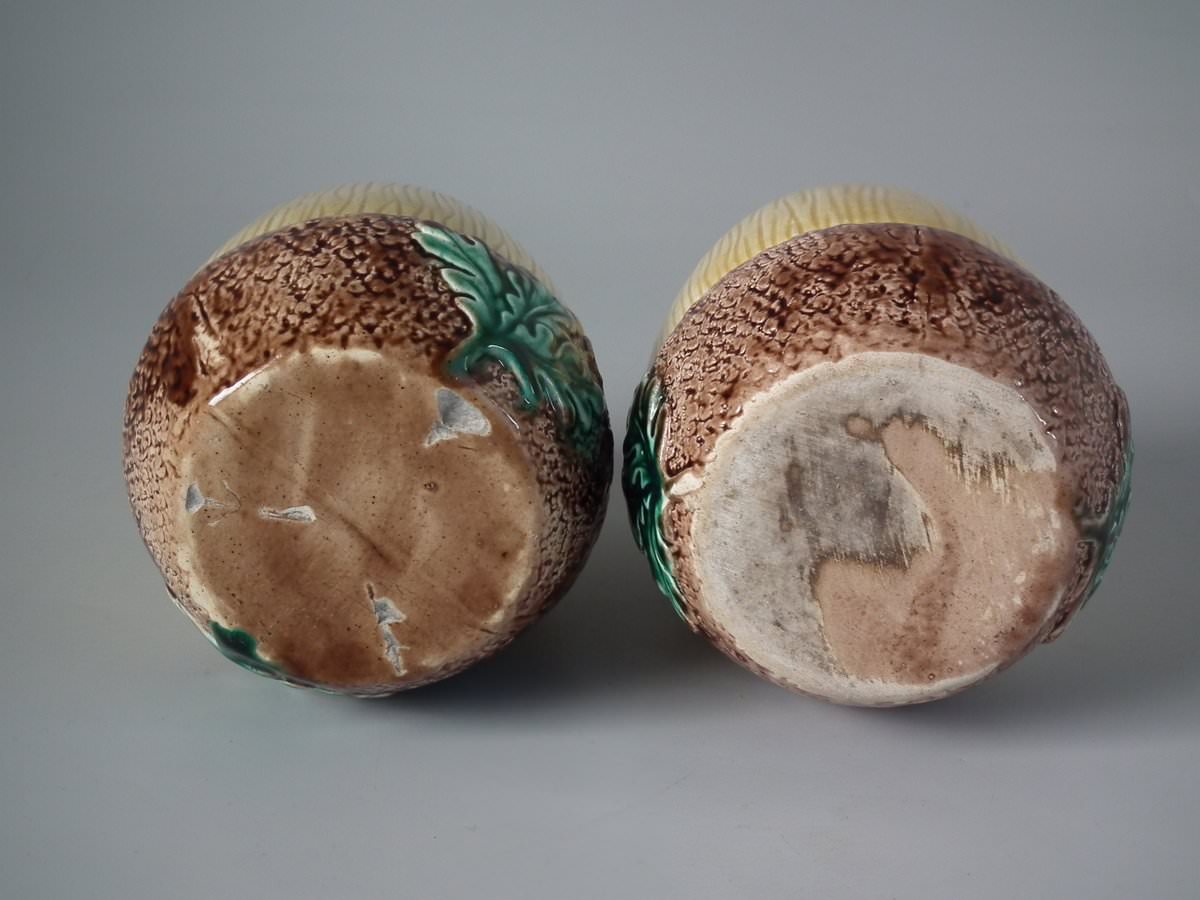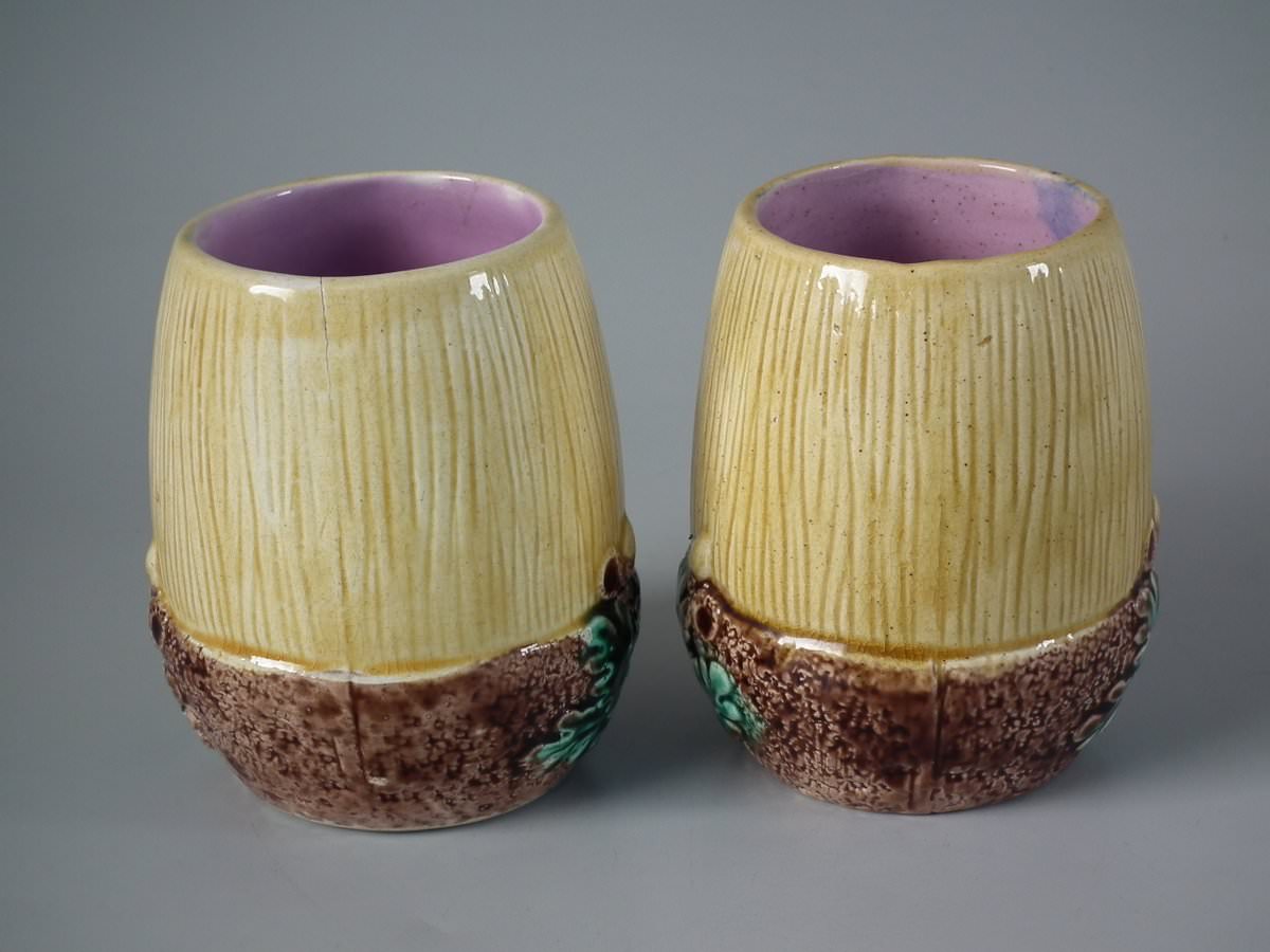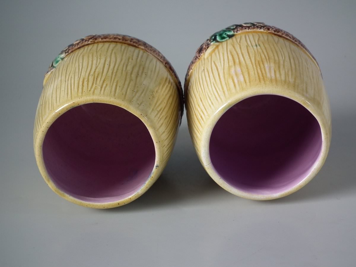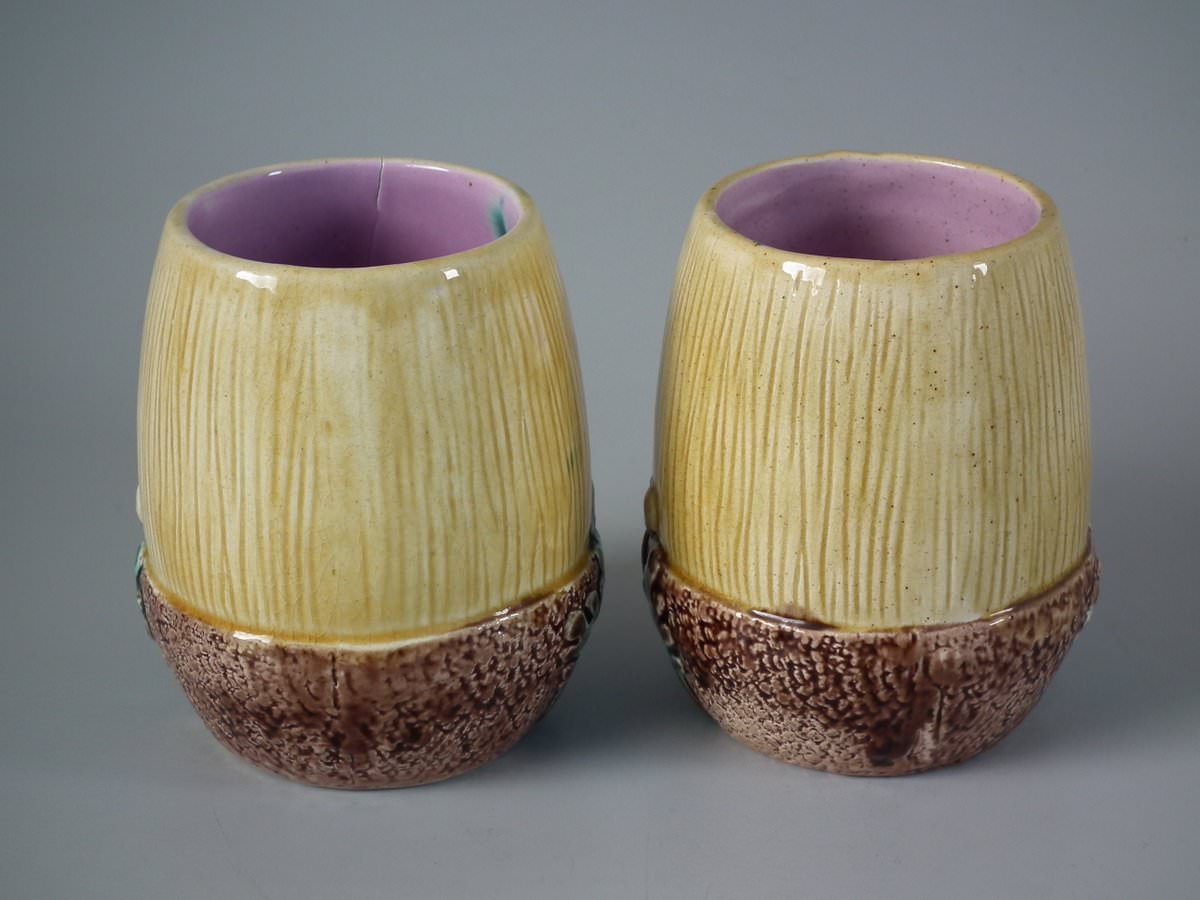 Victorian, circa 1880. Tallest is 4.3ins high, 3.5ins wide, 3.5ins depth. Pair of Majolica tumblers which feature an acorn.