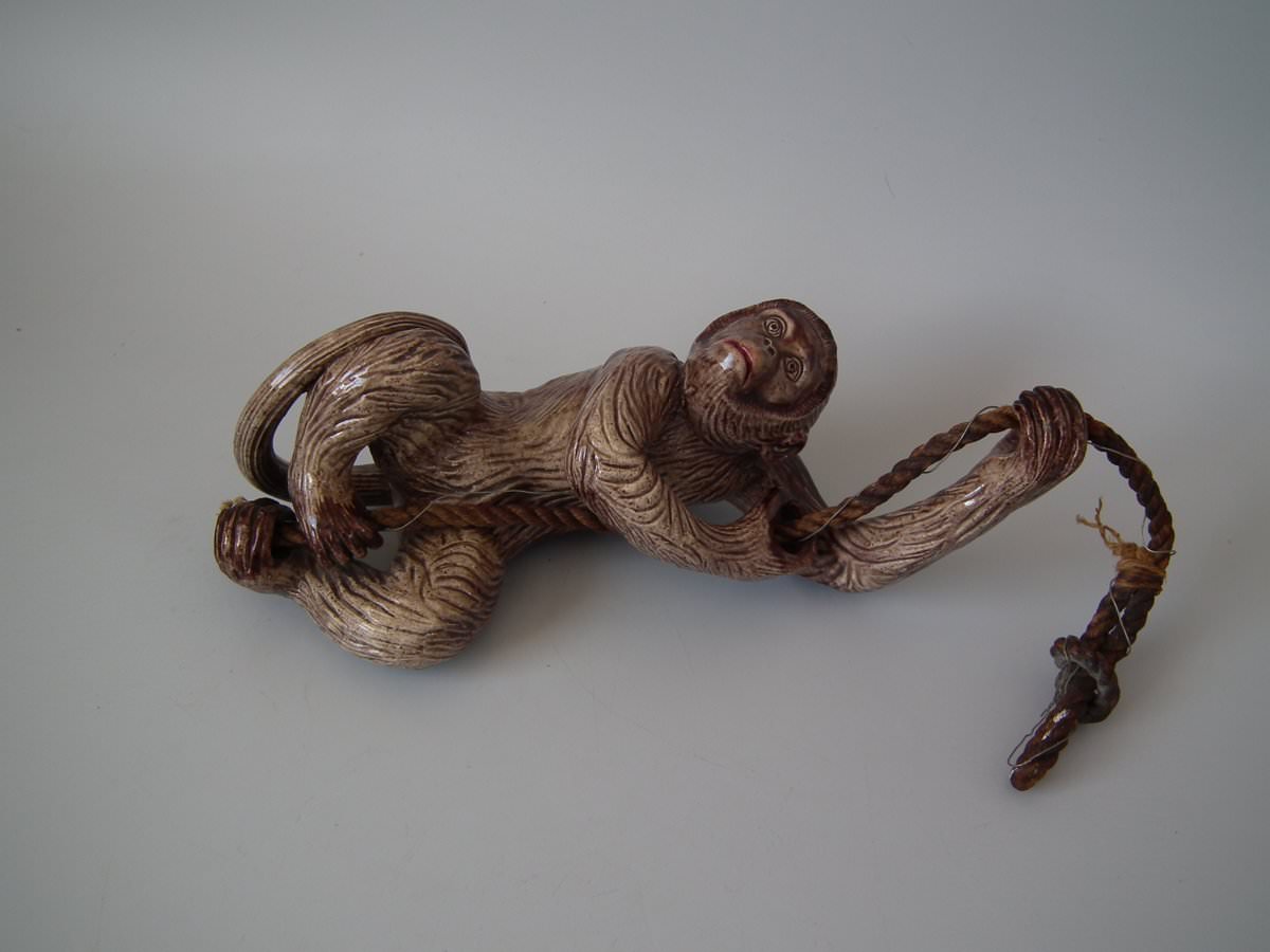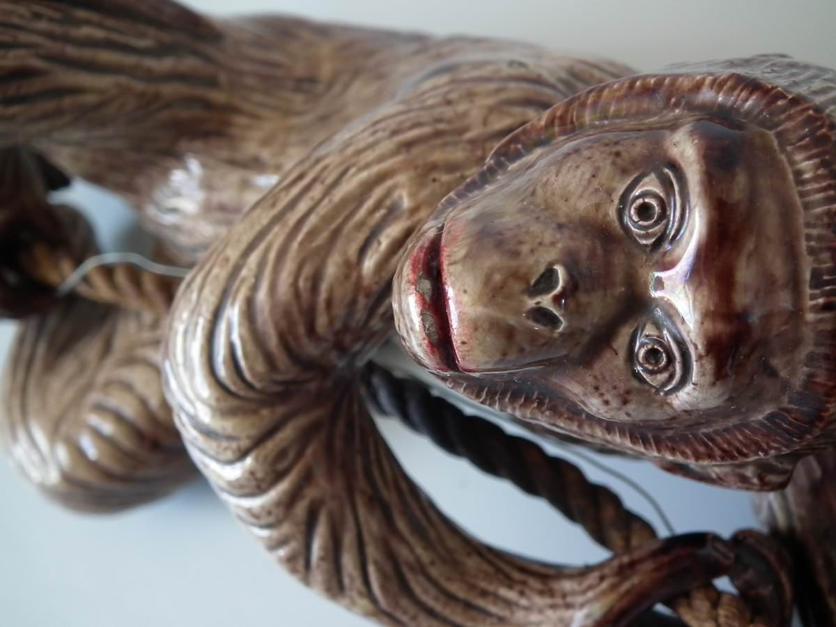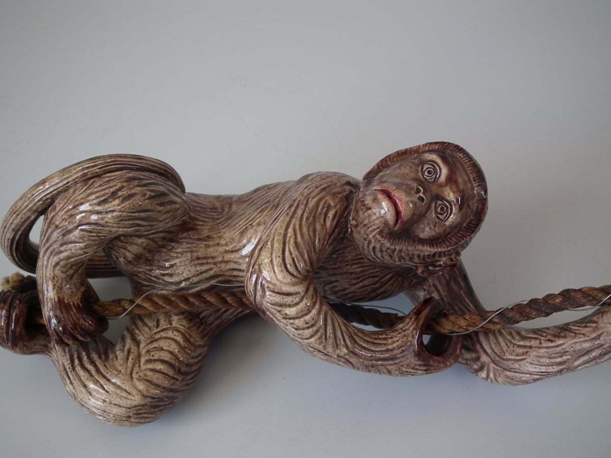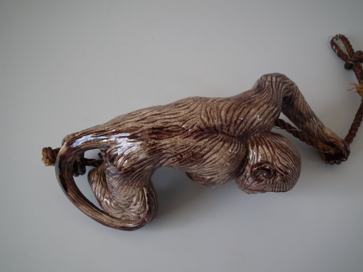 Circa 1890. 9.4ins high, 3.5ins wide, 3.1ins depth. Portuguese Palissy Majolica bell pull which features a monkey climbing a rope.