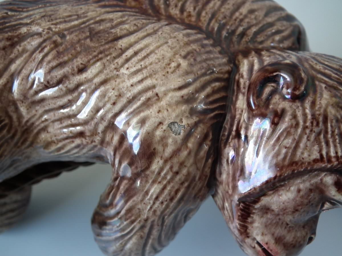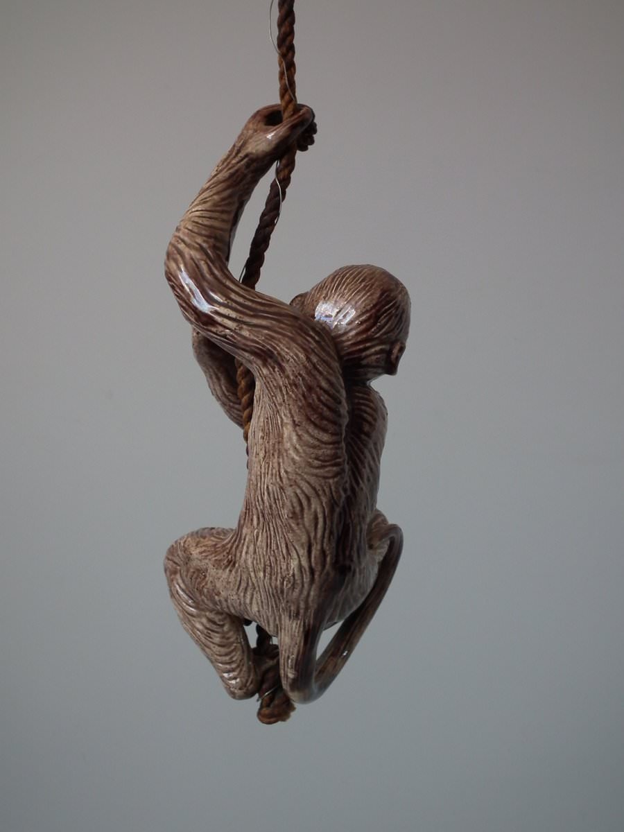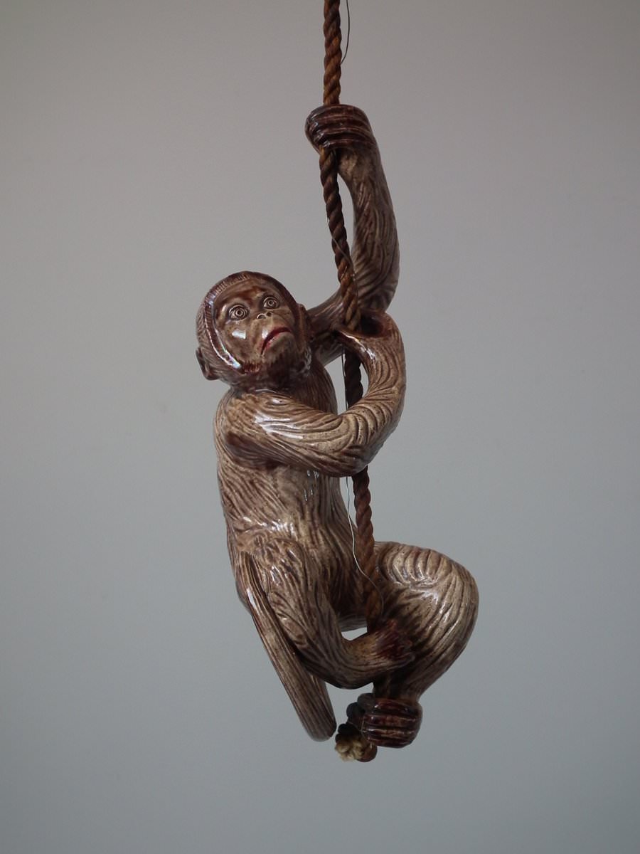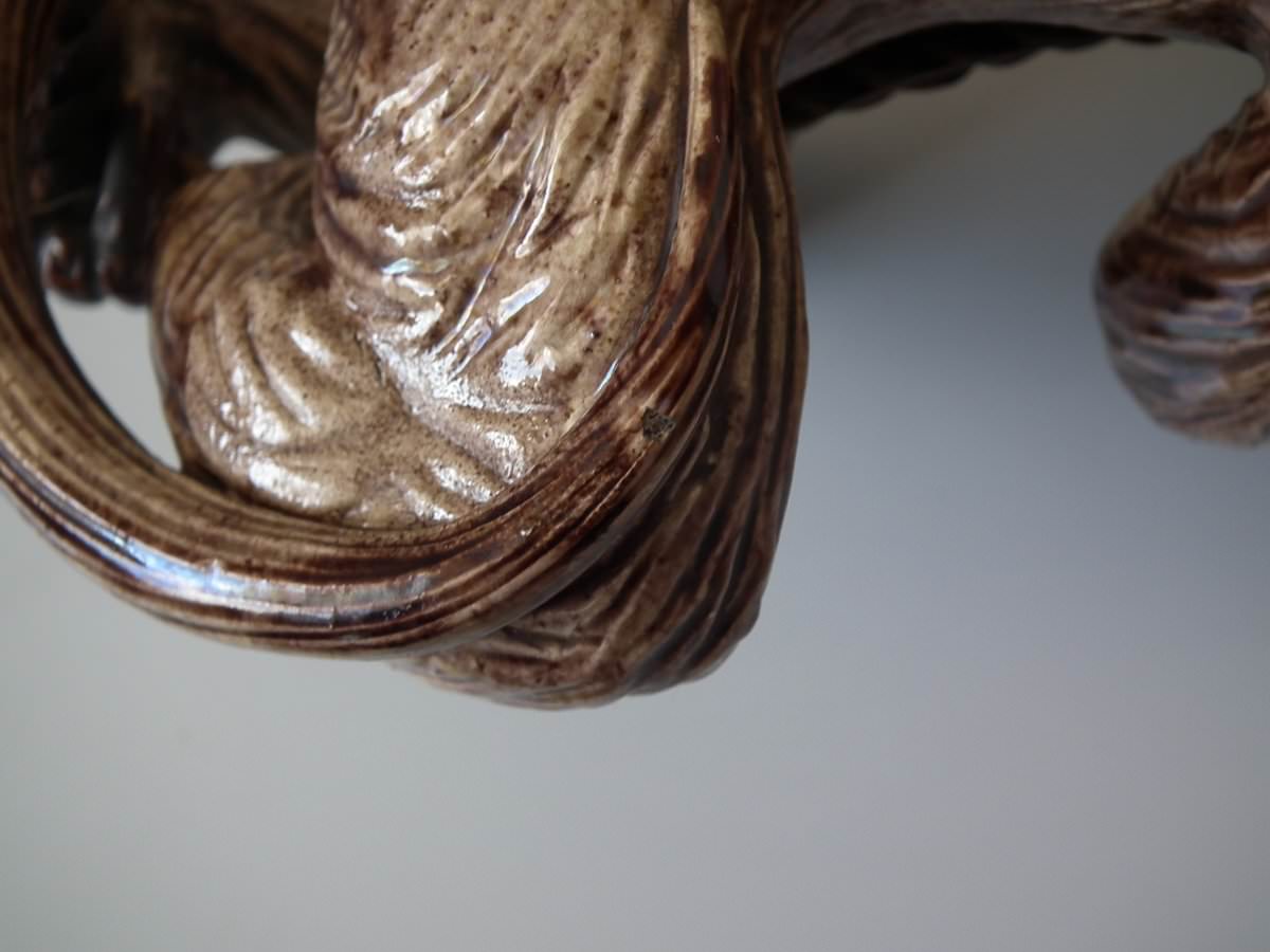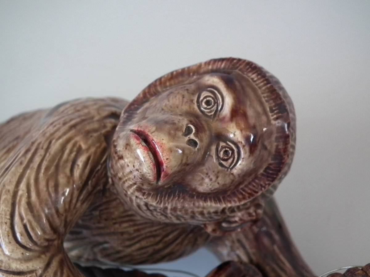 Circa 1890. 9.4ins high, 3.5ins wide, 3.1ins depth. Portuguese Palissy Majolica bell pull which features a monkey climbing a rope.