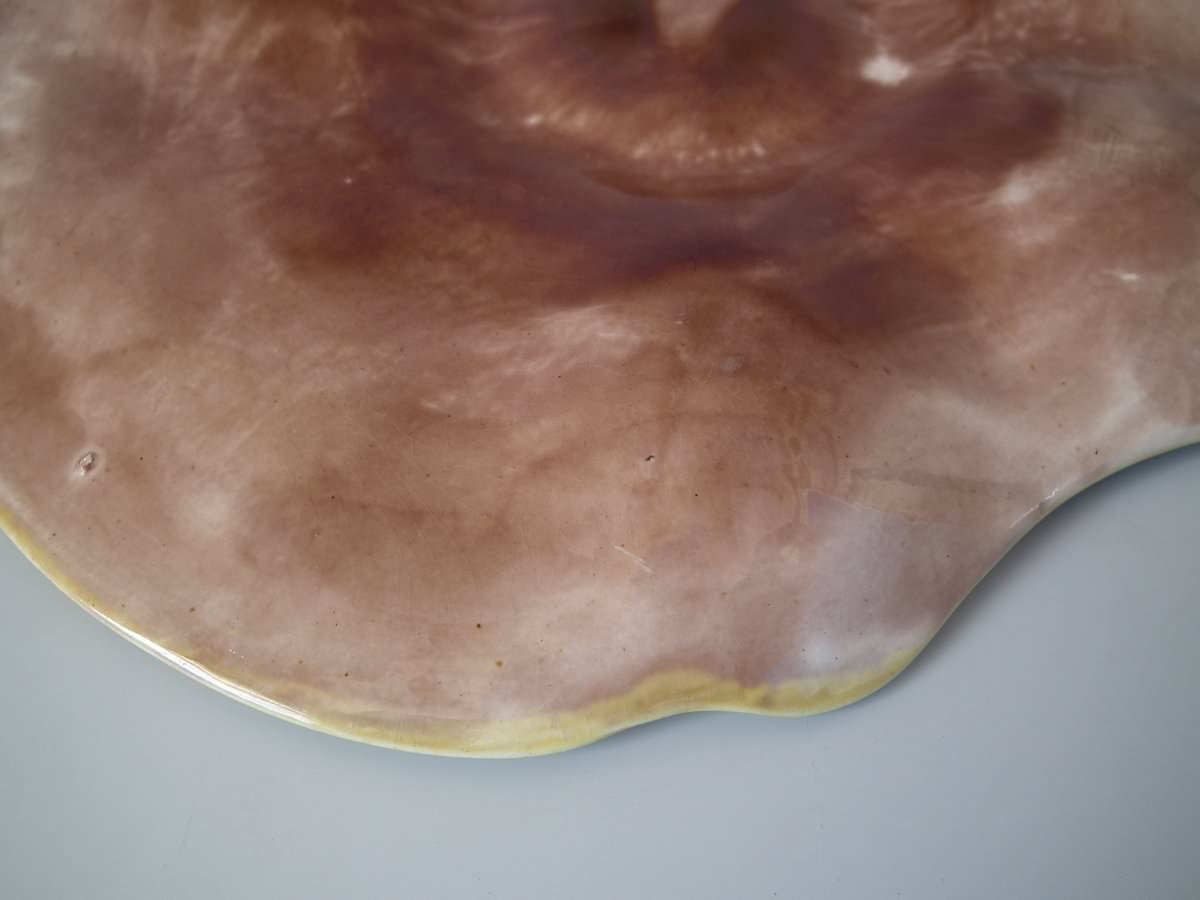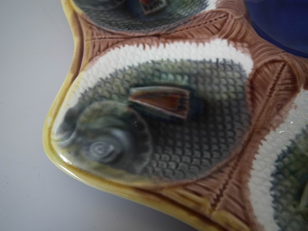 Victorian, circa 1870. 10.2ins high, 9.6ins wide, 0.6ins depth. Adams and Bromley Majolica oyster plate which features six oyster wells moulded as fish heads, a larger fish to the rim.