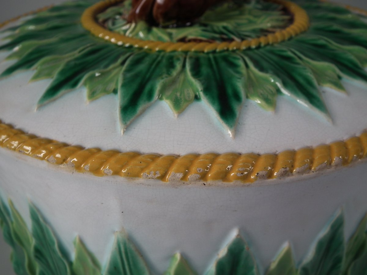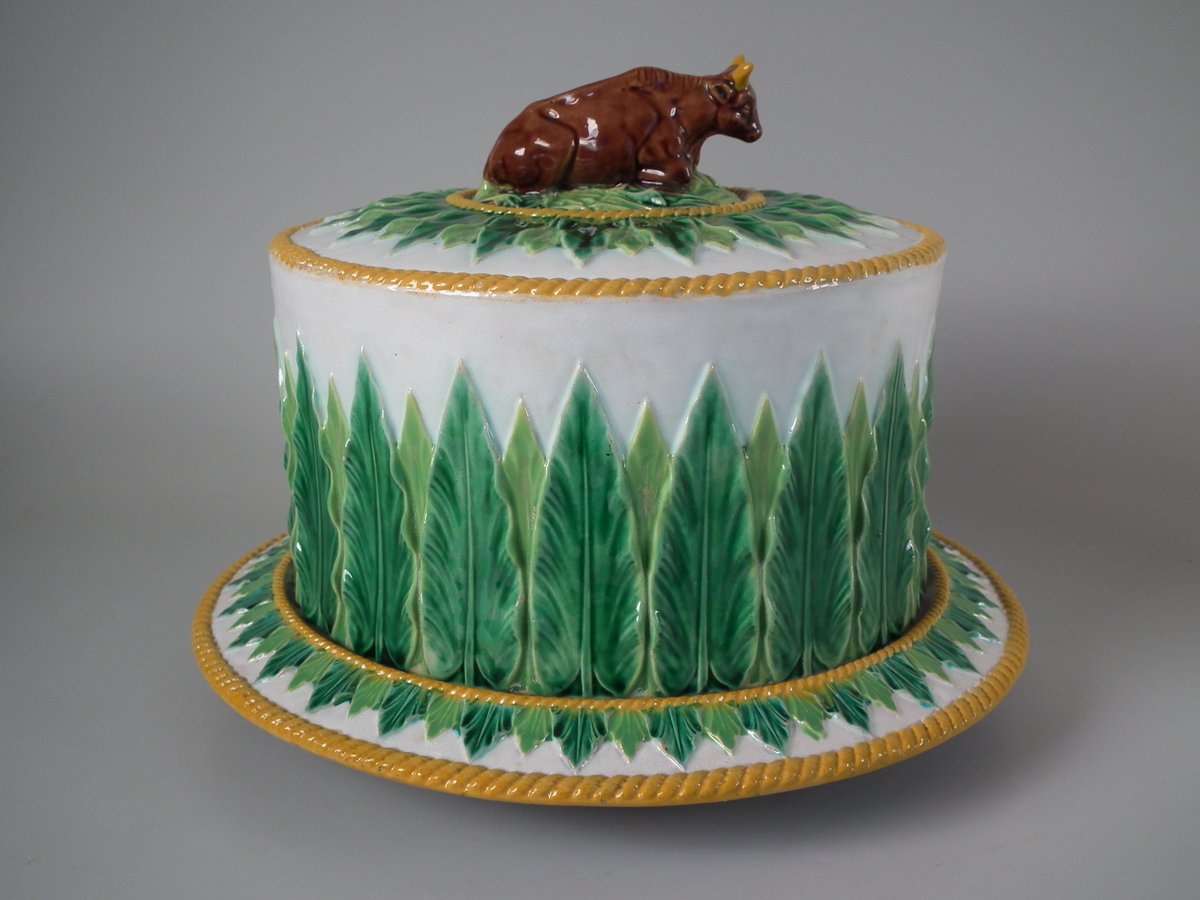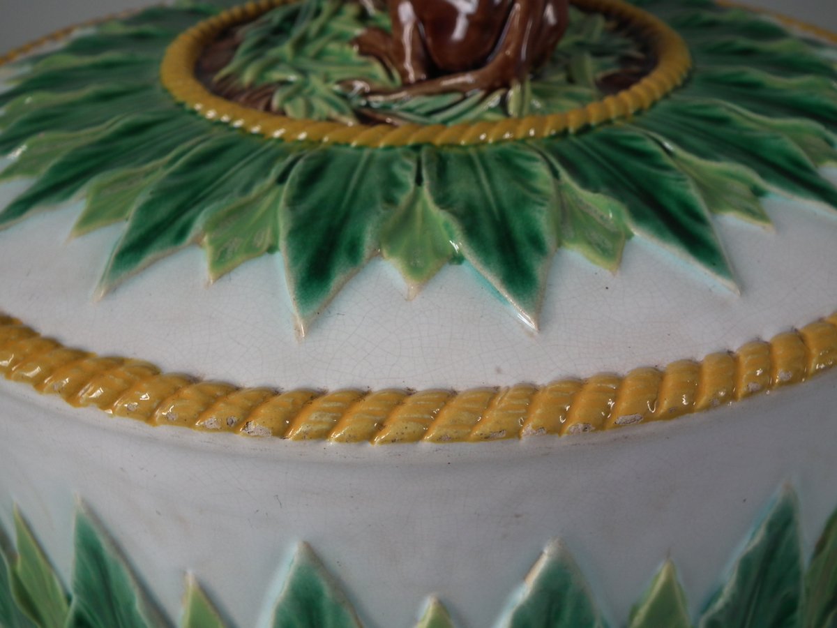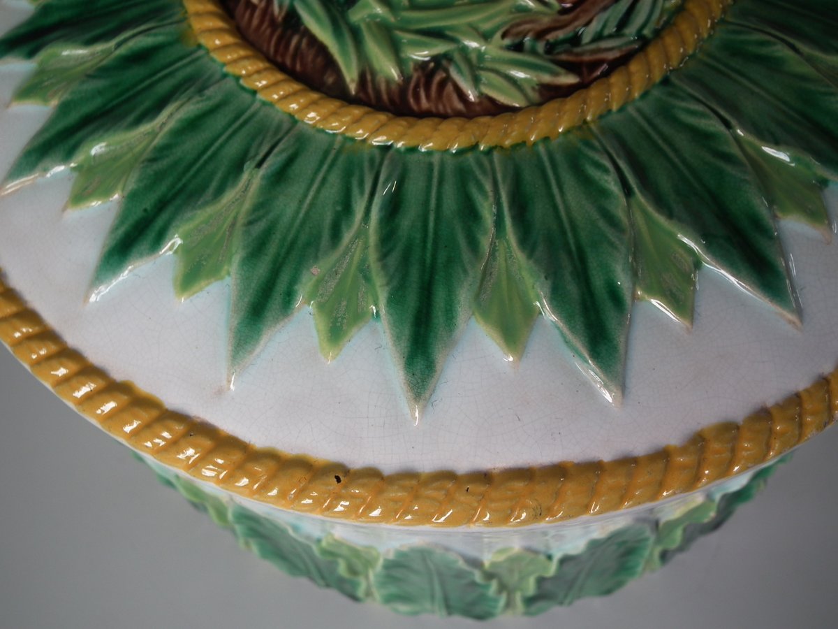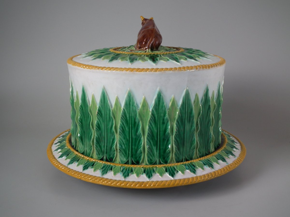 Victorian, circa 1880. 9.1ins high, 12.6ins wide, 12.6ins depth. George Jones Majolica cheese keep which features an overlapping leaf border and cow finial.