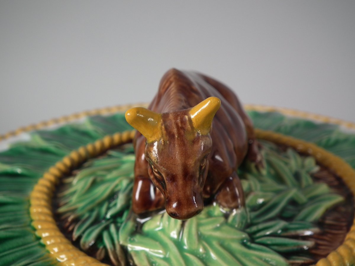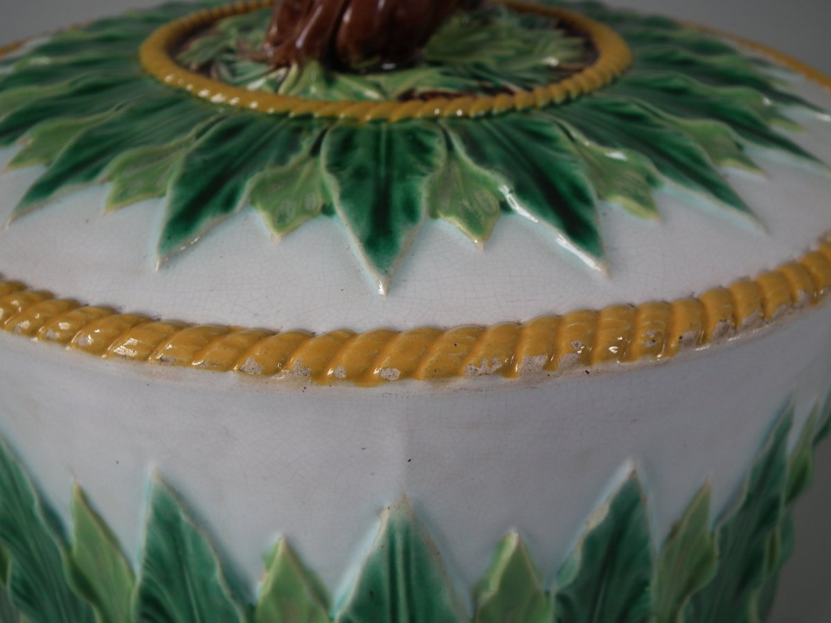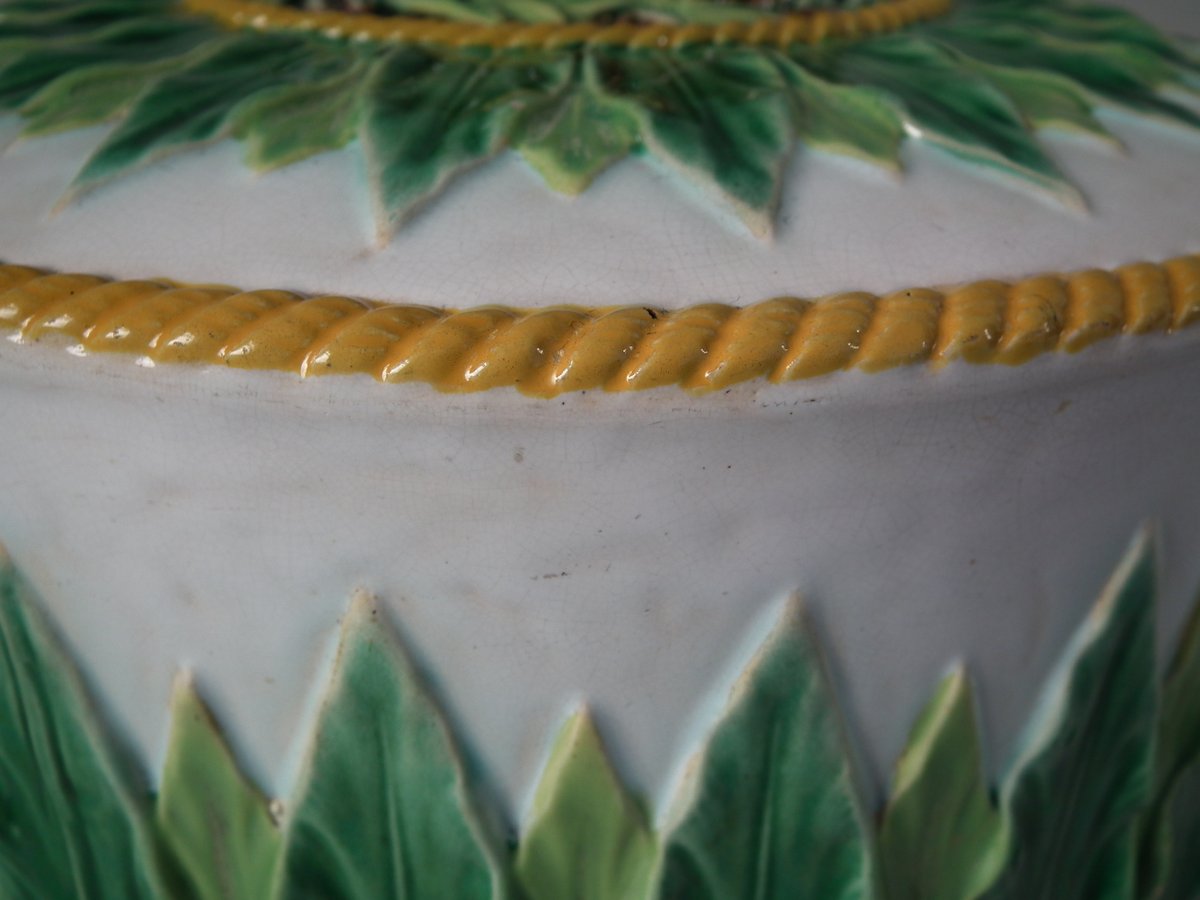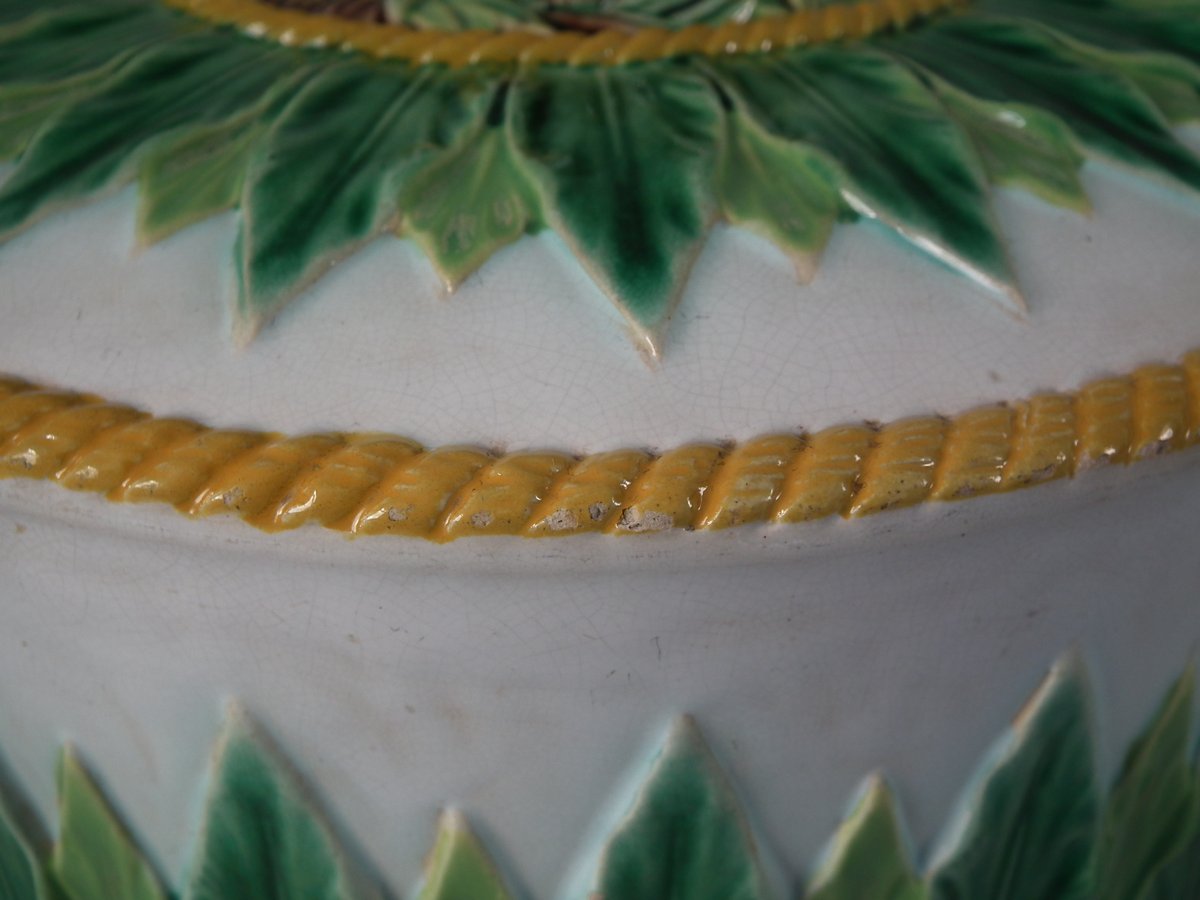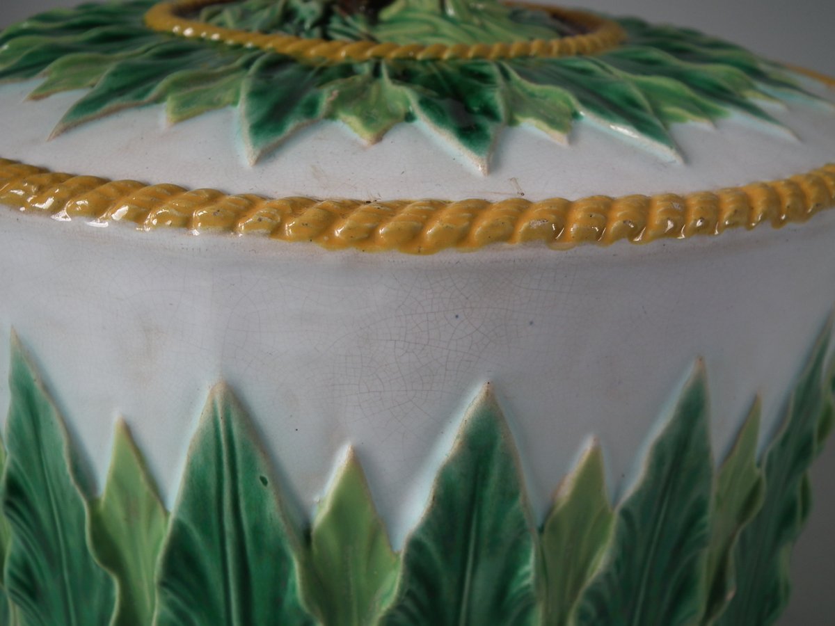 Victorian, circa 1880. 9.1ins high, 12.6ins wide, 12.6ins depth. George Jones Majolica cheese keep which features an overlapping leaf border and cow finial.
