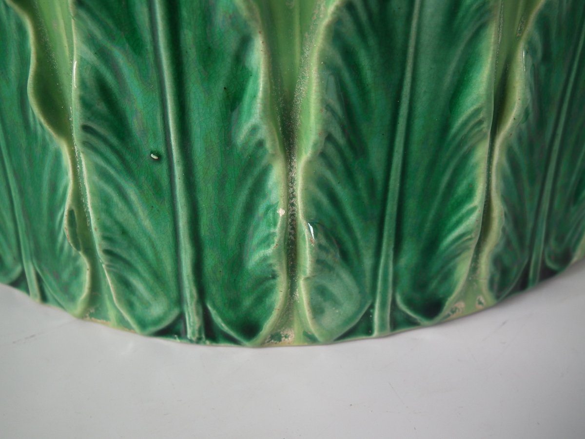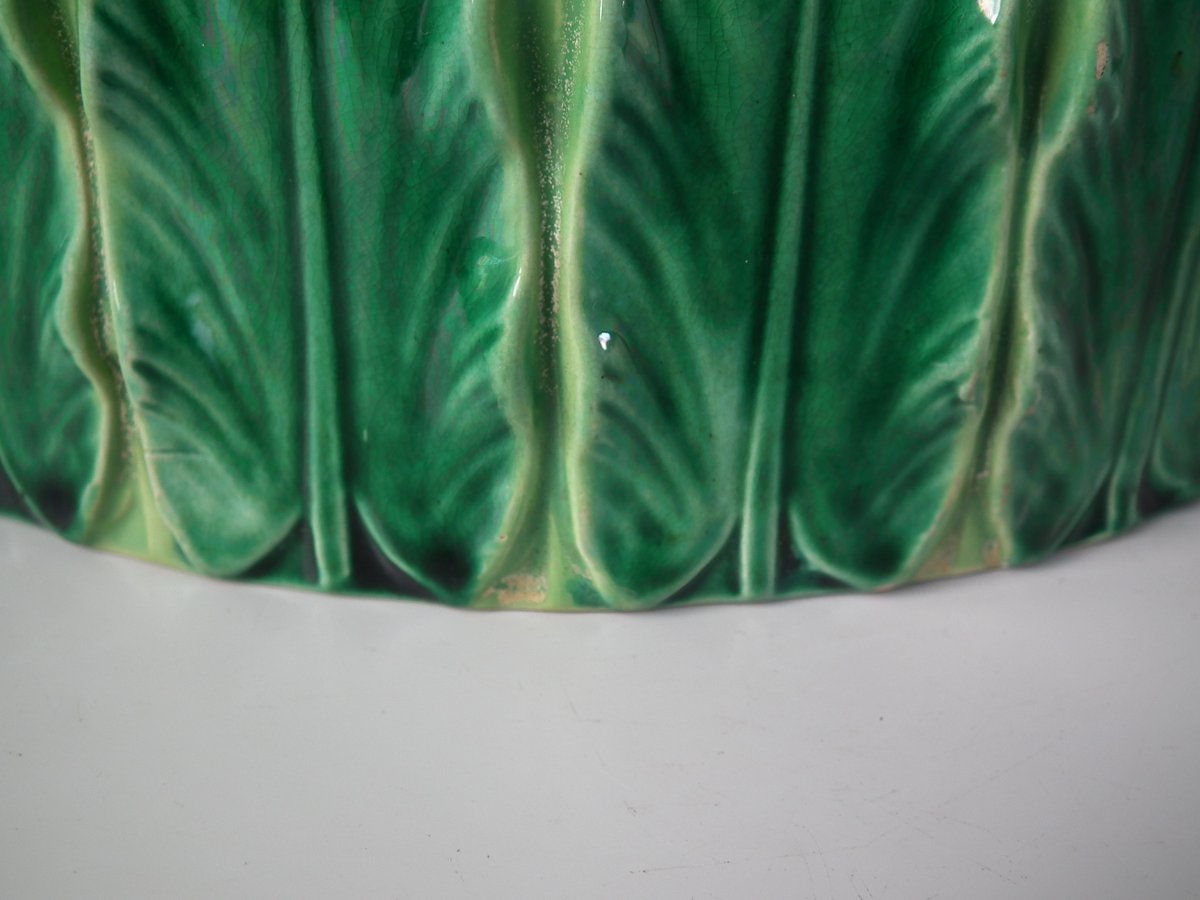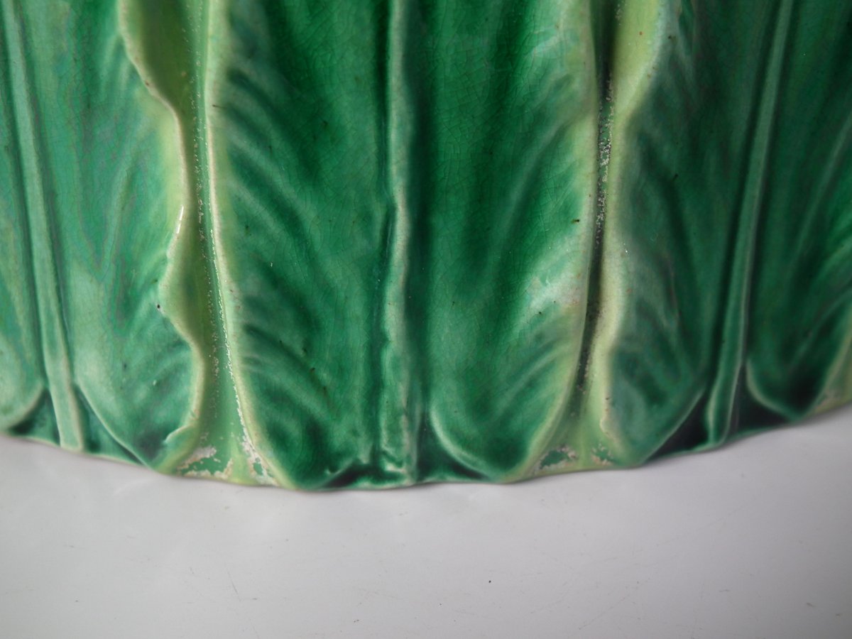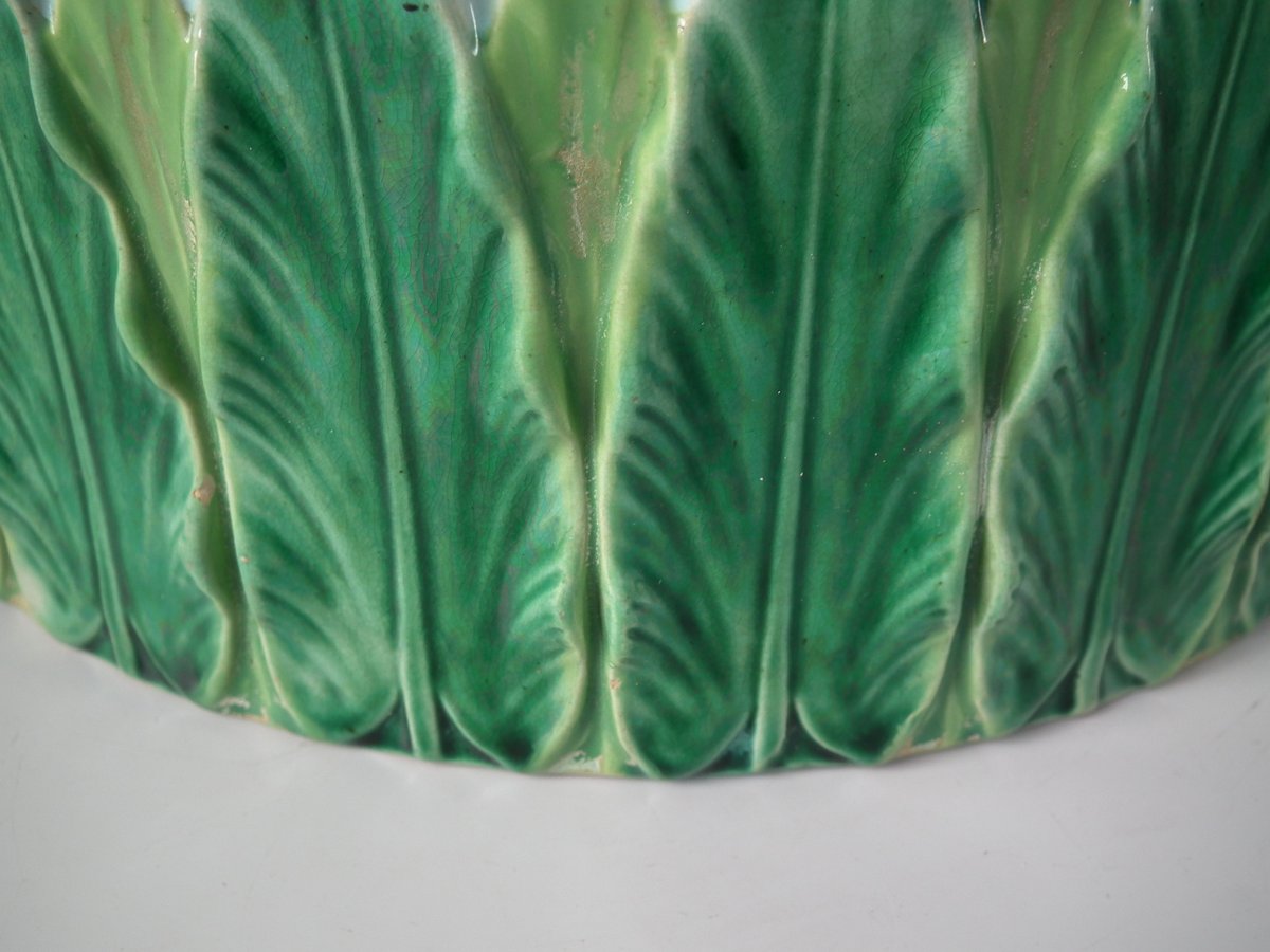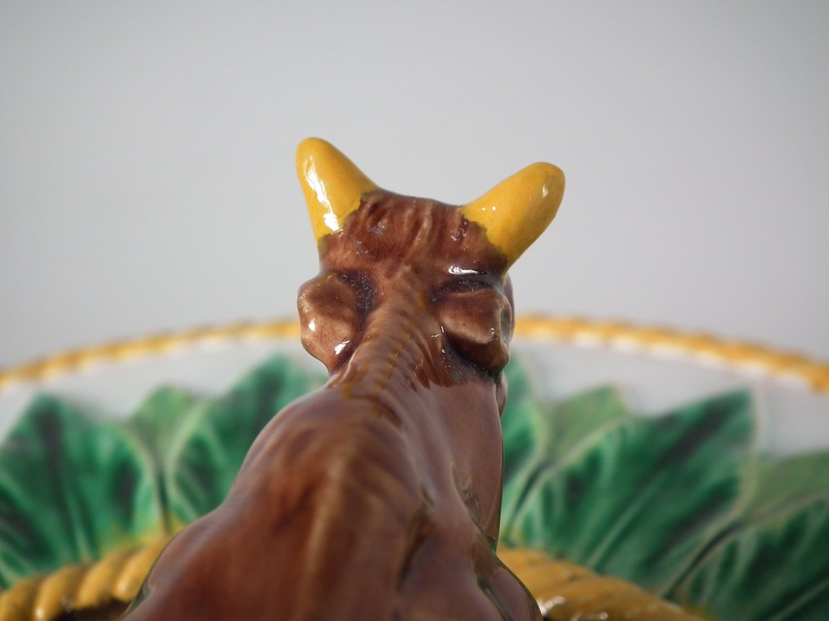 Victorian, circa 1880. 9.1ins high, 12.6ins wide, 12.6ins depth. George Jones Majolica cheese keep which features an overlapping leaf border and cow finial.