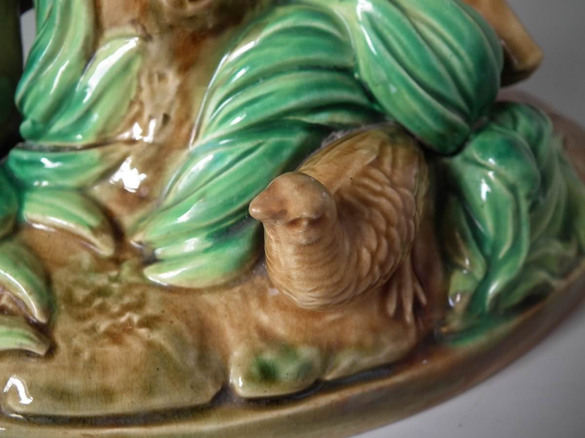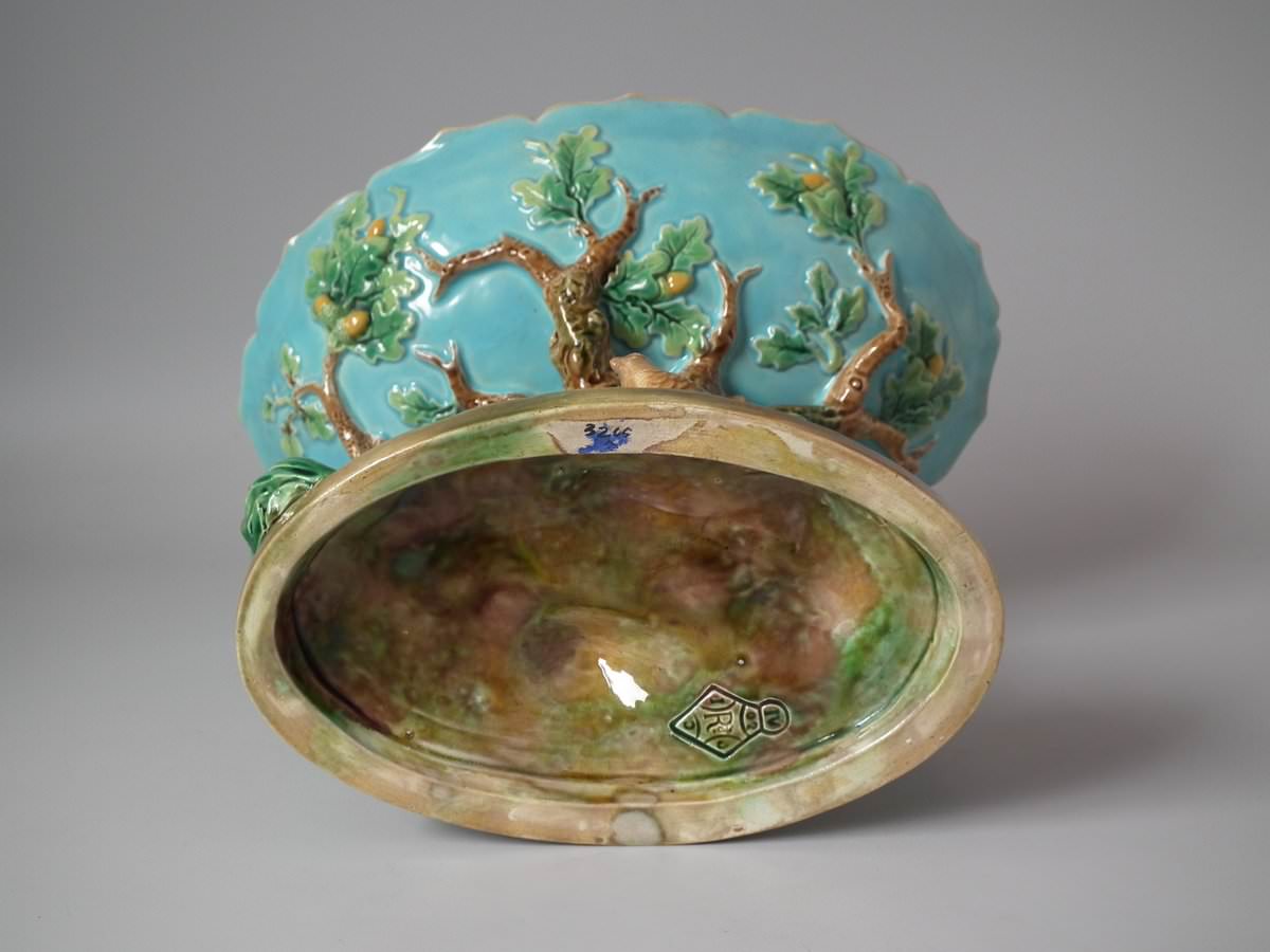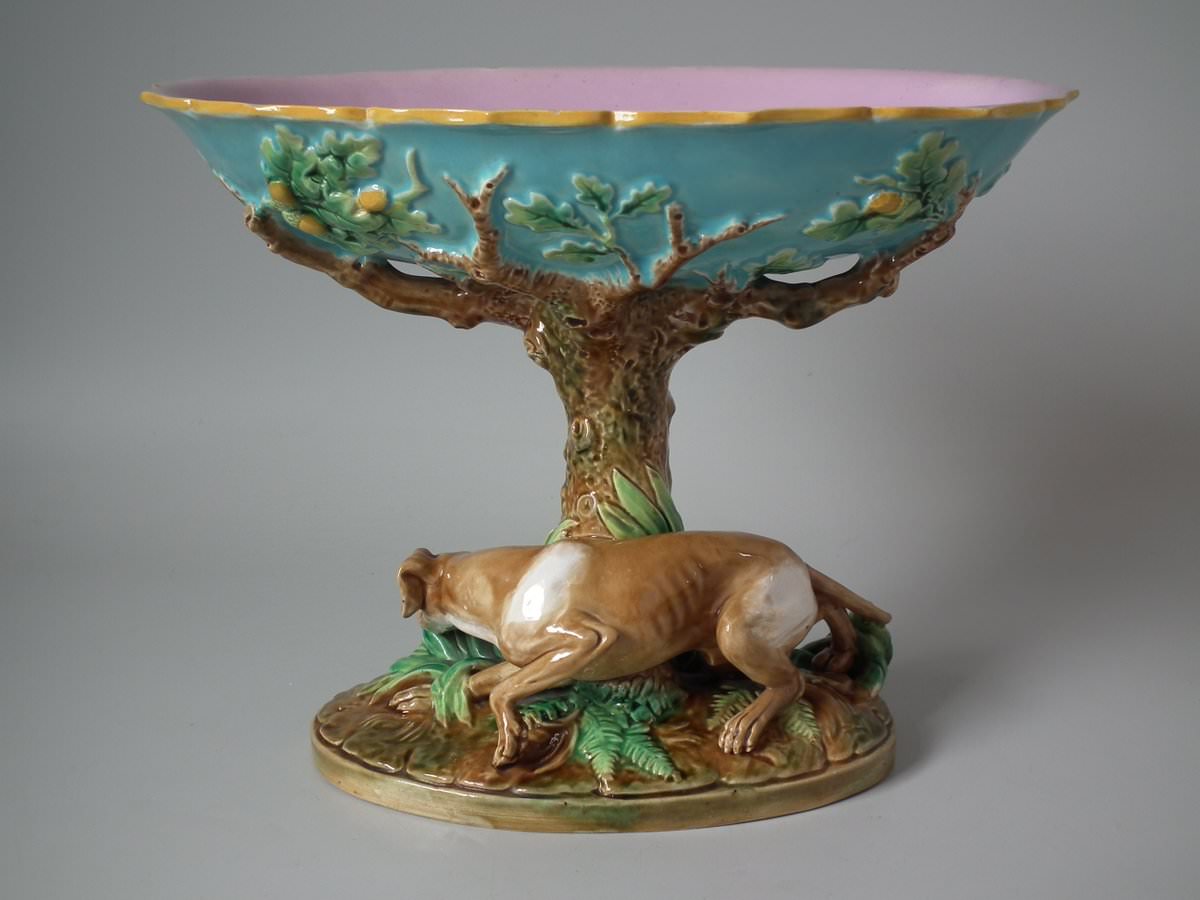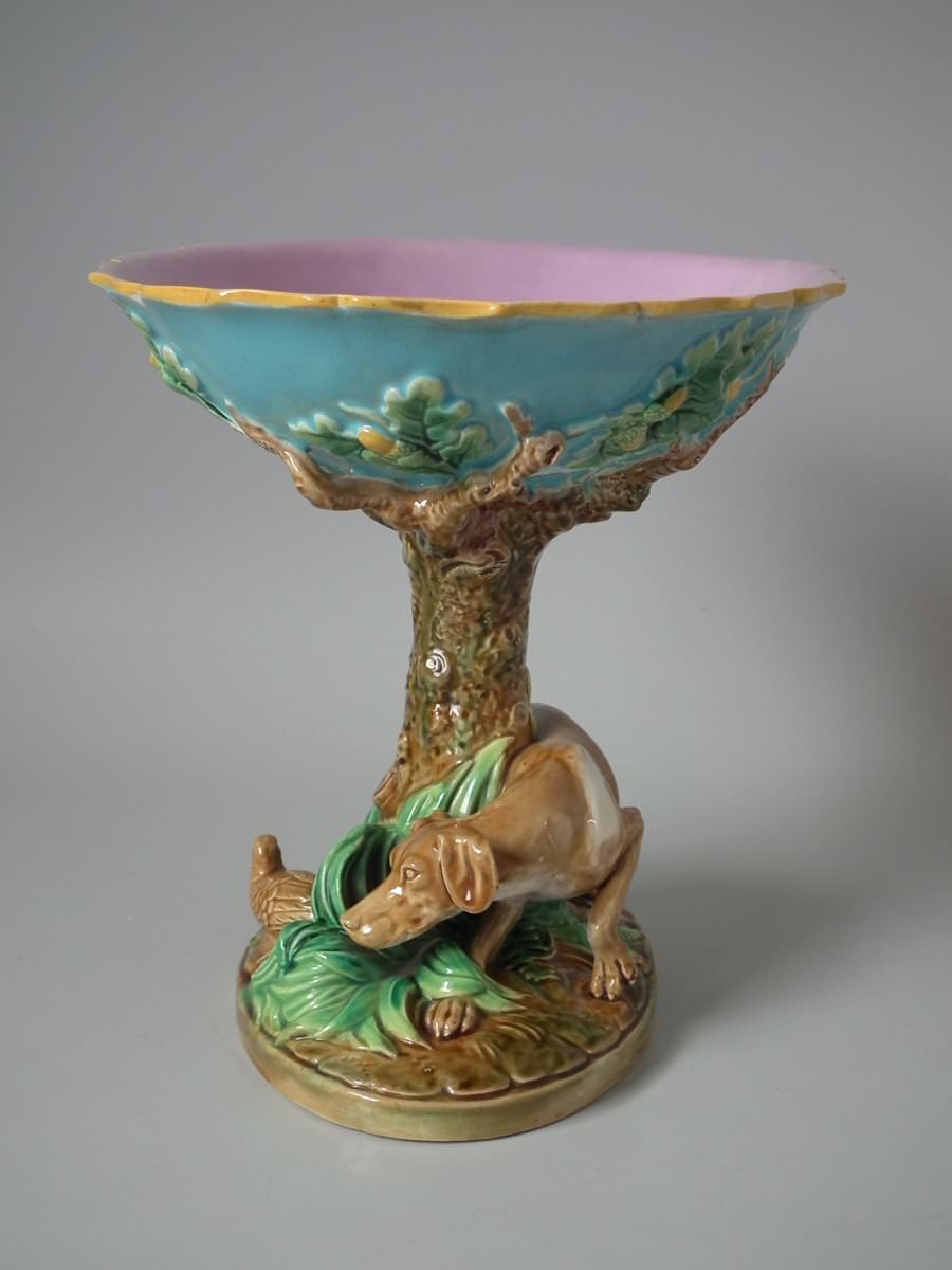 Victorian, circa 1870. 7.9ins high, 10.2ins wide, 7.5ins depth. George Jones Majolica compote which features a pointer stalking a bird, under an oak tree.